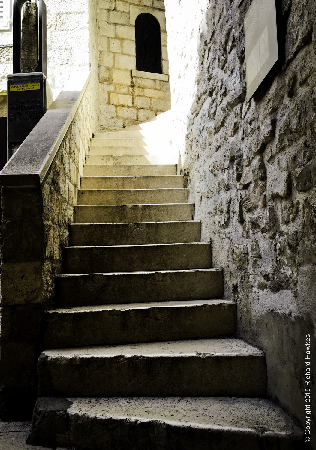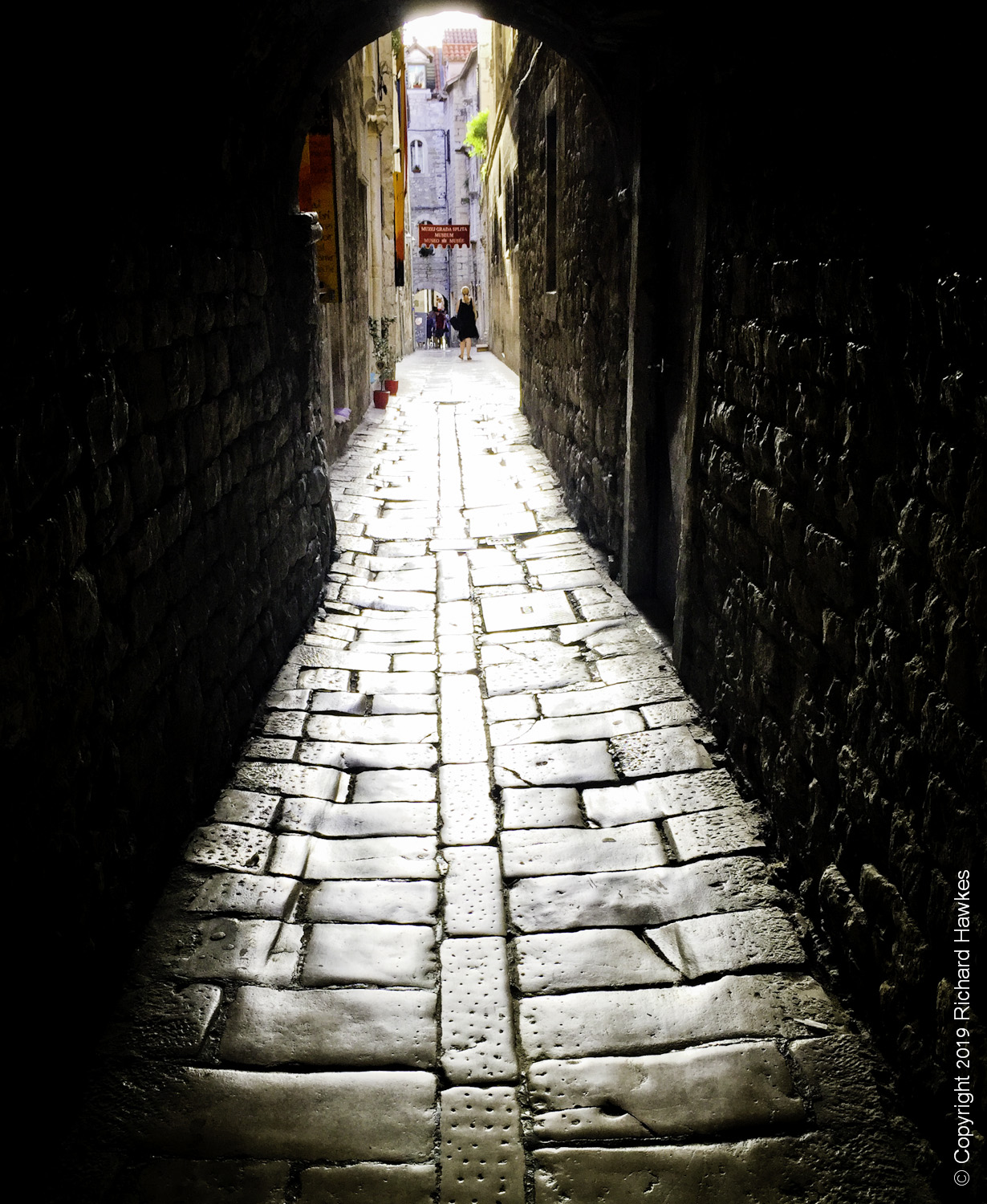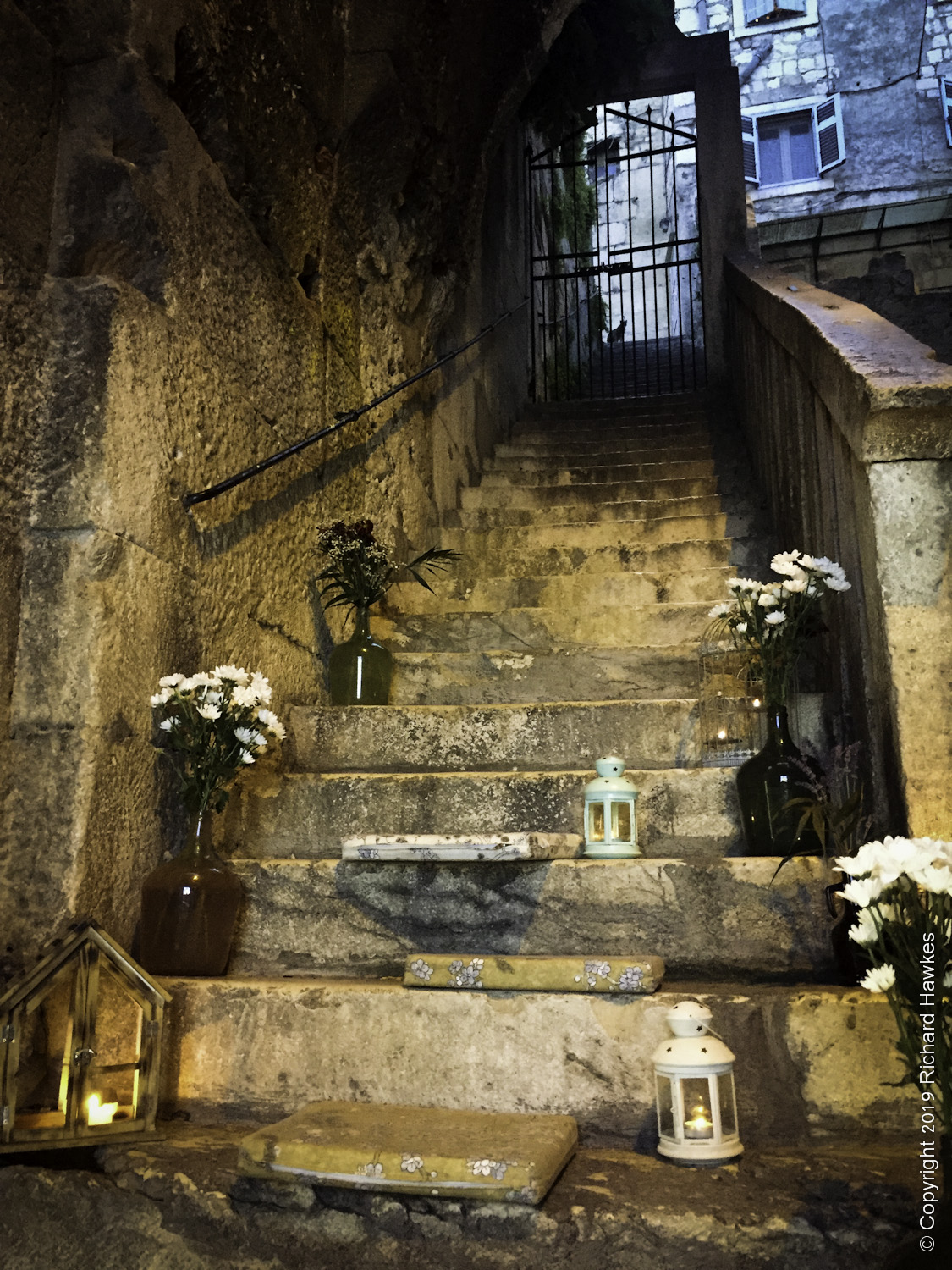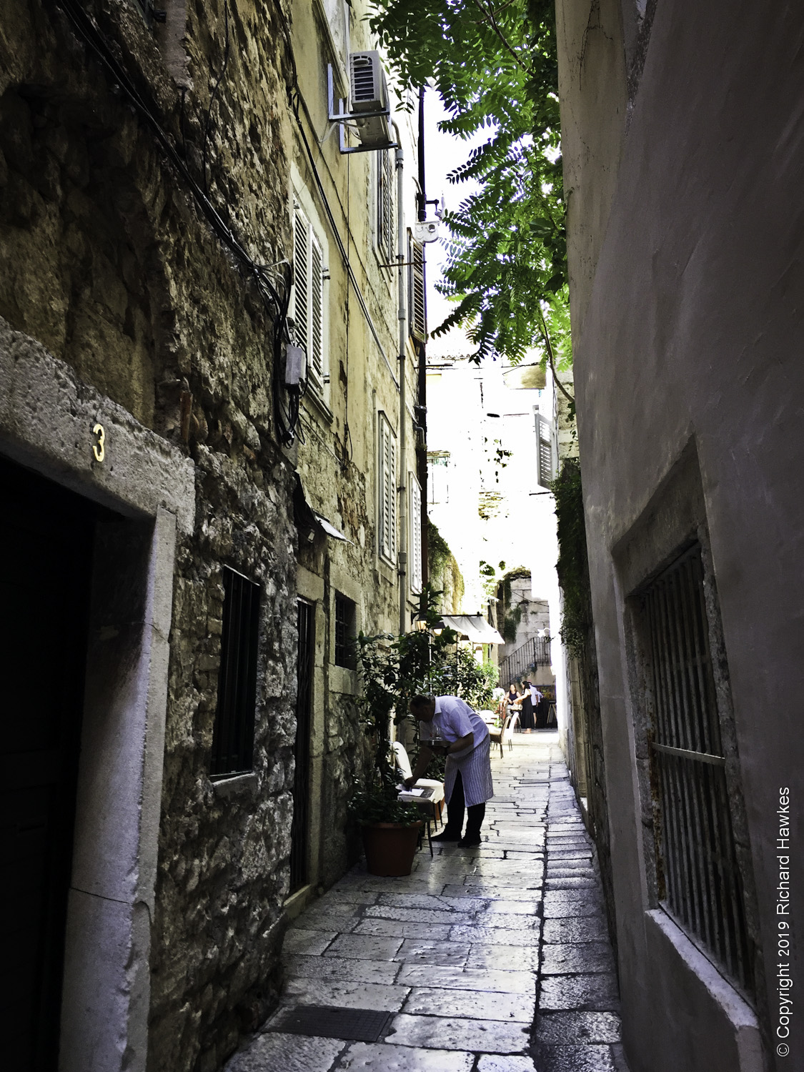 We headed out again after dark. Having dinner on the last night in narrow stone streets was a pretty decent experience. We were at a restaurant that served modern, Croatian cuisine; I had to take their word for it. The place was called Mazzgoon and the food was excellent. The street was narrow, with awesome old stone features running up and down and over it.