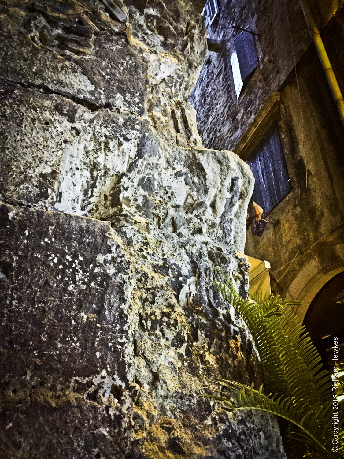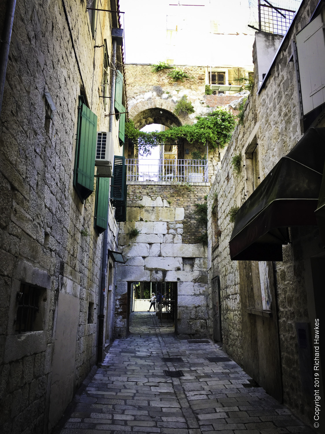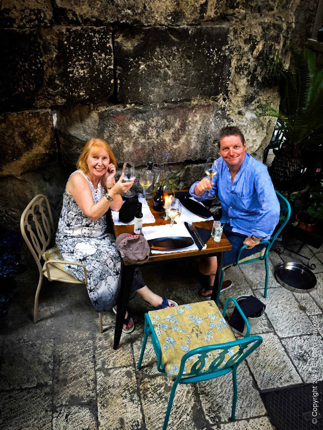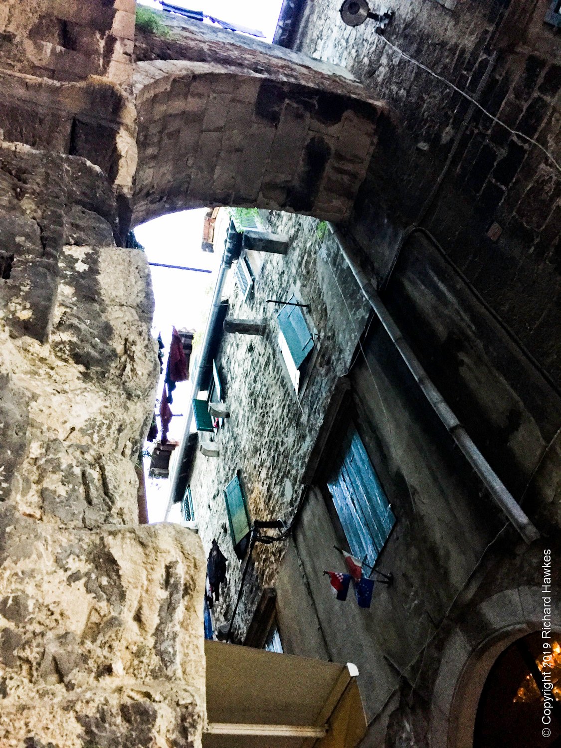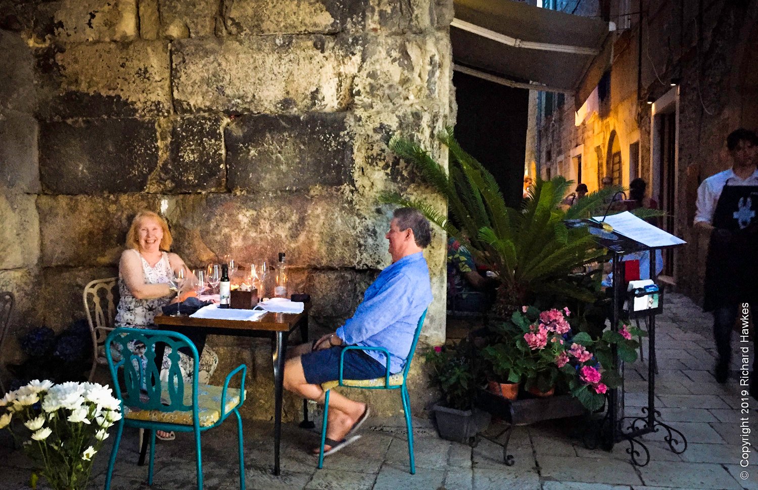 We headed out again after dark. Having dinner on the last night in narrow stone streets was a pretty decent experience. We were at a restaurant that served modern, Croatian cuisine; I had to take their word for it. The place was called Mazzgoon and the food was excellent. The street was narrow, with awesome old stone features running up and down and over it.