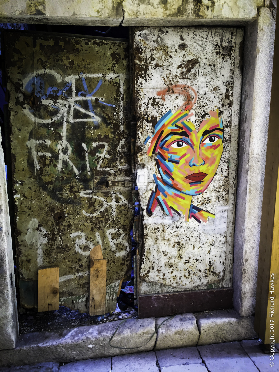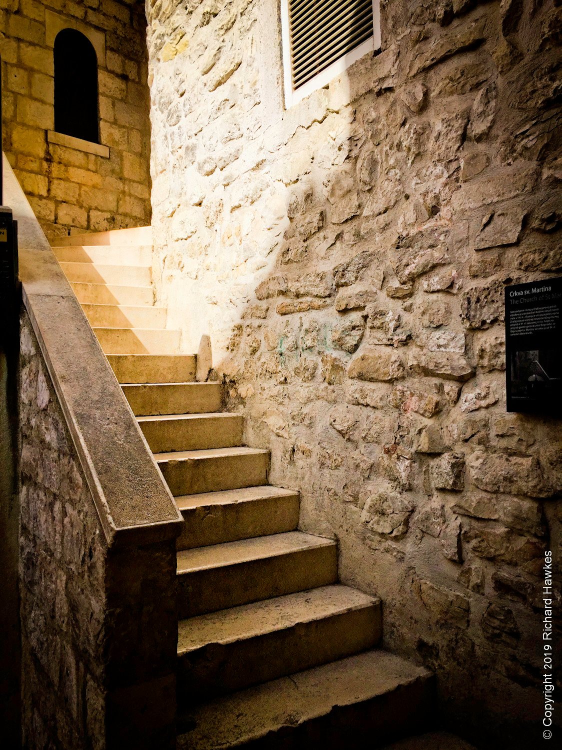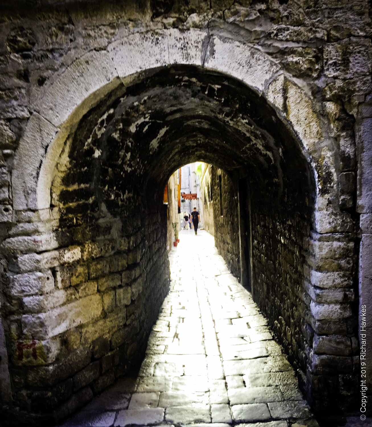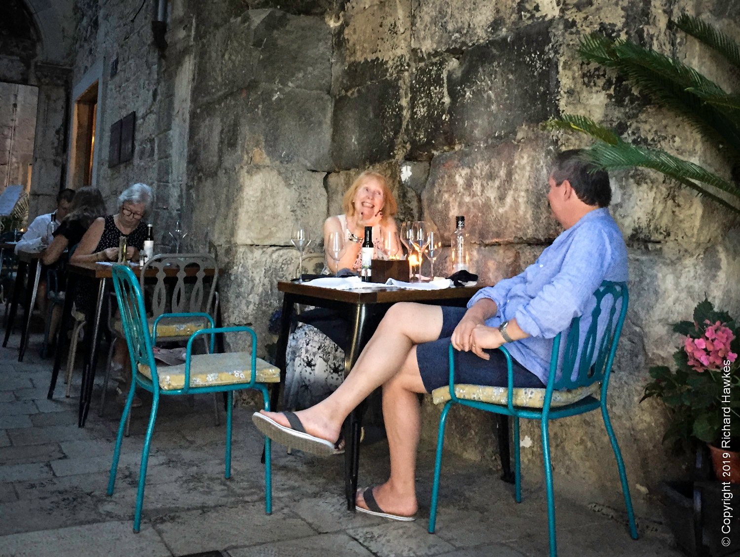 We headed out again after dark. Having dinner on the last night in narrow stone streets was a pretty decent experience. We were at a restaurant that served modern, Croatian cuisine; I had to take their word for it. The place was called Mazzgoon and the food was excellent. The street was narrow, with awesome old stone features running up and down and over it.