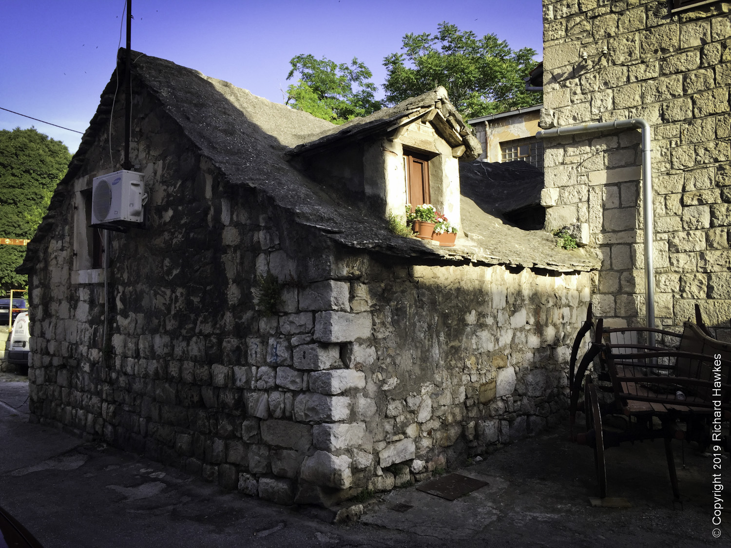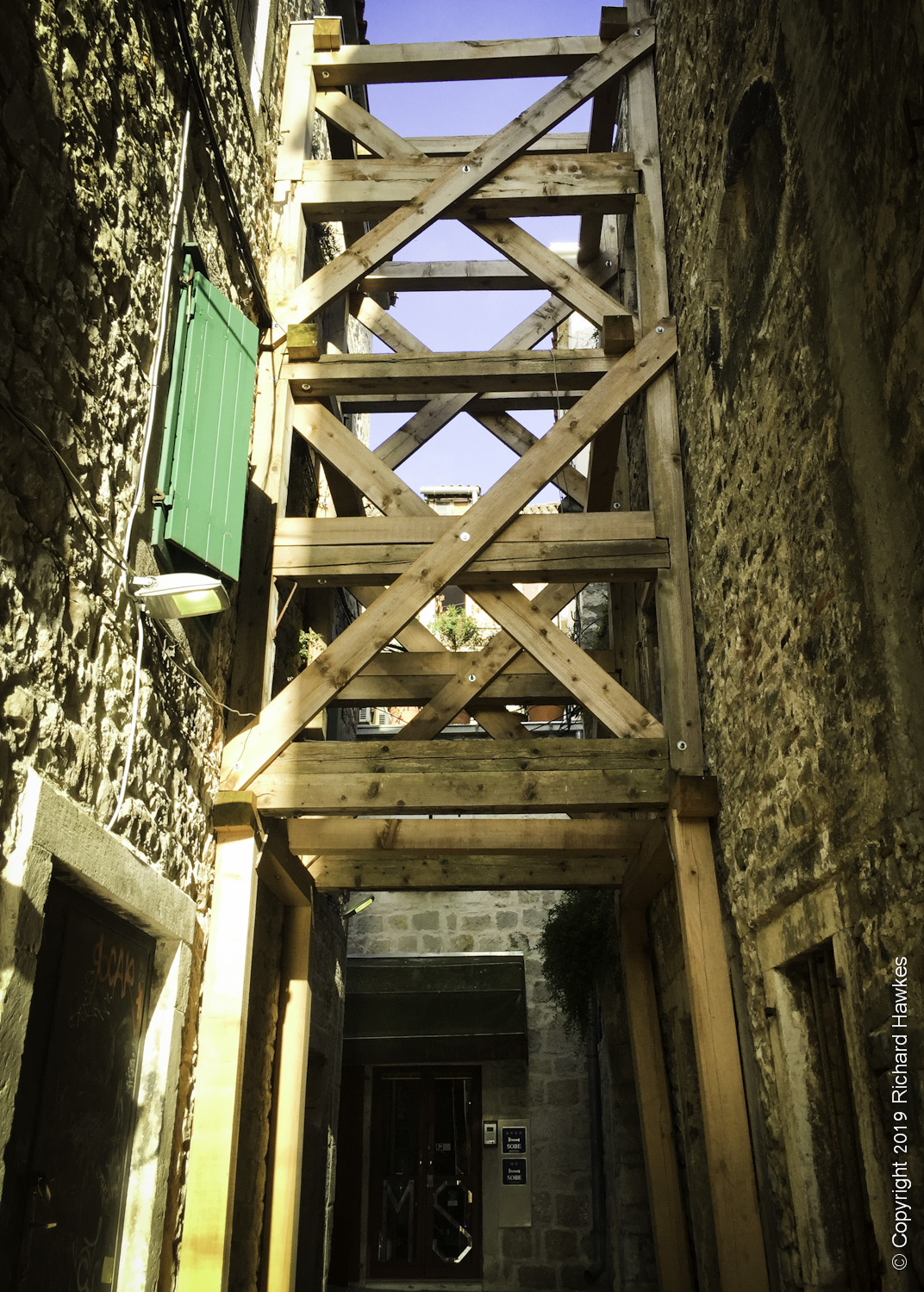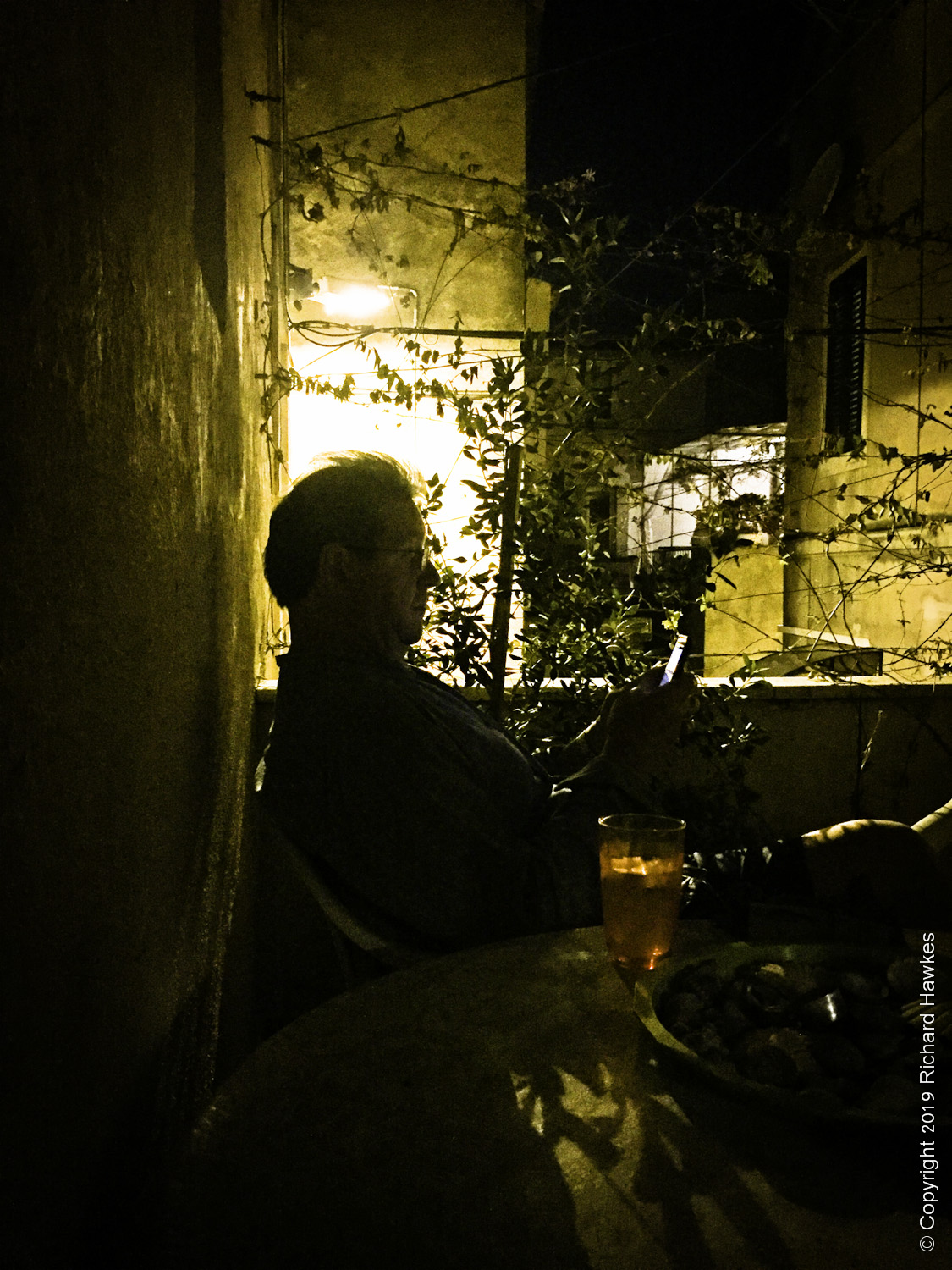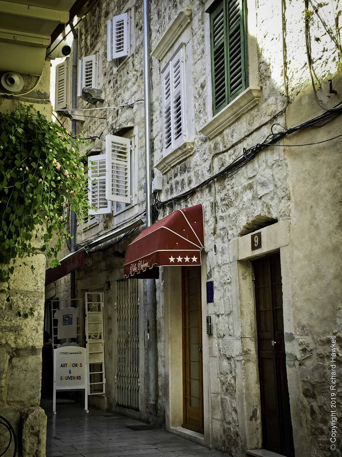 We headed out again after dark. Having dinner on the last night in narrow stone streets was a pretty decent experience. We were at a restaurant that served modern, Croatian cuisine; I had to take their word for it. The place was called Mazzgoon and the food was excellent. The street was narrow, with awesome old stone features running up and down and over it.