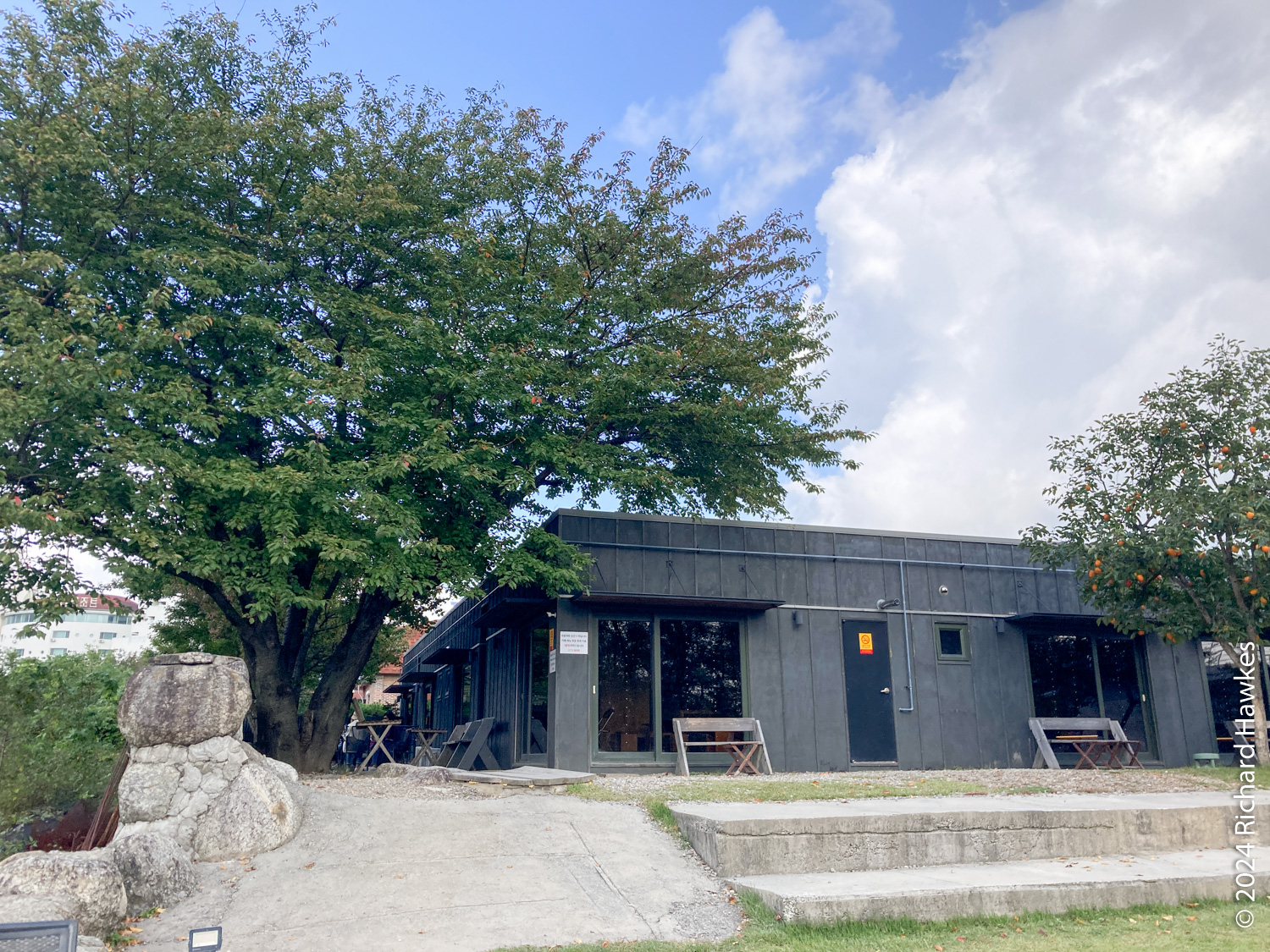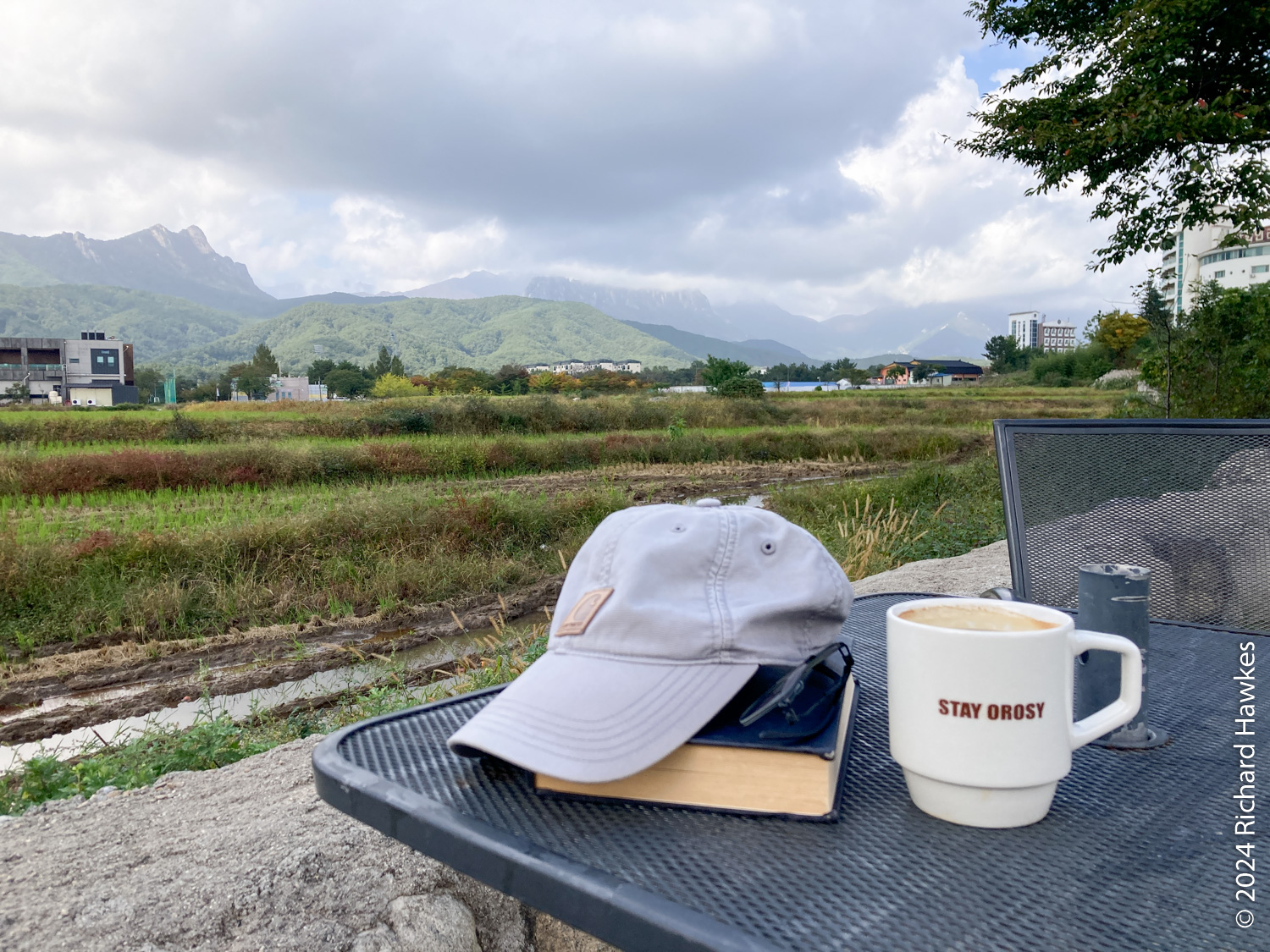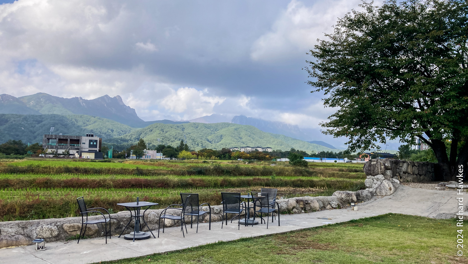 The Stay Orosy cafe (스테이 오롯이) used to be some accommodation (my guess) and now it’s a multi-room cafe with a nice bit of garden looking over rice fields and the mountains of Seoraksan. There’s also a little courtyard with a pool or pond in the middle. It was next to the Pine Resort I’d just checked out, so not far from the spa. It was peaceful too, only a few people there. I sat in the garden area for a while enjoying the view.