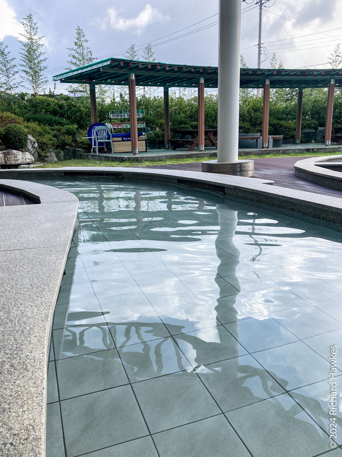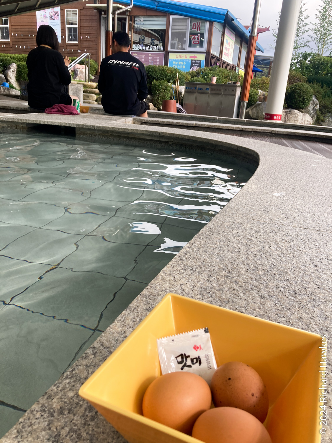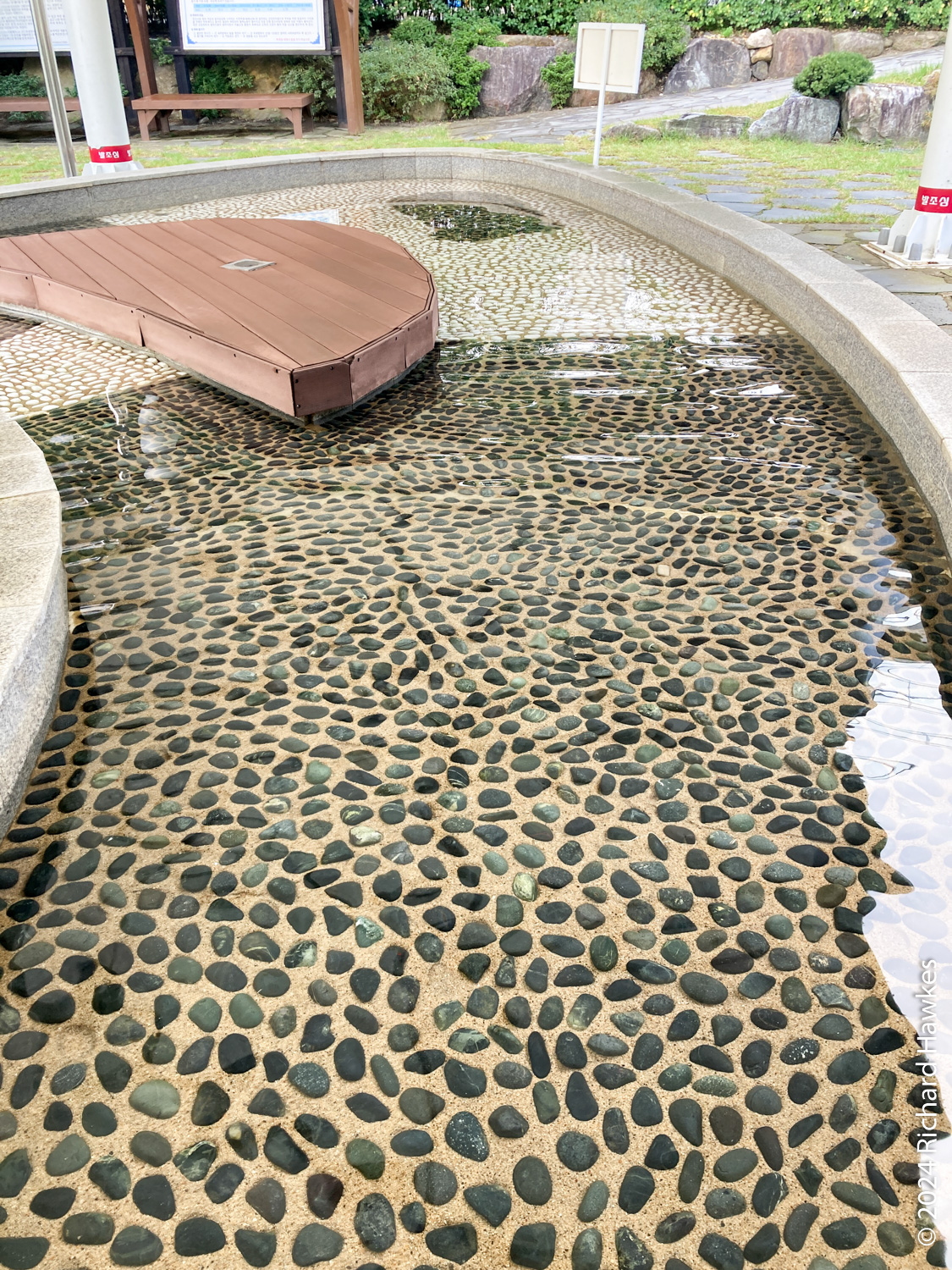 A few minute’s drive from the Pine Resort is Cheoksan Foot Bath Park (jokyuk gongwon 척산족욕공원), a free, community, foot spa. It’s built next to an overpass, so not the most scenic location! However, it’s very nice nonetheless. You just walk in, wash your feet, then sit and soak your feet. You can rent towels and pads to sit on. There are also snacks and coffees for sale. Only the central pool was heated; the out pool was lined with pebbles to give your feet a massage as you walk around, but the water inside wasn’t heated. I sat in the heated section with two or three other people. It was very relaxing. I particularly like the sign mentioning “keep your kids quiet” nicely worded as “Other people’s relaxation is as important as your child’s memories”! Very smooth. Because it was free and I wasn’t renting towels, I got some boiled eggs to eat while soaking my feet. It was the least I could do.