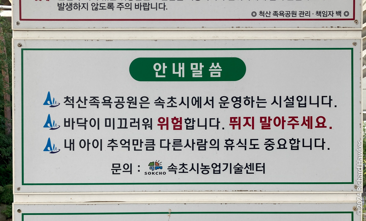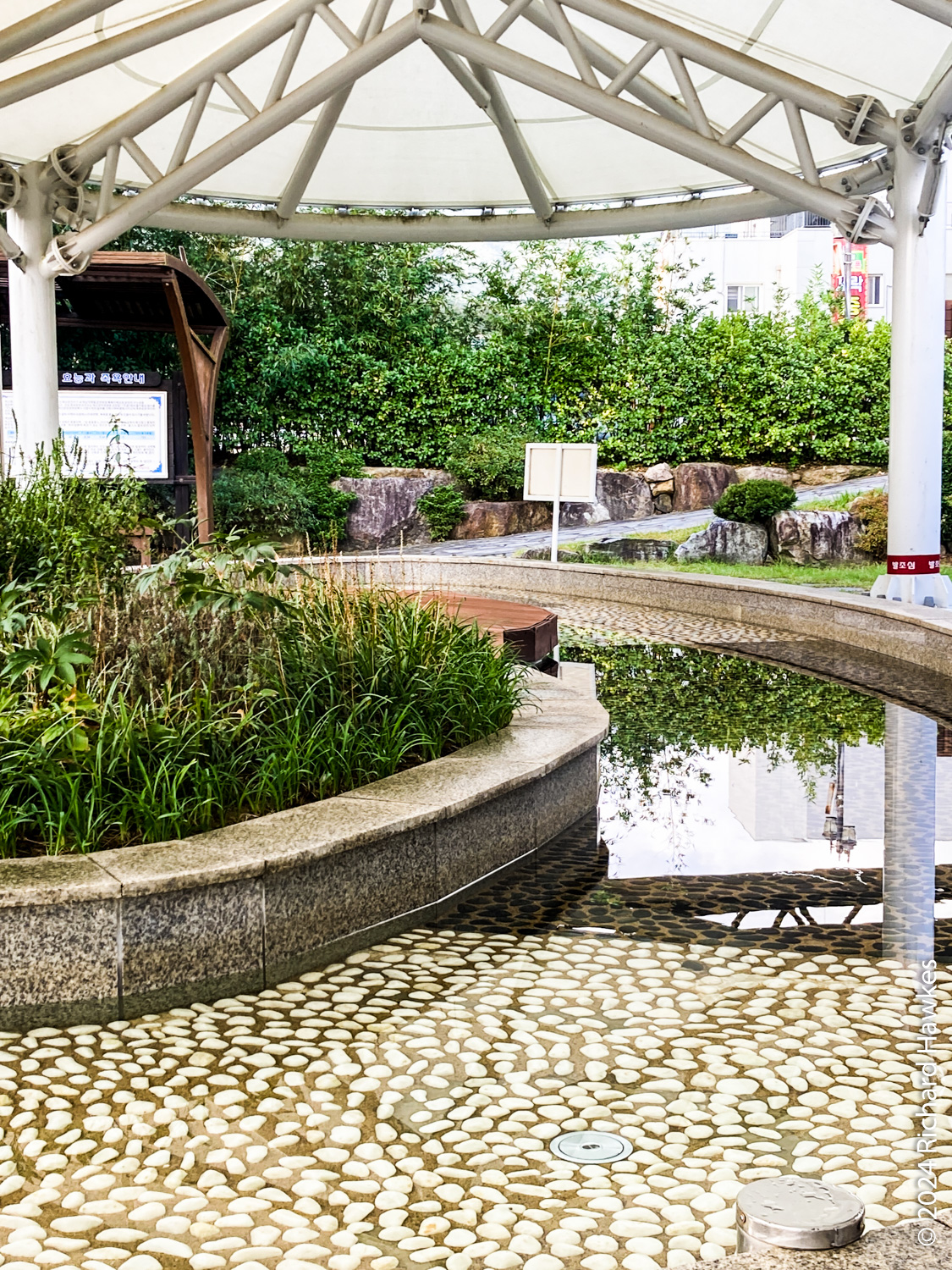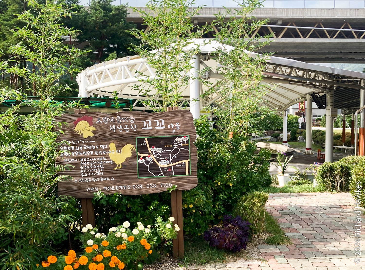 A few minute’s drive from the Pine Resort is Cheoksan Foot Bath Park (jokyuk gongwon 척산족욕공원), a free, community, foot spa. It’s built next to an overpass, so not the most scenic location! However, it’s very nice nonetheless. You just walk in, wash your feet, then sit and soak your feet. You can rent towels and pads to sit on. There are also snacks and coffees for sale. Only the central pool was heated; the out pool was lined with pebbles to give your feet a massage as you walk around, but the water inside wasn’t heated. I sat in the heated section with two or three other people. It was very relaxing. I particularly like the sign mentioning “keep your kids quiet” nicely worded as “Other people’s relaxation is as important as your child’s memories”! Very smooth. Because it was free and I wasn’t renting towels, I got some boiled eggs to eat while soaking my feet. It was the least I could do.