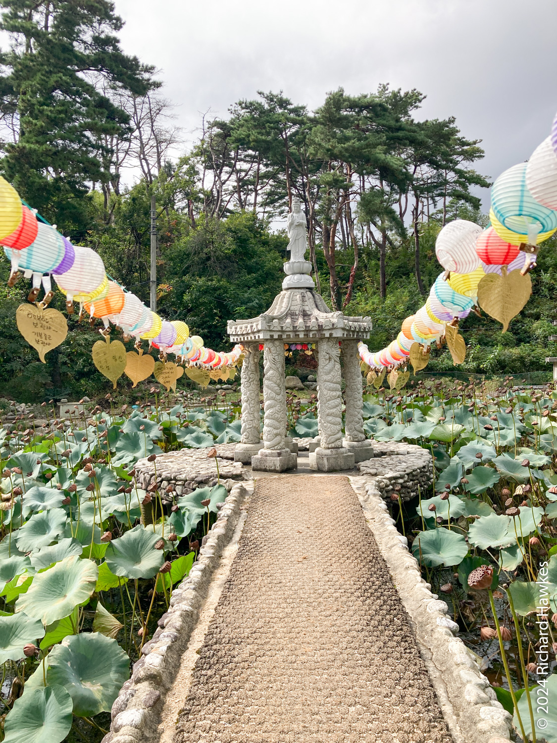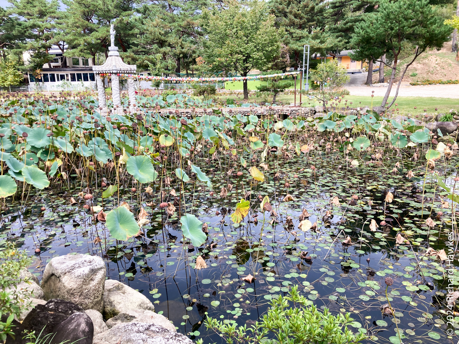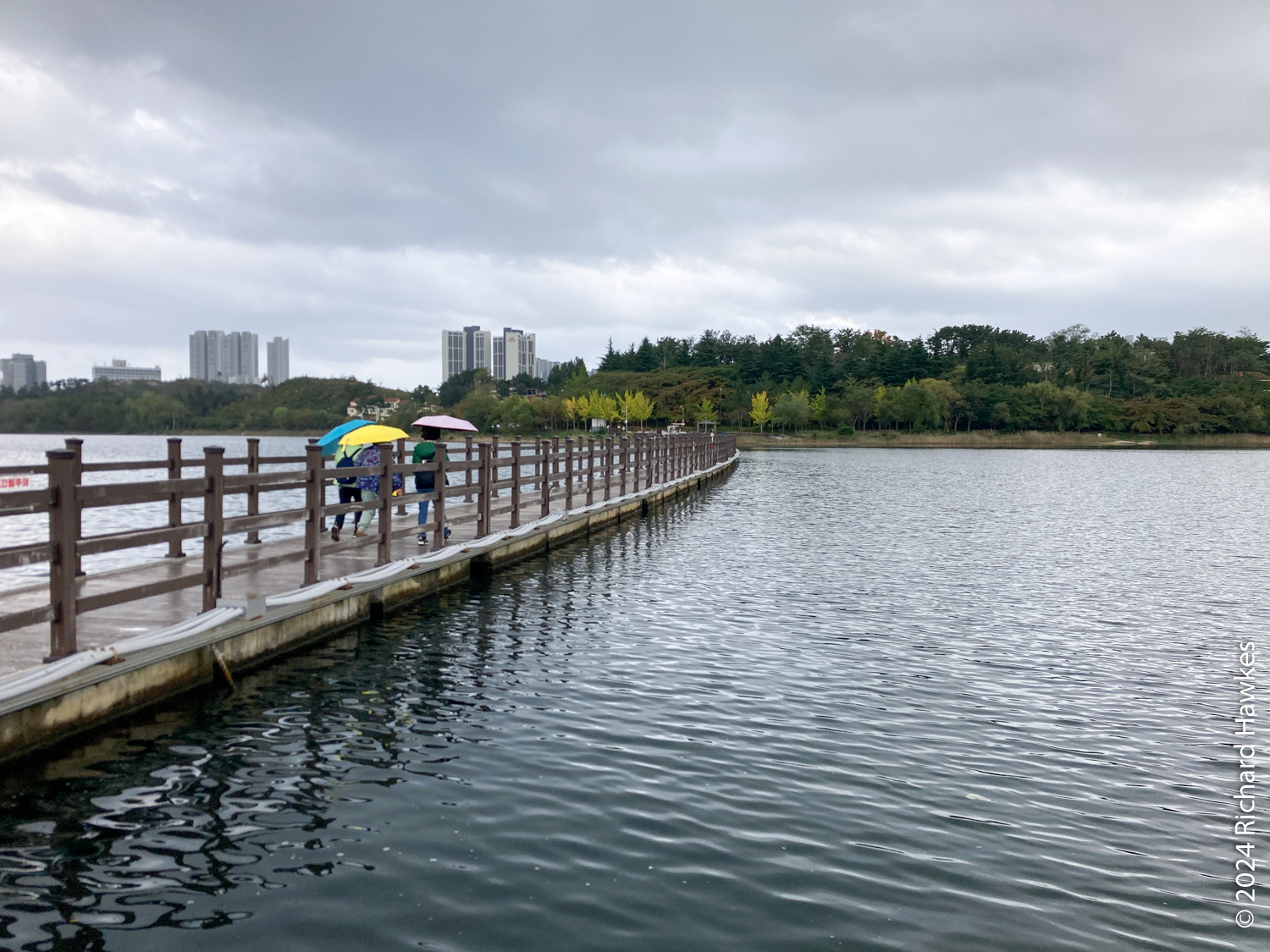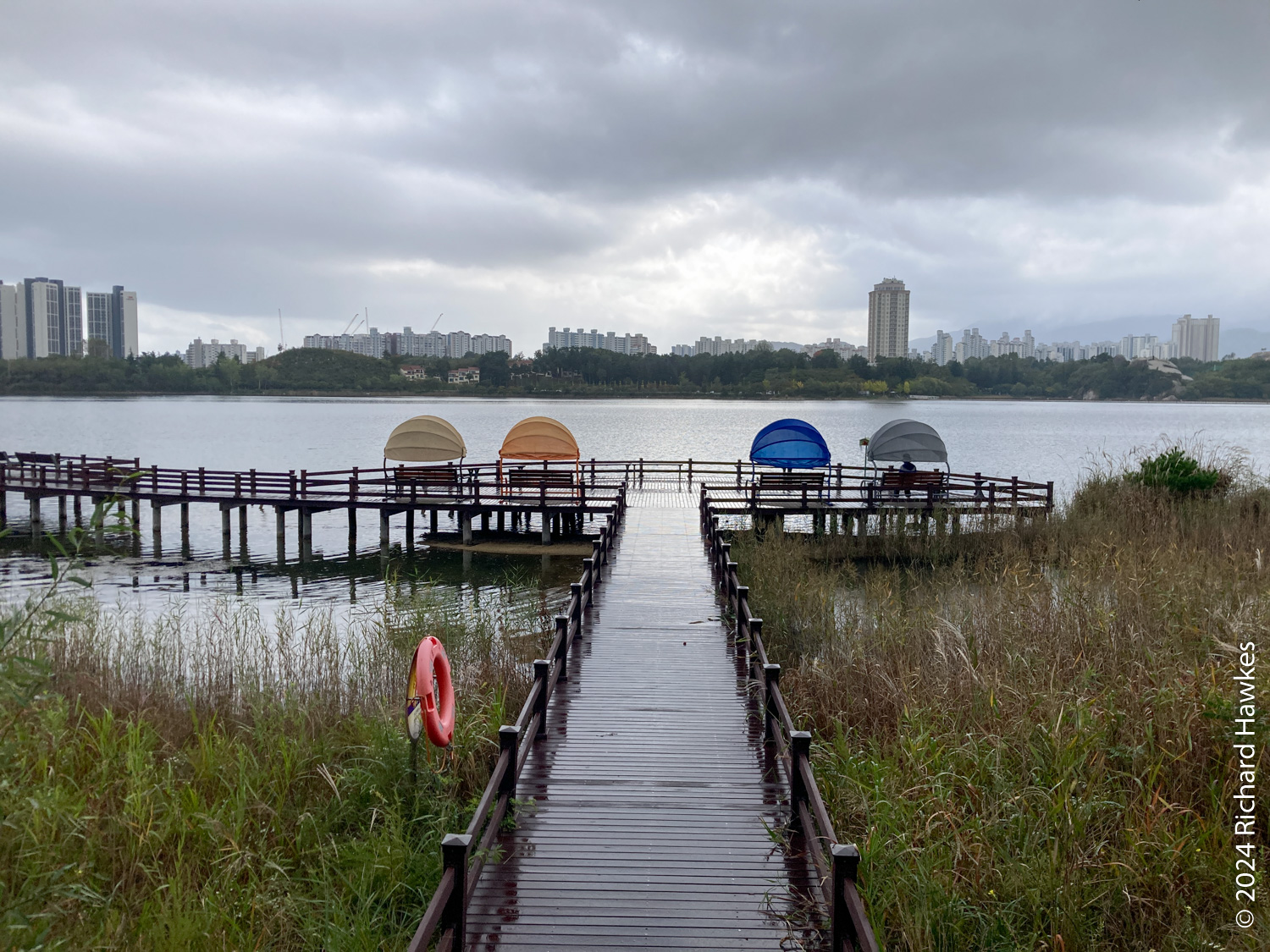 Next to the temple is a mini-golf course and a restaurant; I went to the restaurant (Como, 꼬모) and had pork cutlet. I then walked a little way to the lake and about 100 metres along the path. I realised that the other side had access to the pontoon bridge, so got the car and drove round the the northern side to a large, free carpark. The promised rain was beginning to show as I walked (anti-clockwise) along the road. In the trees beside the road were a number of brick houses and bungalows. They weren’t in use and in various states of disrepair, but in essence were really nice looking lake-side properties. I imagine they were vacation houses but I couldn’t see any signage indicating that, or if the place was about to be redeveloped.