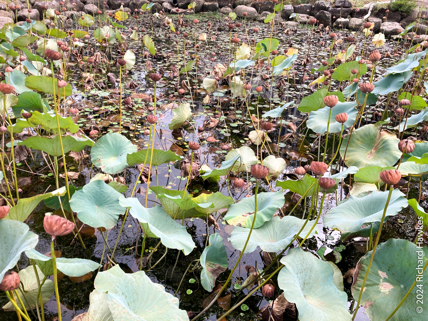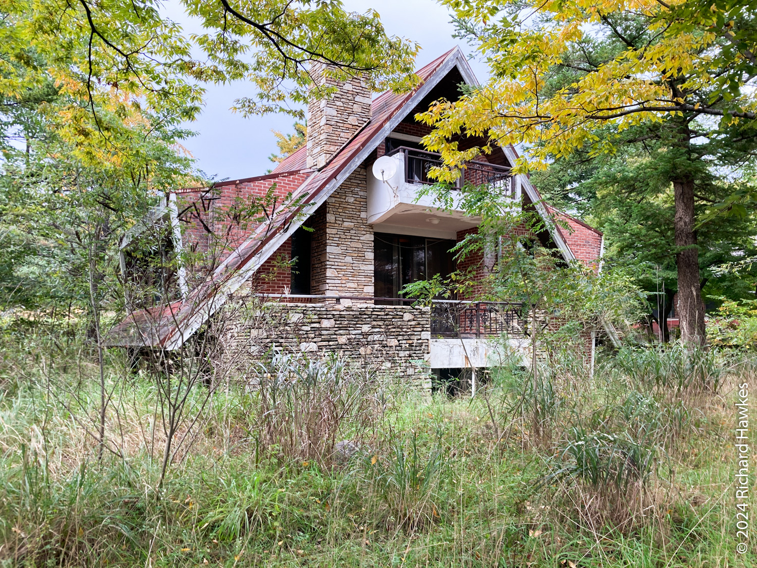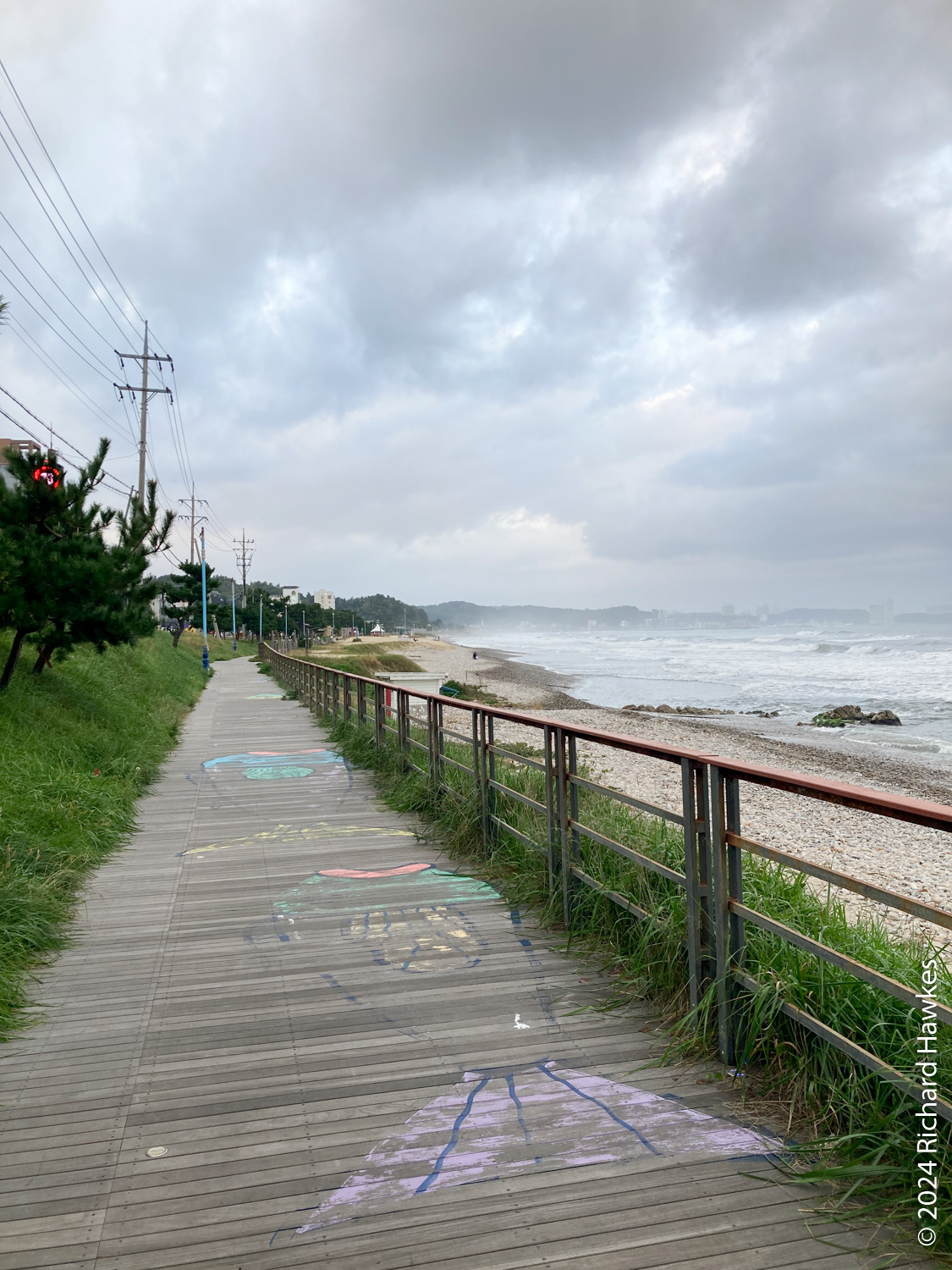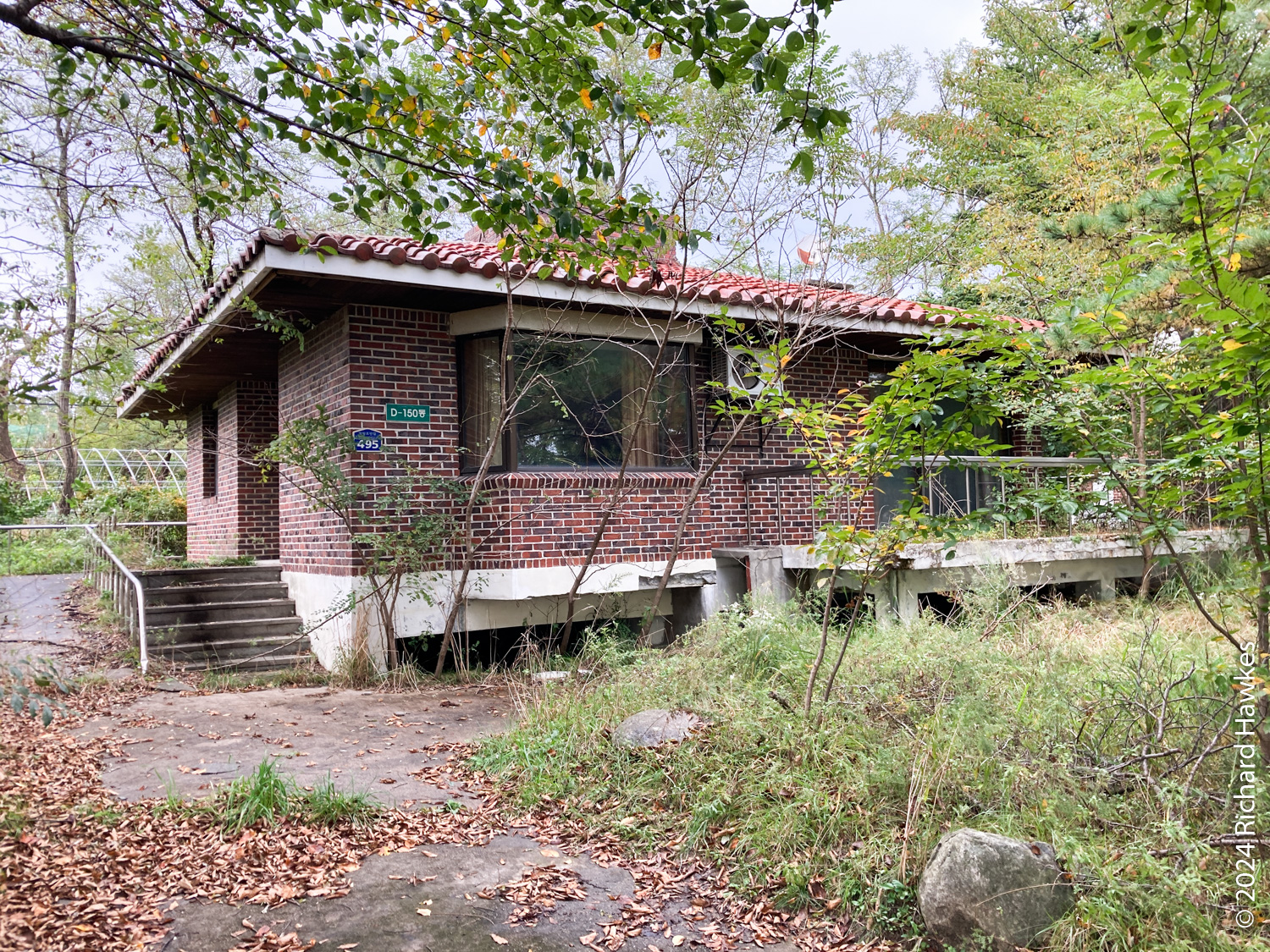 Next to the temple is a mini-golf course and a restaurant; I went to the restaurant (Como, 꼬모) and had pork cutlet. I then walked a little way to the lake and about 100 metres along the path. I realised that the other side had access to the pontoon bridge, so got the car and drove round the the northern side to a large, free carpark. The promised rain was beginning to show as I walked (anti-clockwise) along the road. In the trees beside the road were a number of brick houses and bungalows. They weren’t in use and in various states of disrepair, but in essence were really nice looking lake-side properties. I imagine they were vacation houses but I couldn’t see any signage indicating that, or if the place was about to be redeveloped.