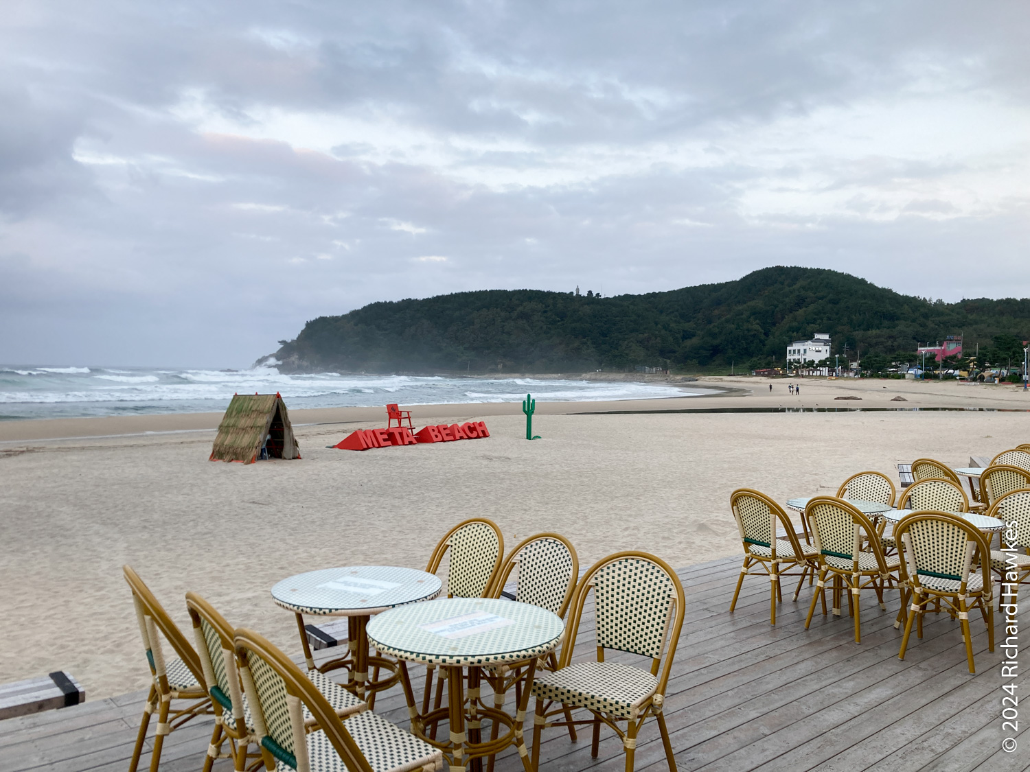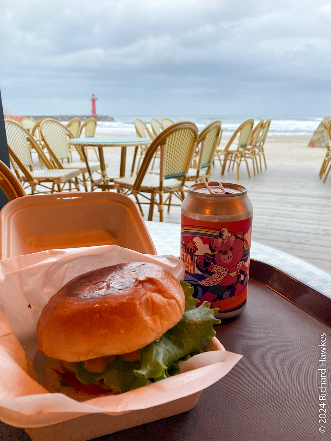 The Benikea Hotel is next to the sea on a very busy main road. Gareth and I had cycled this exact route. I parked up, checked in, rested, then thought about dinner. The room was nice and had a great view of the beach. Obviously being next to the main road, it wasn’t peaceful at all! I took a pleasant twenty-minute walk south along the beach path to a beach restaurant called Meta Beach on Seorak Beach (설악해수욕장). I was the only customer! I got a burger and beer and sat next to the open doors looking over the sandy beach and sea as it got dark. Good burger and beer.