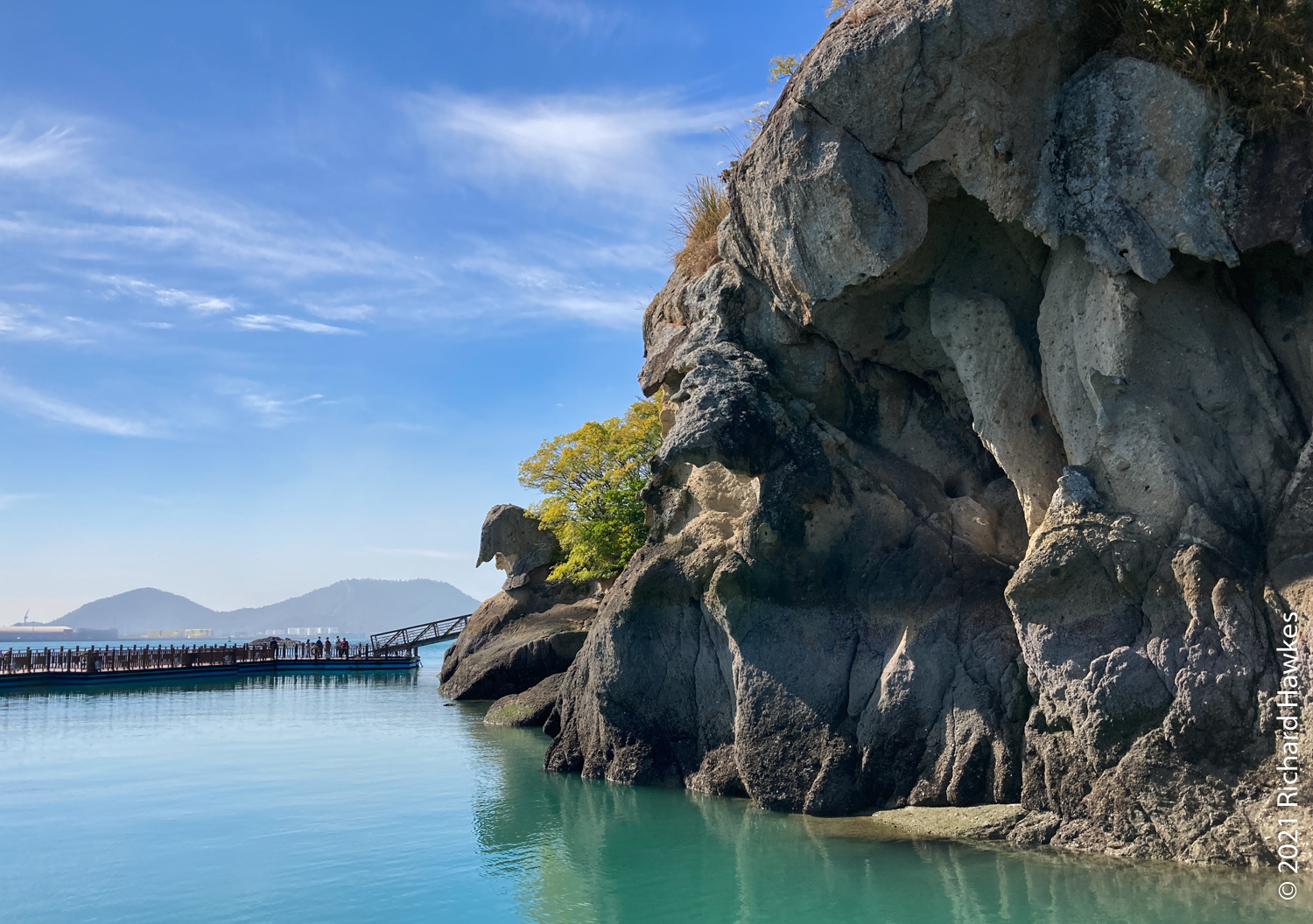 I got a bus to the eastern part of Mokpo near where I went to the cinema the previous night to check out a local coastal rock feature called Gatbawi (갓바위) and a museum. The first stop was, of course, coffee. This coastal area and promenade is next to Dalmatchi Park (달맞이공원) and seems quite new. There are restaurants and coffee shops along the front and I stopped at Dalboardrae? or Story? coffee shop (달보드레). I sat on the terrace next door for a bit before walking west towards Gatbawi. The rock is quite interesting and it’s seen from a walkway in the sea. After that I went up the hill behind and above it.