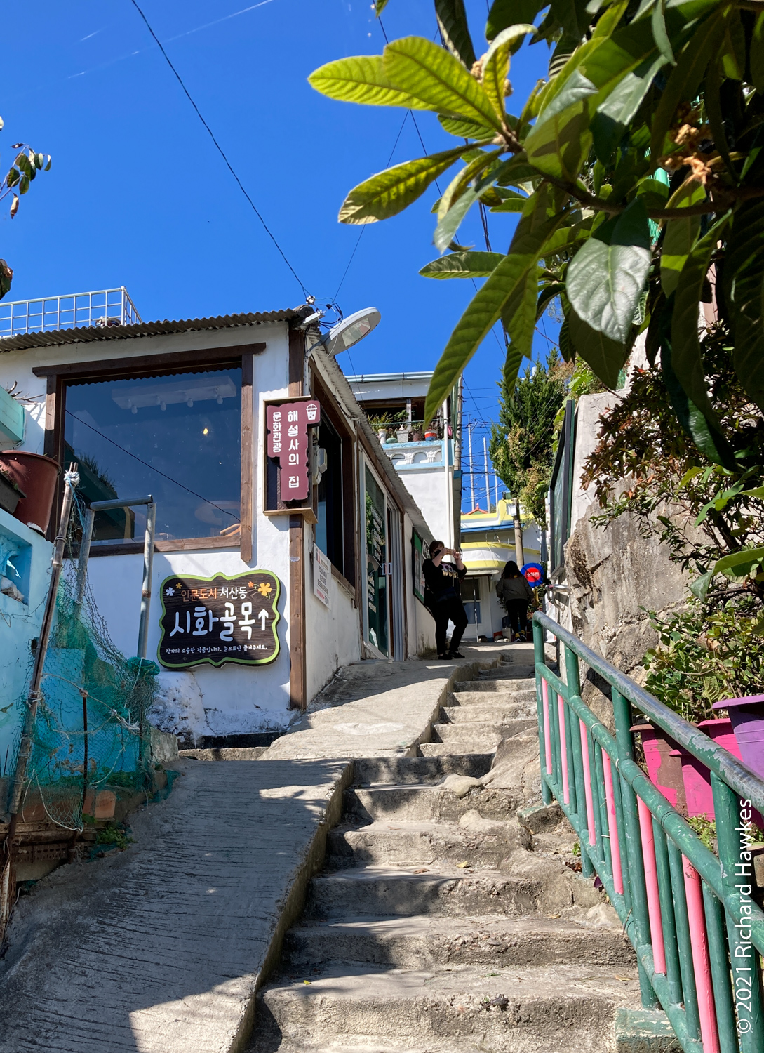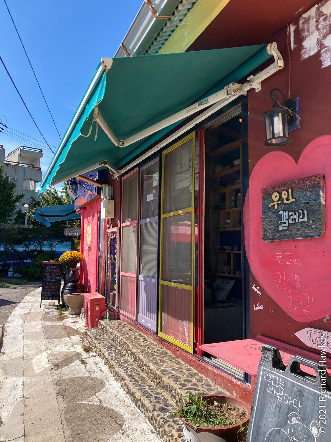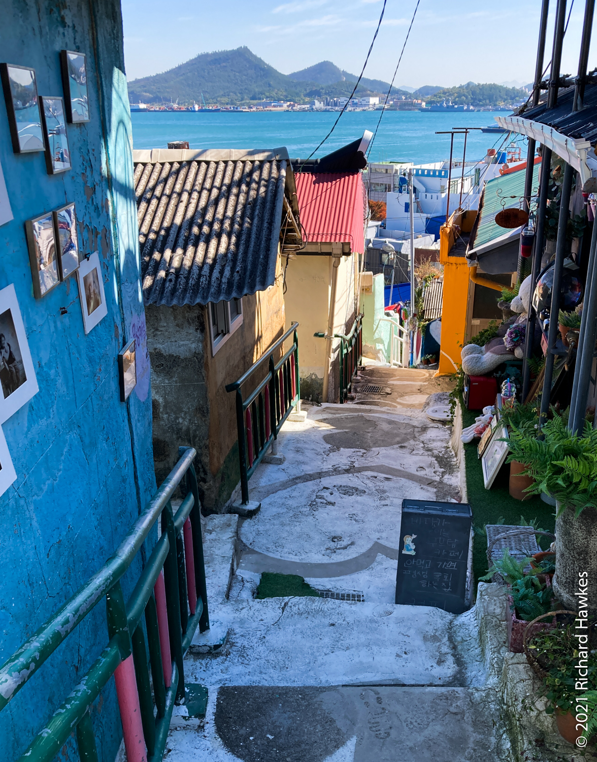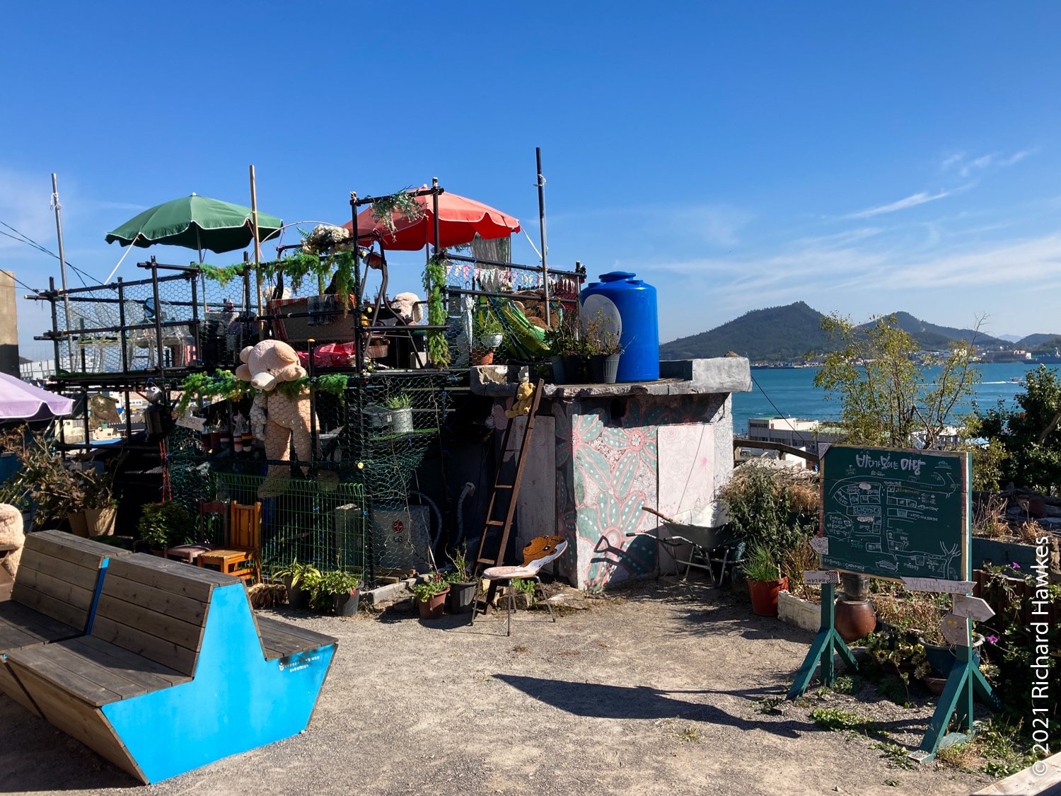 I took a bus back to the western side of the city to a hilly village area which has murals and a connection to a Korean drama. I’m not sure the name of the place but there is an observation deck called Babo Madang (바보마당) and the drama-related shop is called Yeonnhee’s Supermarket. The streets are named Borimadang-ro 22 (보리마당로22번길). I wandered around the tiny alleys and hills and got a coffee and macron at a place called Babo Macaron (바보마카롱). which looks over to the sea.