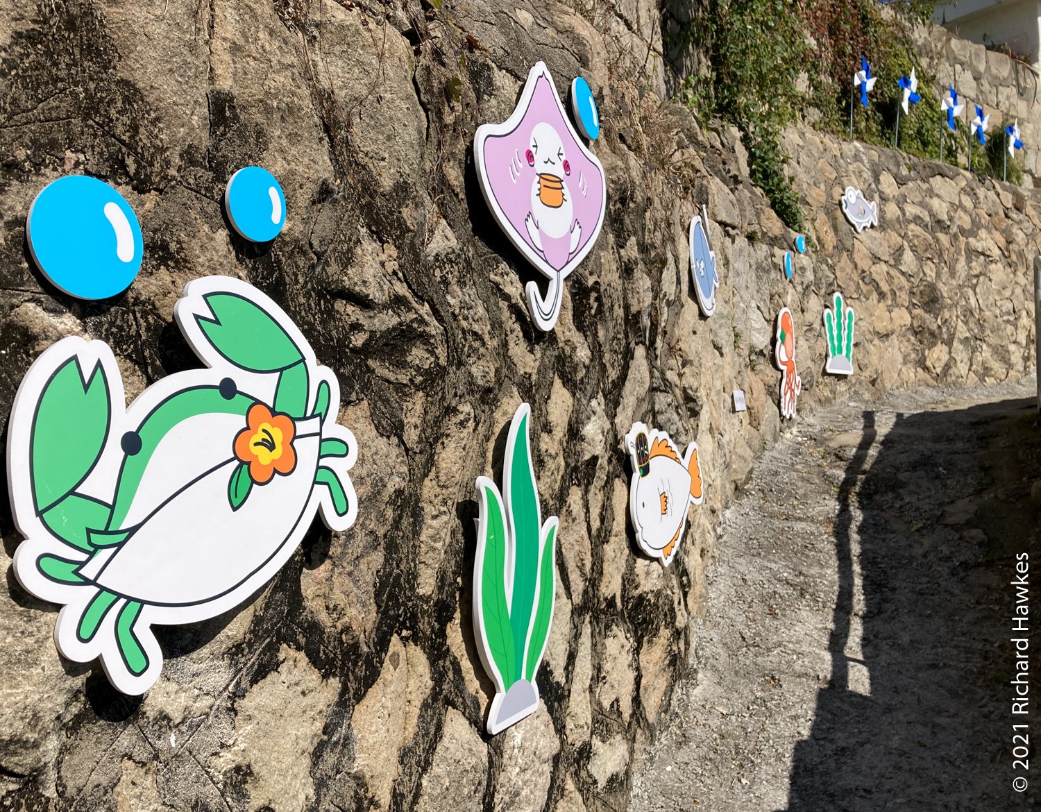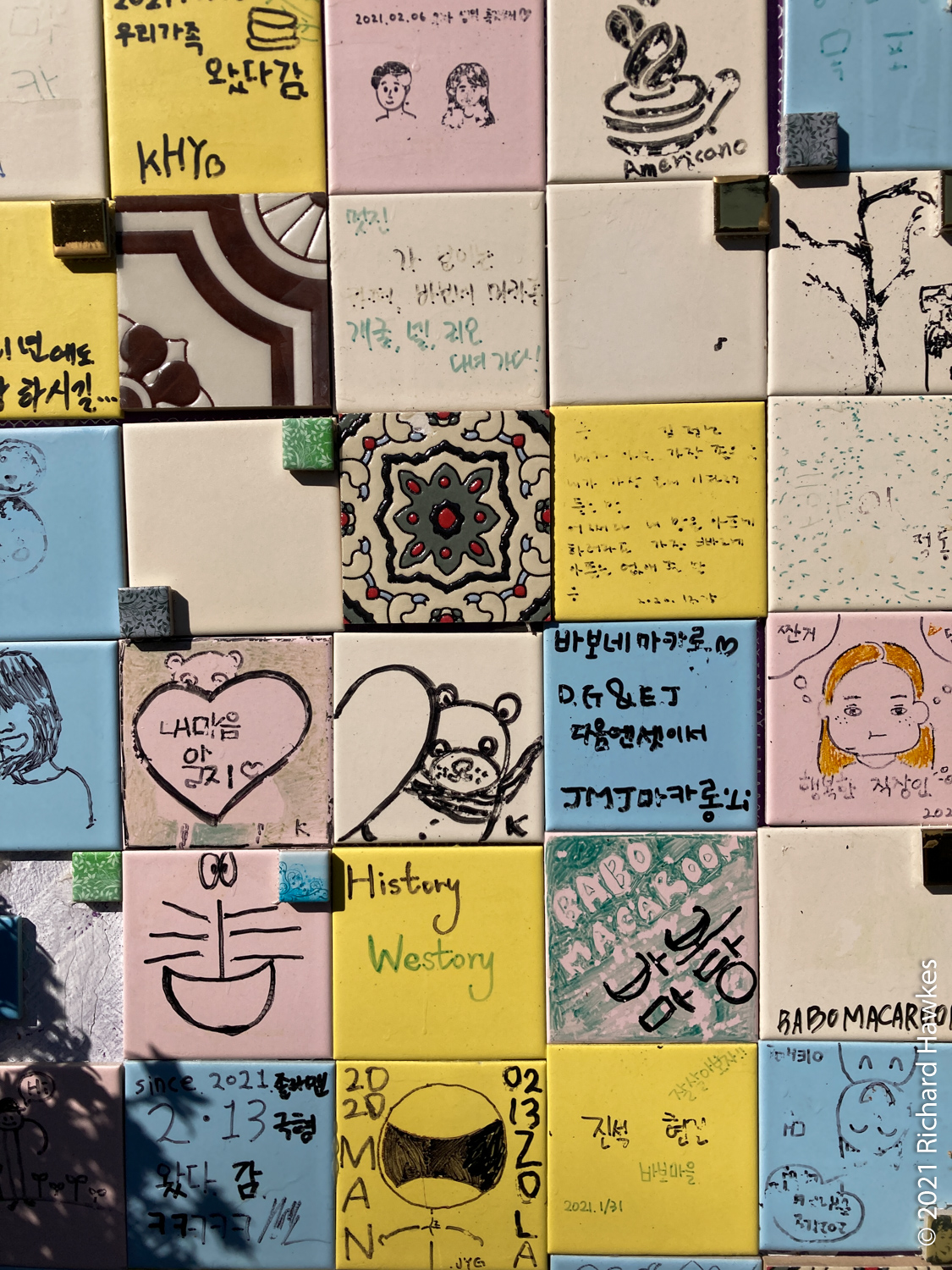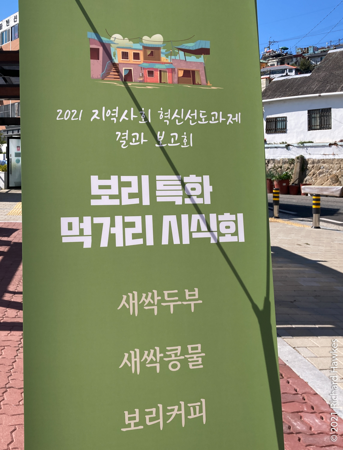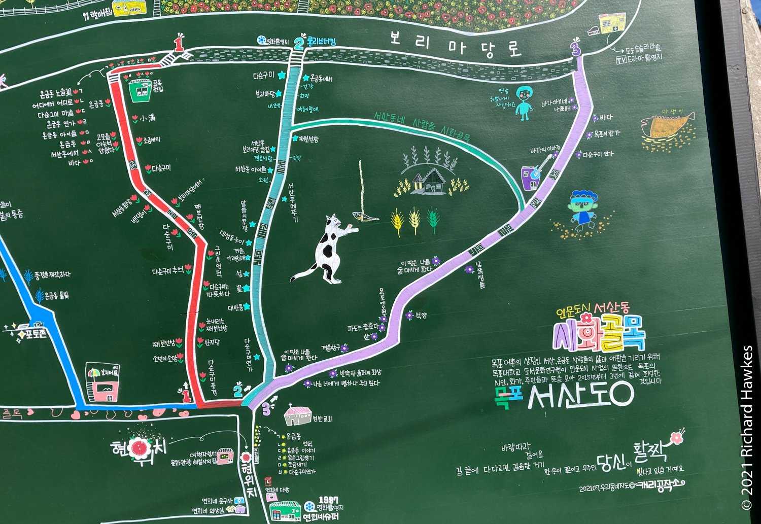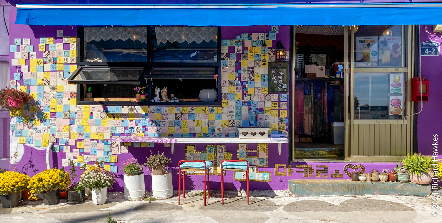 I took a bus back to the western side of the city to a hilly village area which has murals and a connection to a Korean drama. I’m not sure the name of the place but there is an observation deck called Babo Madang (바보마당) and the drama-related shop is called Yeonnhee’s Supermarket. The streets are named Borimadang-ro 22 (보리마당로22번길). I wandered around the tiny alleys and hills and got a coffee and macron at a place called Babo Macaron (바보마카롱). which looks over to the sea.