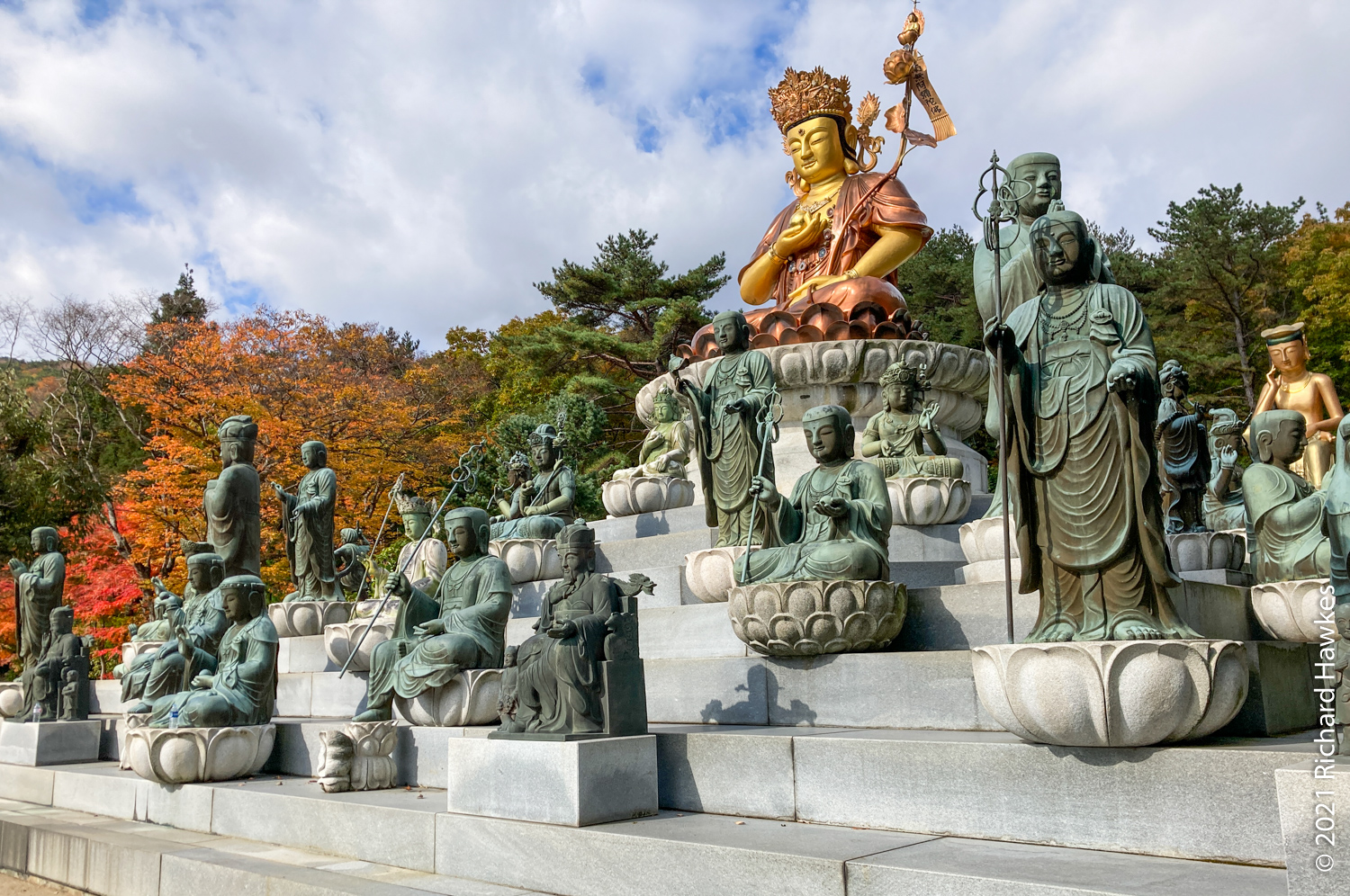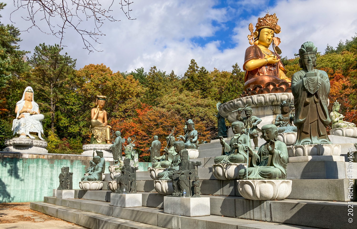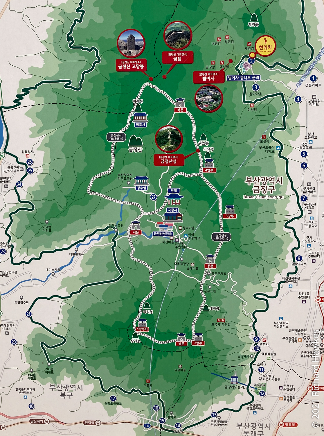 After a long toilet stay (thanks for ordering the spicy pizza last night Ryan…), I was on the train to one of the recommended mountain trails, Geumjeongsan (금정산). You can start at Beomeosa Temple (범어사) which takes about an hour from Songjeong Beach; just head to Beomeosa Station on the subway, in the north part of Busan. The entrance to the park and temple are very nice and I recommend going to the right of the temple and visiting Cheongryeonam hermitage (청련암) after you look at the main temple. The hermitage has lots of interesting statues in a central square area; a woman seemed to be circling it and praying each time around. There were a few plastic water bottles at some of the statues; my initial thought was “Rubbish? Here?” but then I thought that they must be offerings!