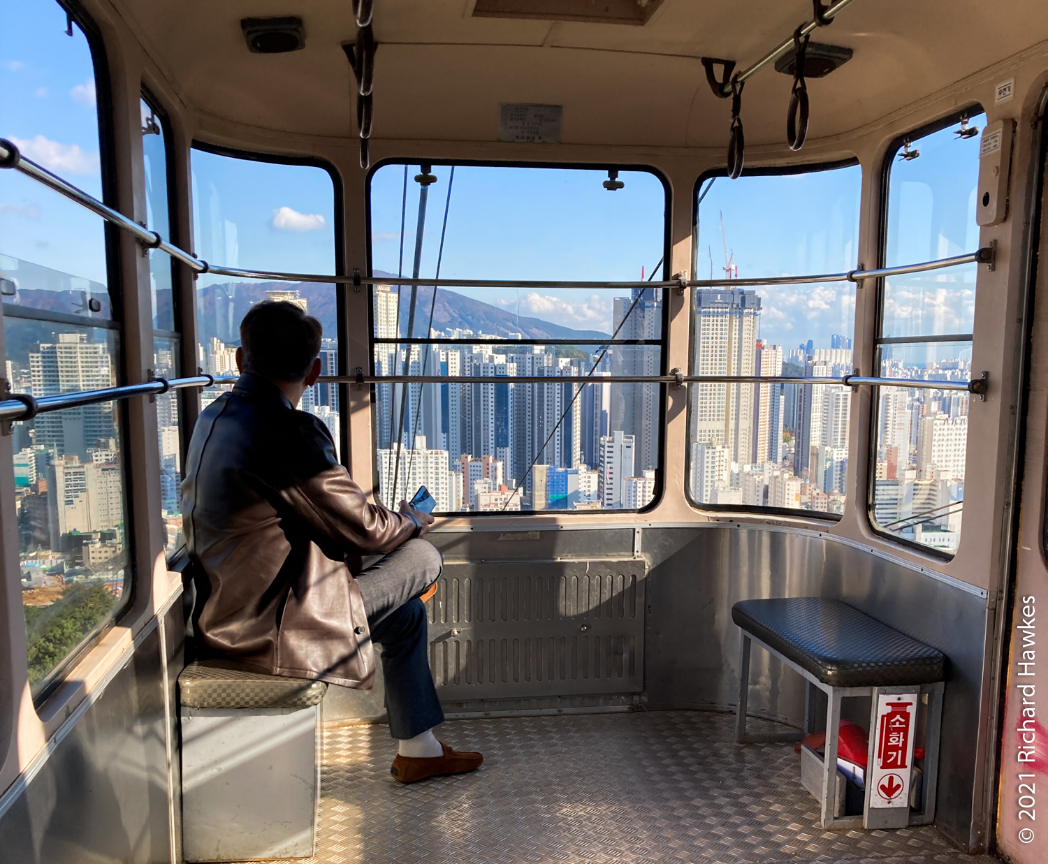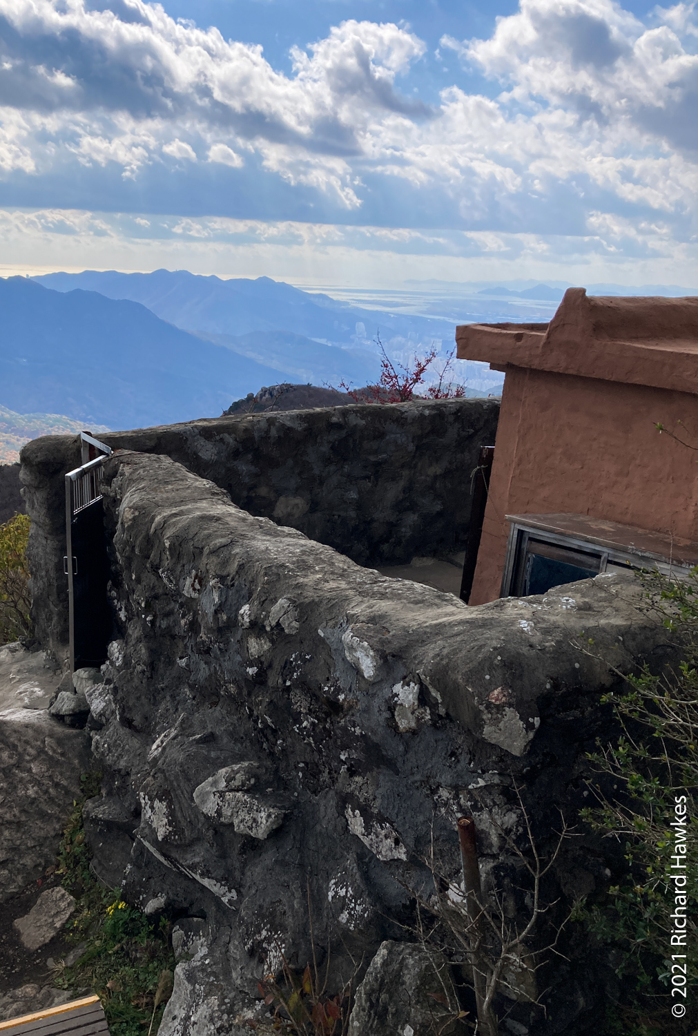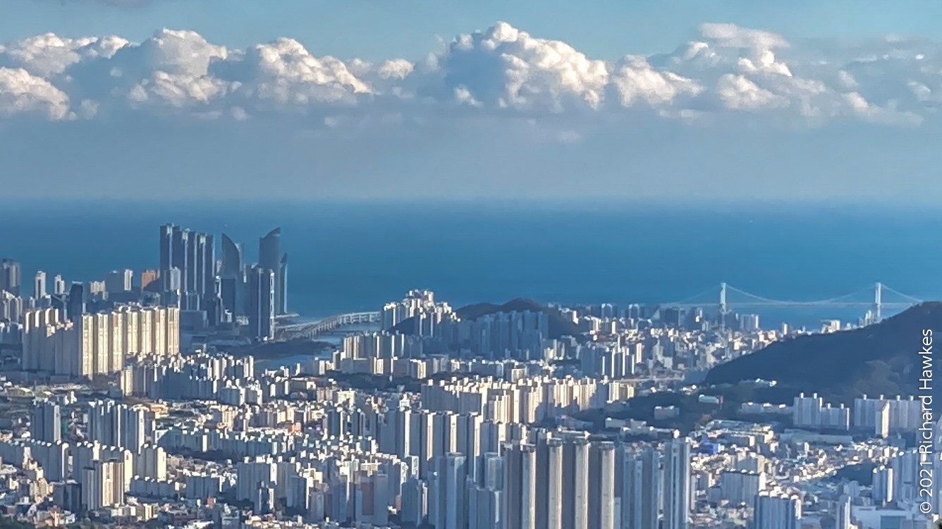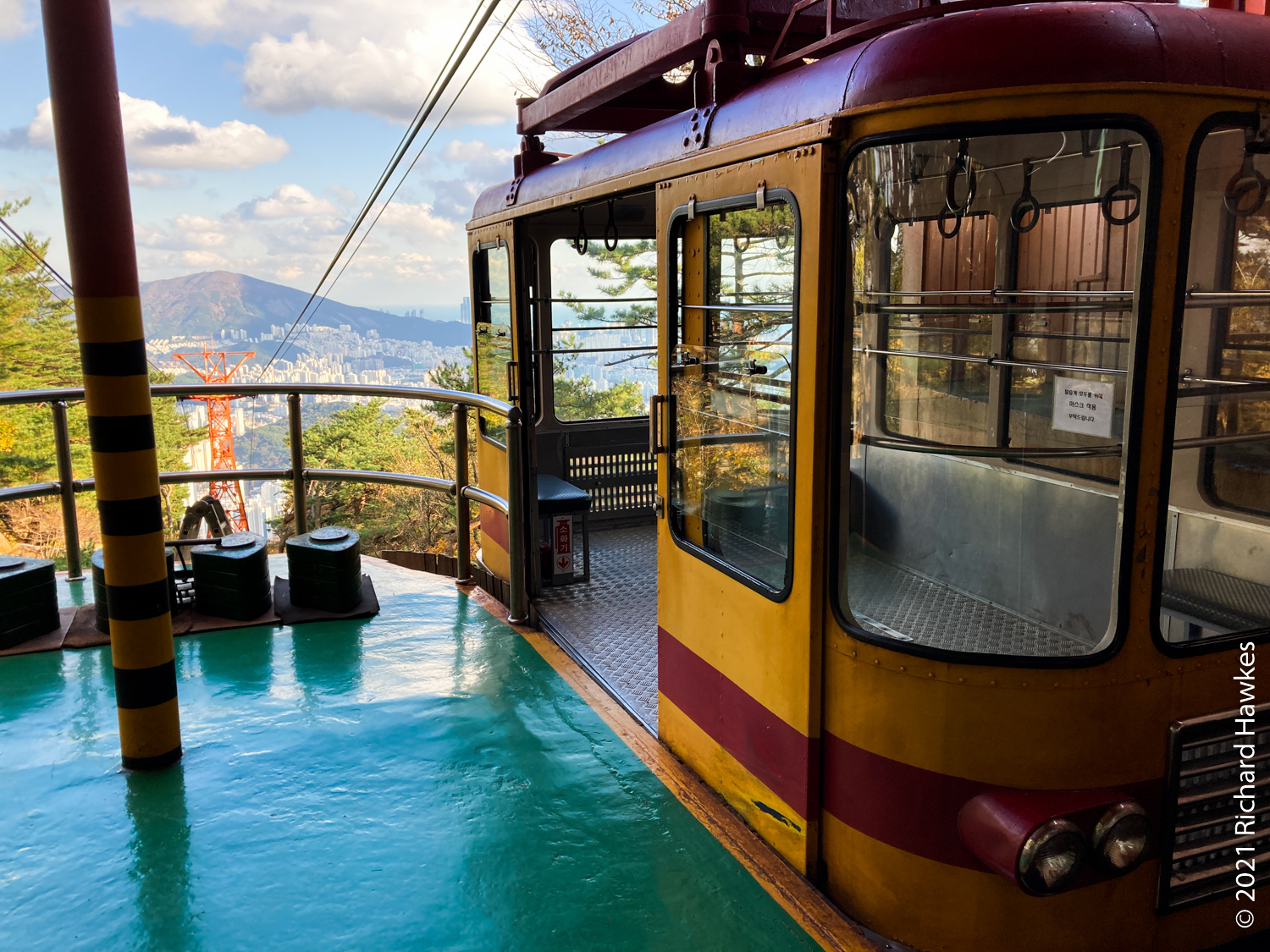 I was aiming to get to the cable car to take it down however since the latter part of the trail wasn’t that interesting (all trees), I got down at about the east gate and took a bus to Geumgang Park (금강공원) to get the cable car. Note, here it’s called a ropeway; new to me! The ropeway had a real old tin toy feel to it, very colourful and quaint looking. Also clean and well maintained I might add! It was a nice ride up and at the top there are refreshments. I didn’t stop though, just went to the lookout point about 200 metres further up. From there I could see better views of the sea and south part of Busan.