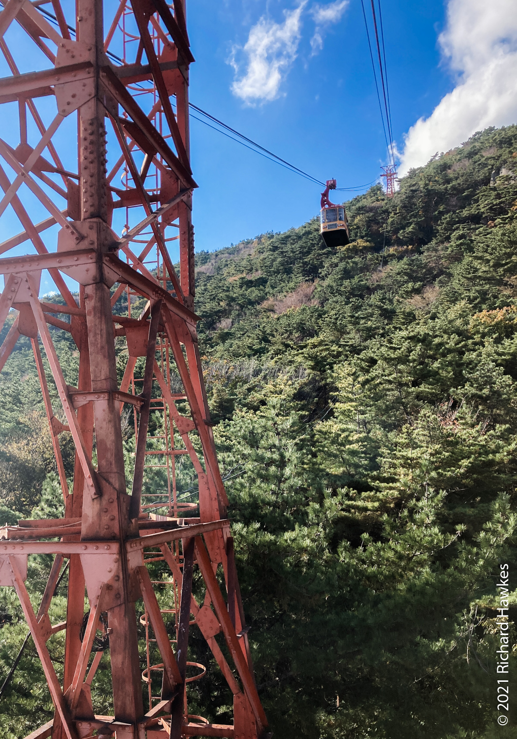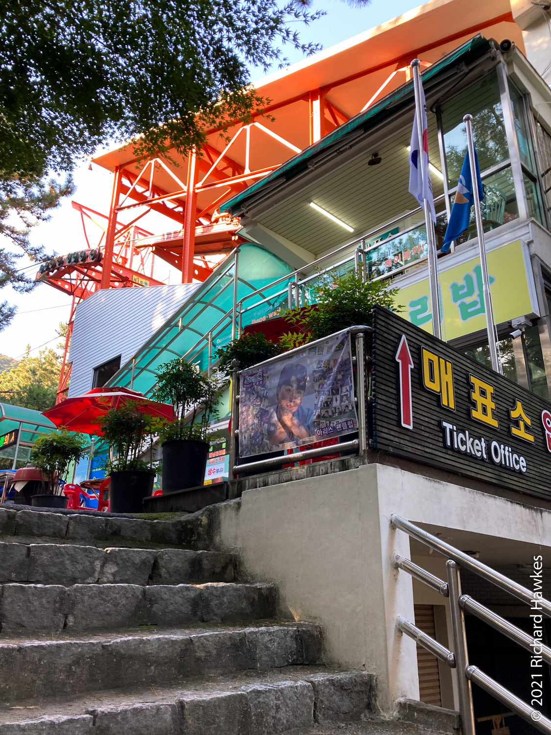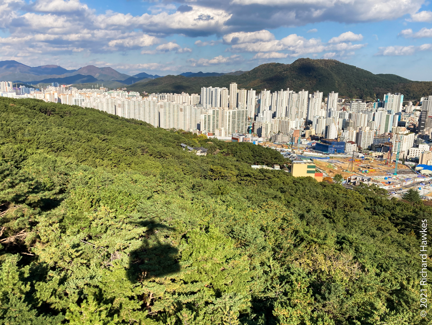 I was aiming to get to the cable car to take it down however since the latter part of the trail wasn’t that interesting (all trees), I got down at about the east gate and took a bus to Geumgang Park (금강공원) to get the cable car. Note, here it’s called a ropeway; new to me! The ropeway had a real old tin toy feel to it, very colourful and quaint looking. Also clean and well maintained I might add! It was a nice ride up and at the top there are refreshments. I didn’t stop though, just went to the lookout point about 200 metres further up. From there I could see better views of the sea and south part of Busan.