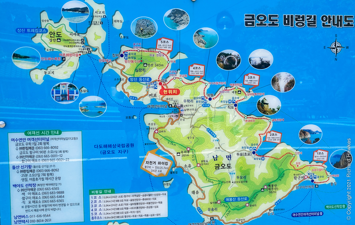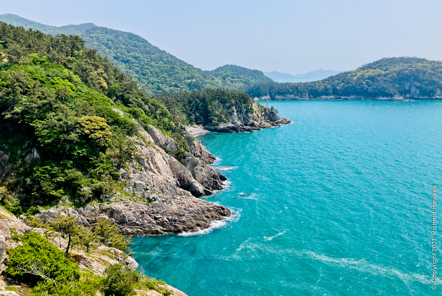 We got to the ferry port too late to take the ferry we wanted so left around 12:30. The trip was fine and the island was nice to drive around; not many cars and great weather. Our first stop was a part of the Geumodo Birong-gil(?) hiking trail (금오도비렁길4코스), on the south side of the island. This was a wooded coastal trail which passed lots of little view points along the way. The trail goes around the whole island, but this isn’t a hiking trip, so we kept it short. This part of the trail is accessible from Simpohang harbour (심포항). The village was quiet and quaint.