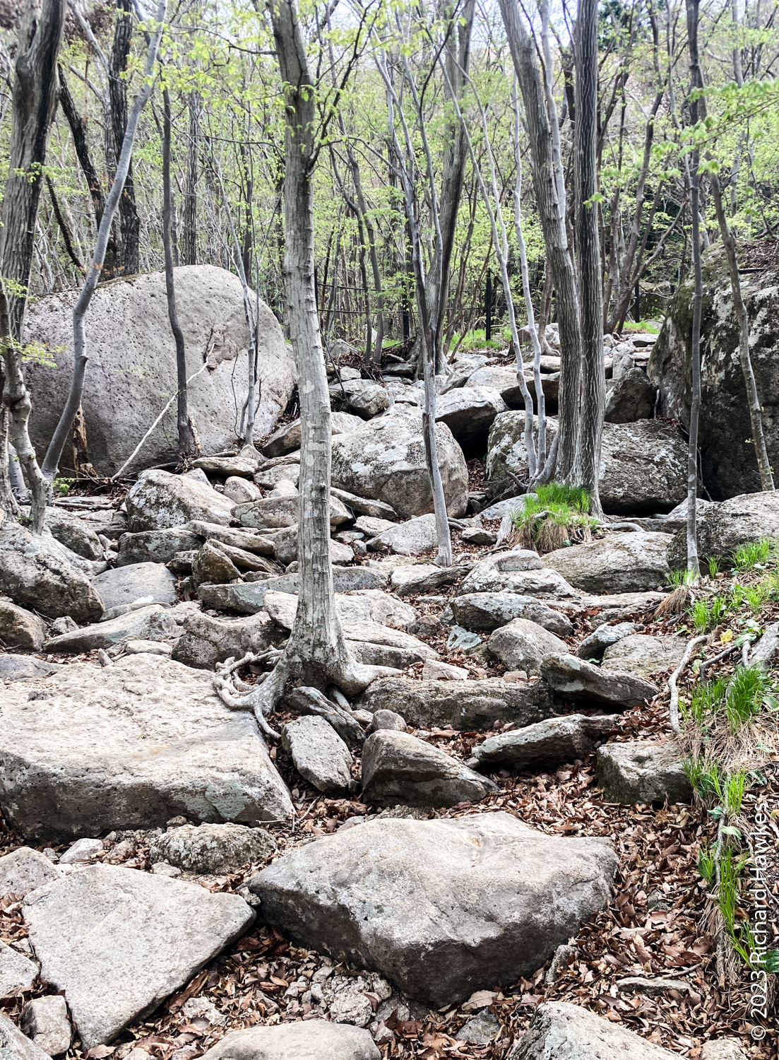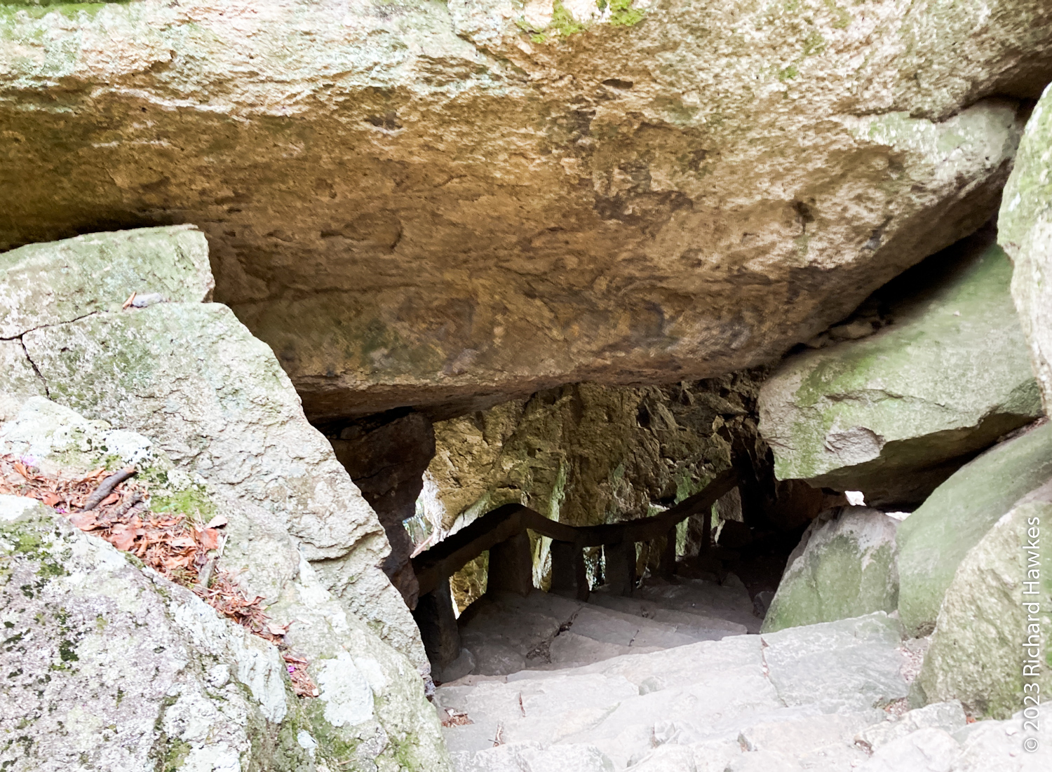 I left the mountain heading mainly south, not to the main entrance on the west. The start of the hike down takes you through some interesting cave-like rocky features.