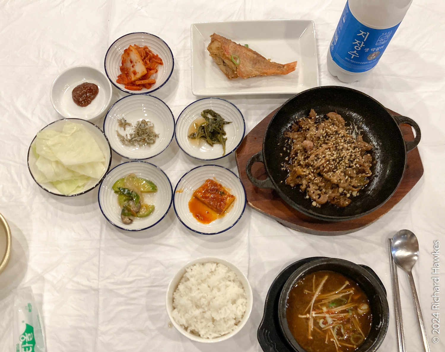 Two buildings down from Benikea was Jeongam Sikdang (정암식당), a family restaurant where I got a very decent plate of pork bulgogi (usually, it’s beef) and a whole table of side dishes. That went down well after today’s hiking, especially with the makgeolli. Then I walked around the beach area a bit before heading back to my room to prepare for my last day in Sokcho. Instead of blogging, I spent a bit of time tracking down a traffic violation I’d just been messaged about; turned out it was a 130,000 won fine for the last time I was in Haenam (September this year with Romana…sheesh…).