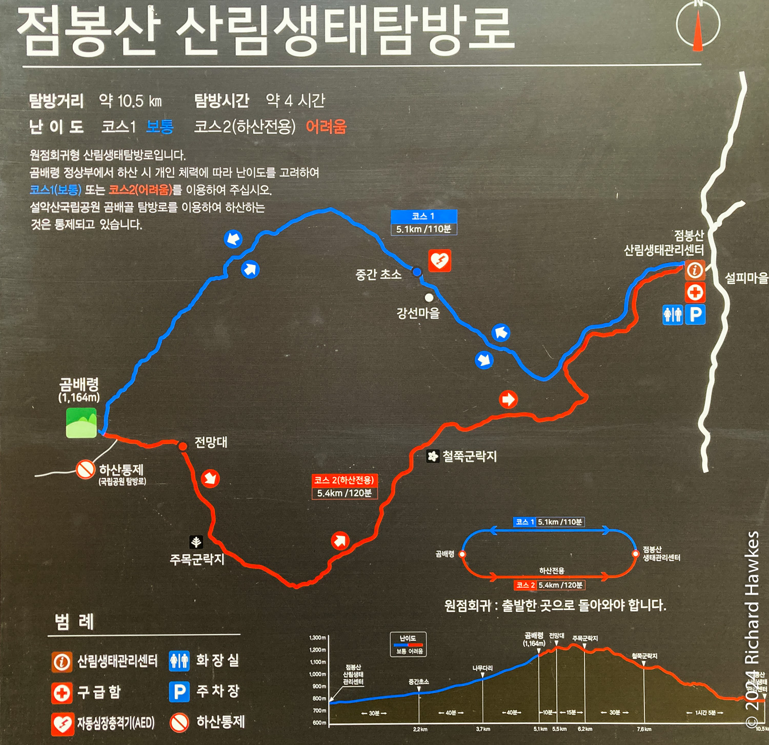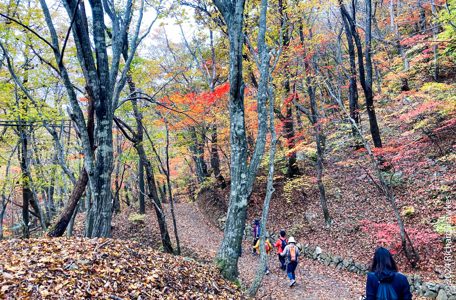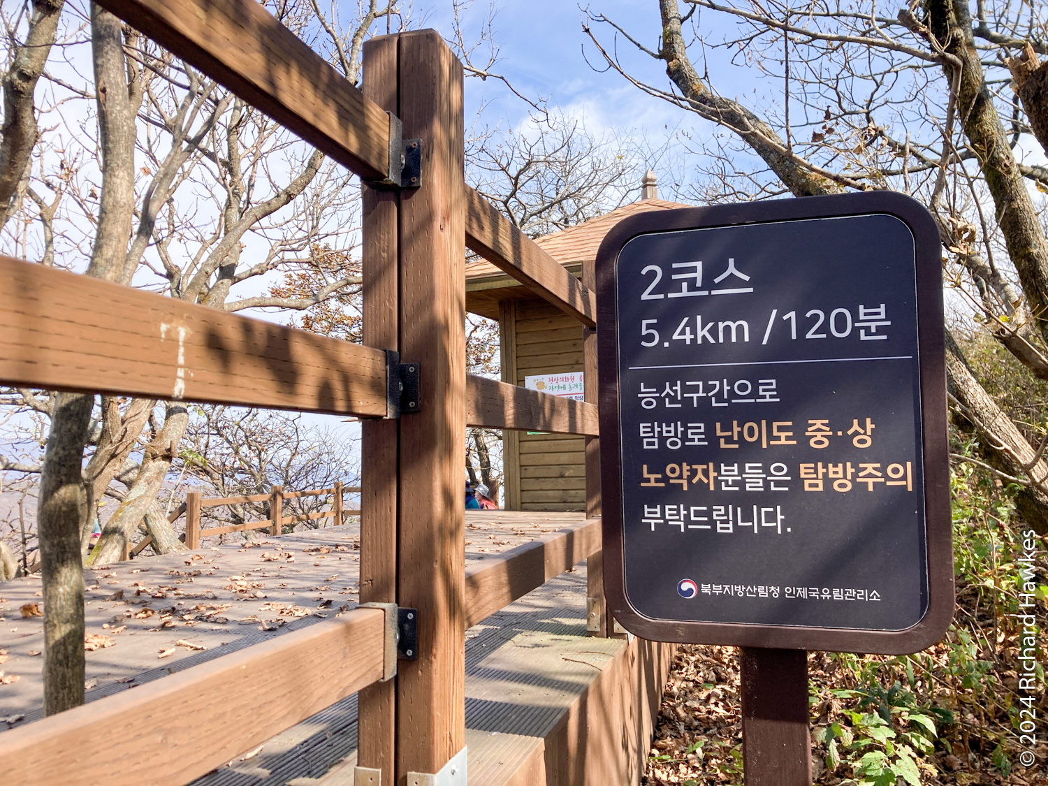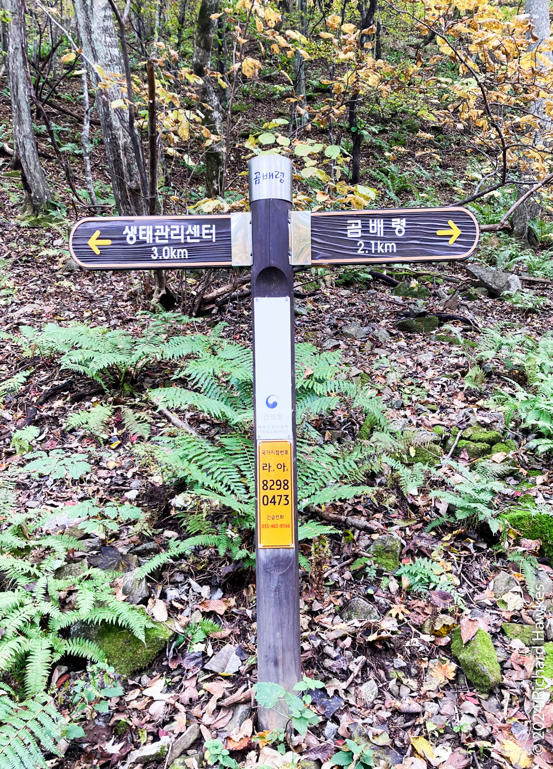 On the day, I got up early to pee and was met with a lovely sunrise in the room. Later, at about 8, I got up to pack and leave for the 40 minute drive to the the park. The road to the entrance is quite narrow and windy, but fortunately, everyone was driving the same way. The parking lot is huge and even though there’s not entrance fee, you need to pay 5,000 won for parking. The car park was about one third full and there were quite a few hikers milling around and heading towards the trail entrance. There was a small line past the checkpoint (they simply asked to see ID and check your name and give you a red plastic card), then I was on the trail. There are two trails, blue are red. I’d recommend going anti-clockwise so you can do both (one of the trails is one-way only). It took me about 3.5 hours including a lunch stop at the observation deck at the top.