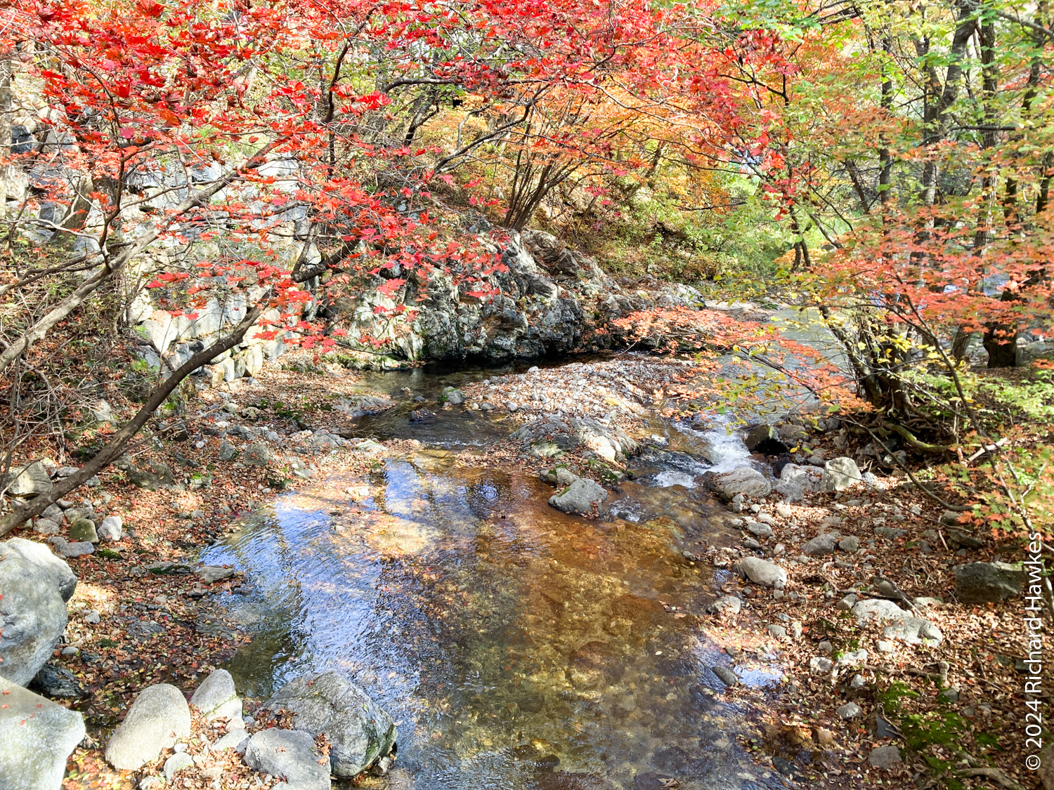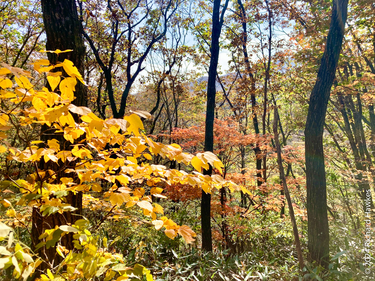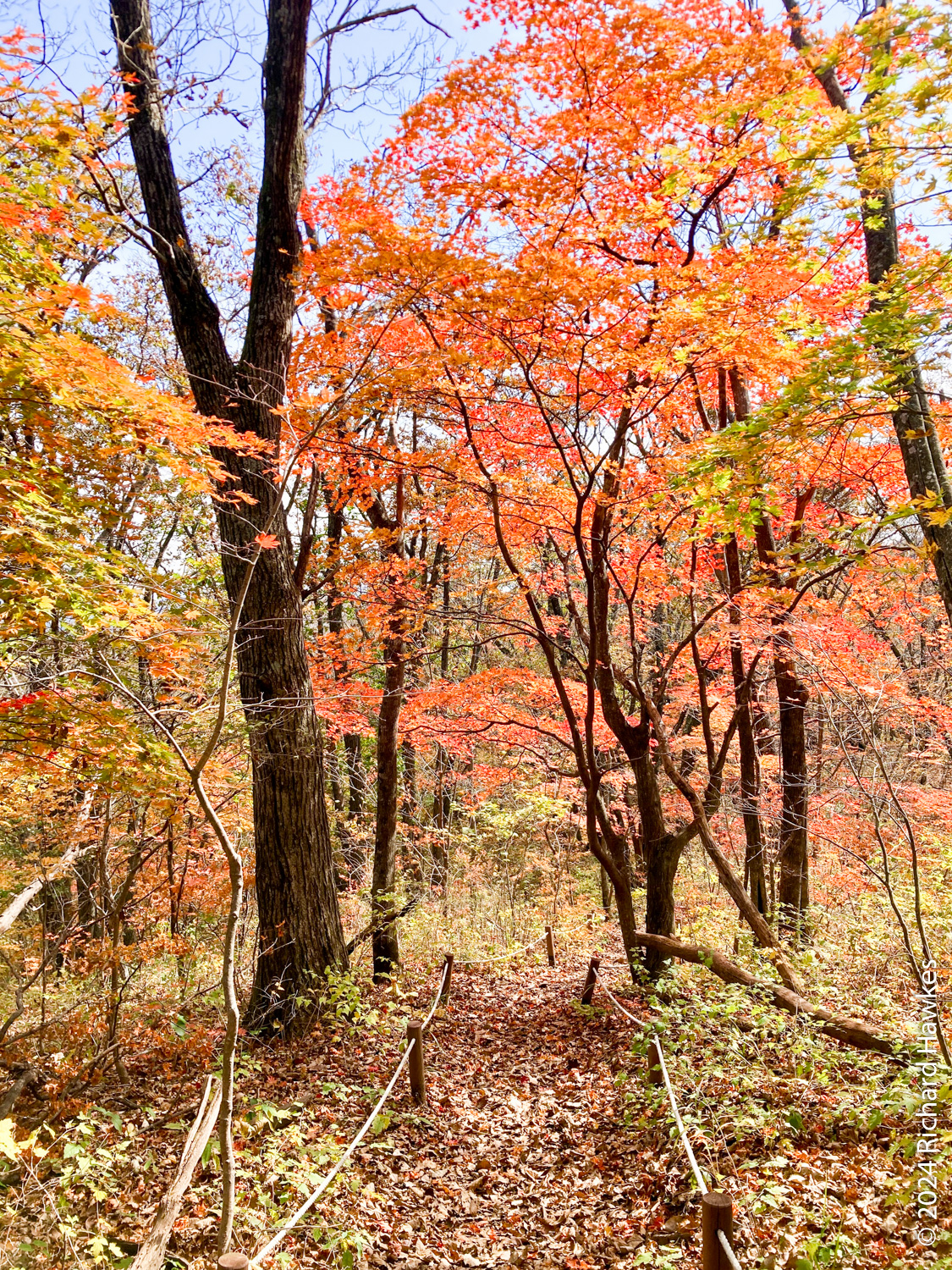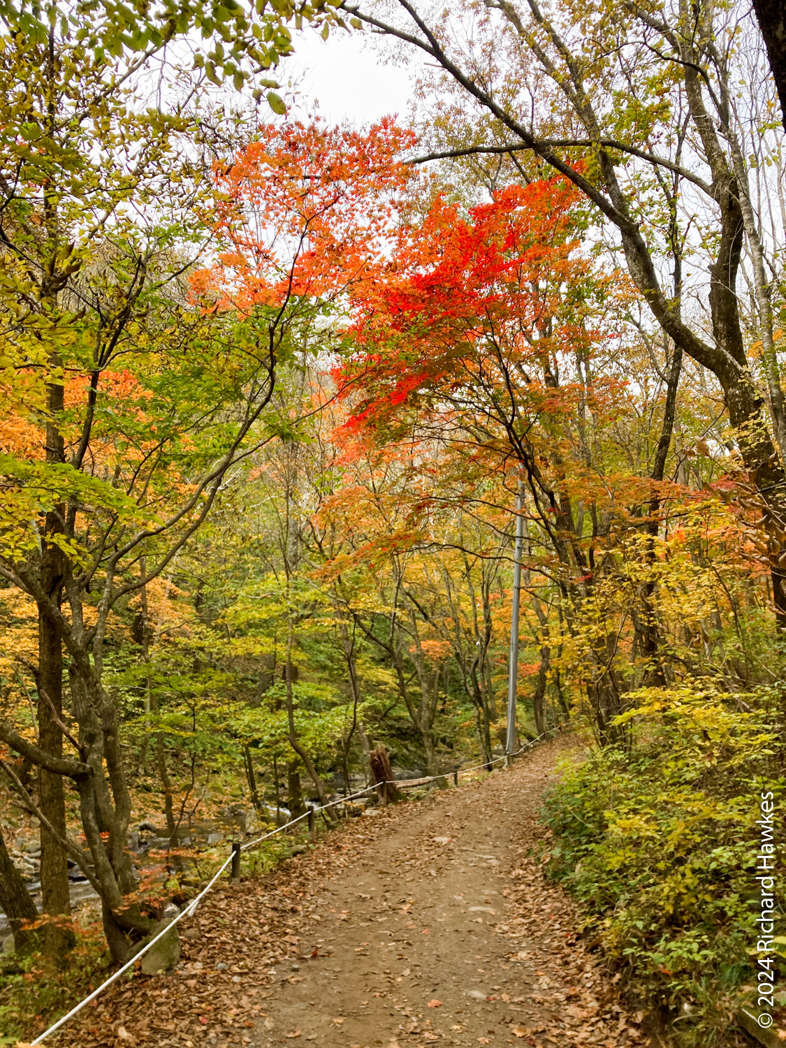 The start of the trail goes through nice stream-side forest with lots of colourful leaves. As I passed a few groups of people, it got less busy and soon I was mostly alone on the trail. At some point you get to a small food village where owners wait for customers. It was a little early for me to get food so I guess the owners do most their business when people take the blue trail back; I’d be doing the loop, so I wouldn’t be revisiting the village unfortunately.