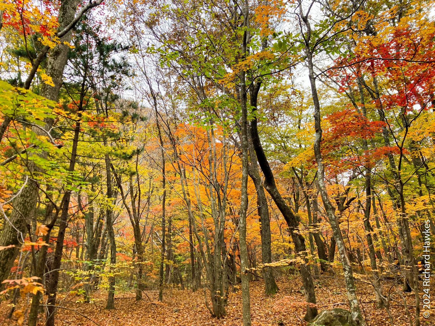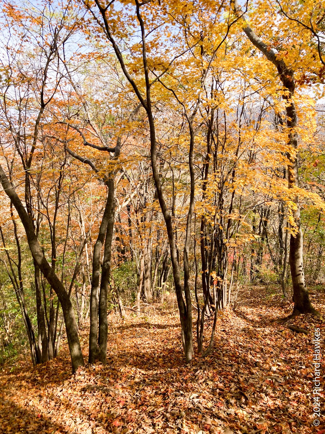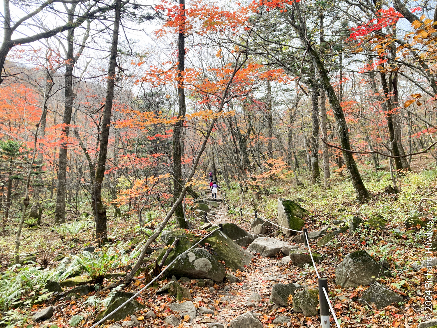 The start of the trail goes through nice stream-side forest with lots of colourful leaves. As I passed a few groups of people, it got less busy and soon I was mostly alone on the trail. At some point you get to a small food village where owners wait for customers. It was a little early for me to get food so I guess the owners do most their business when people take the blue trail back; I’d be doing the loop, so I wouldn’t be revisiting the village unfortunately.