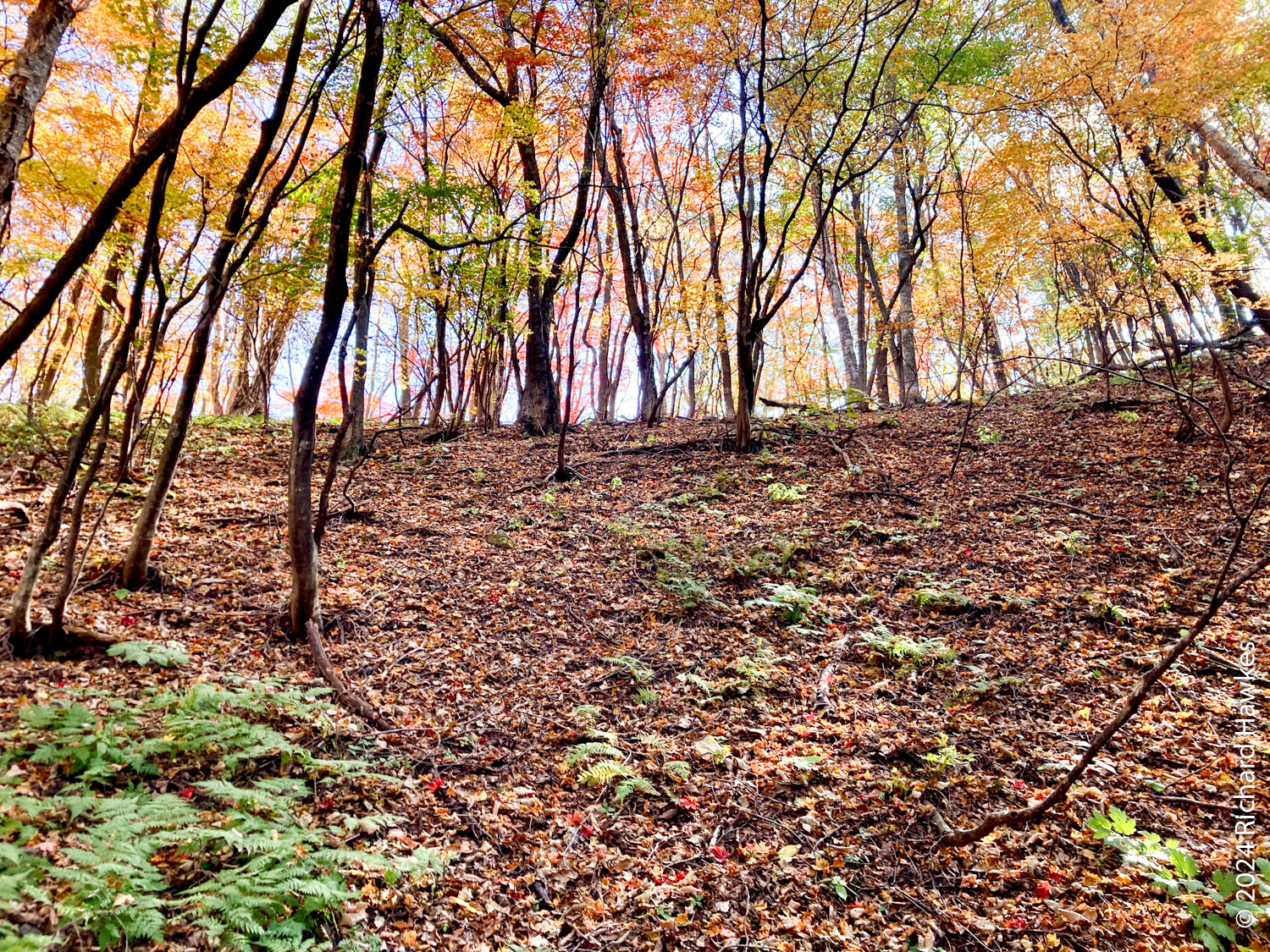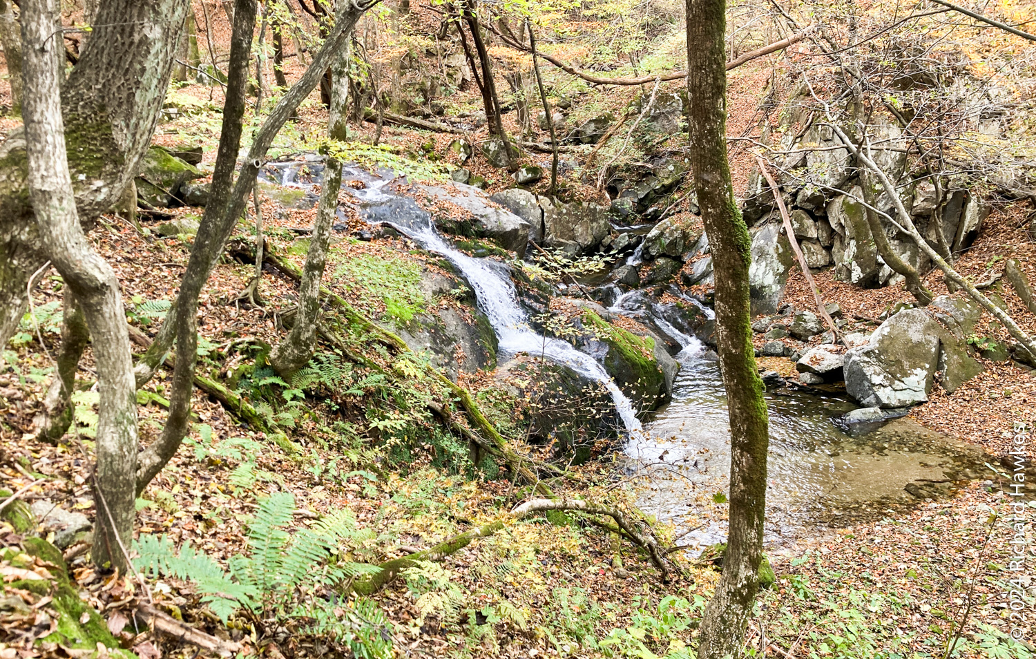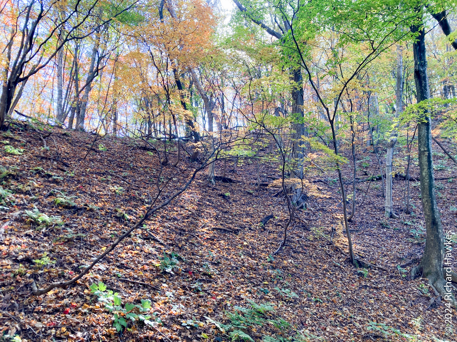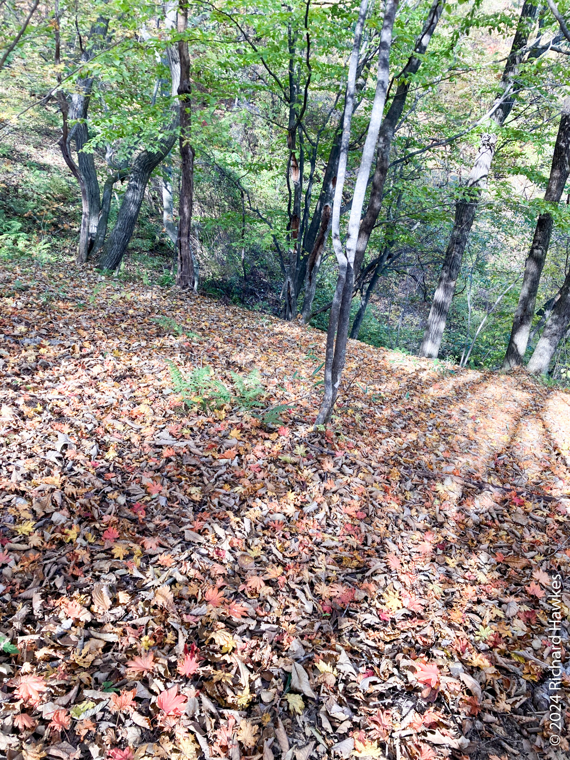 Toward the end of the hike, there’s a leaf-covered hillside leading back down to ‘ground level’. Then it’s along more forest, some stream, up then down a minor rocky bit, across a bridge, and back to the entrance. I got there about 13:30. There wasn’t much to eat there, so I got in the car a searched for my next destination.