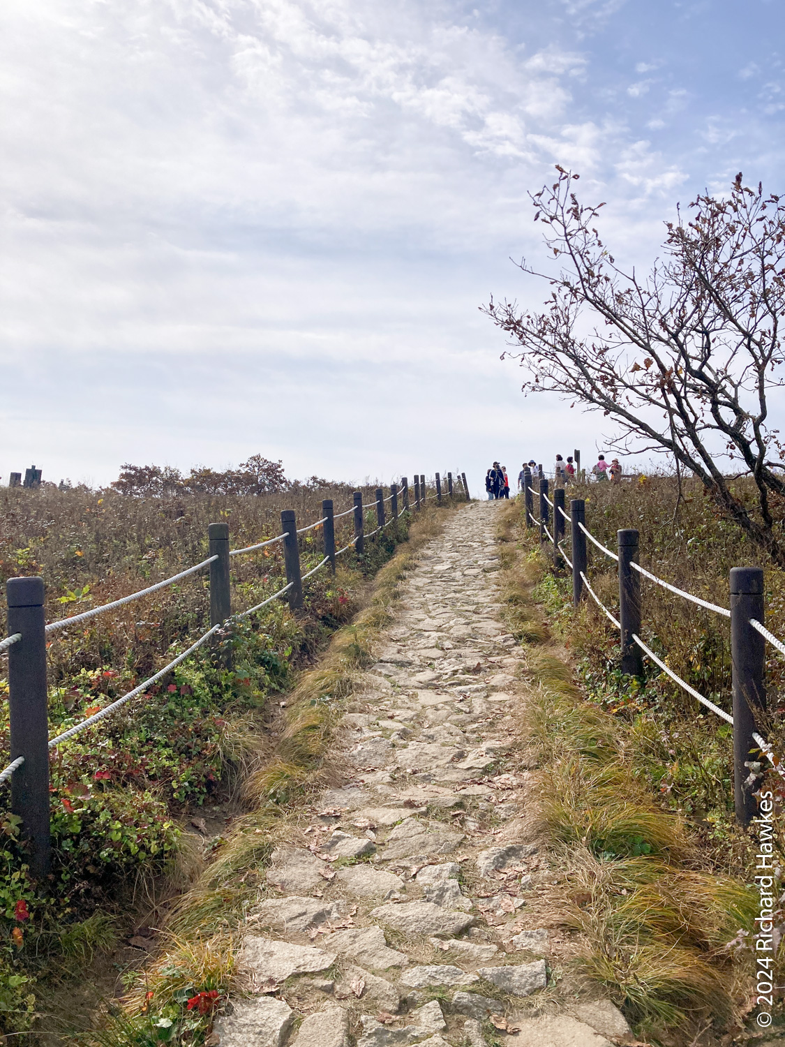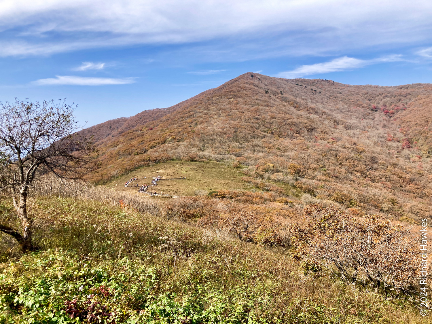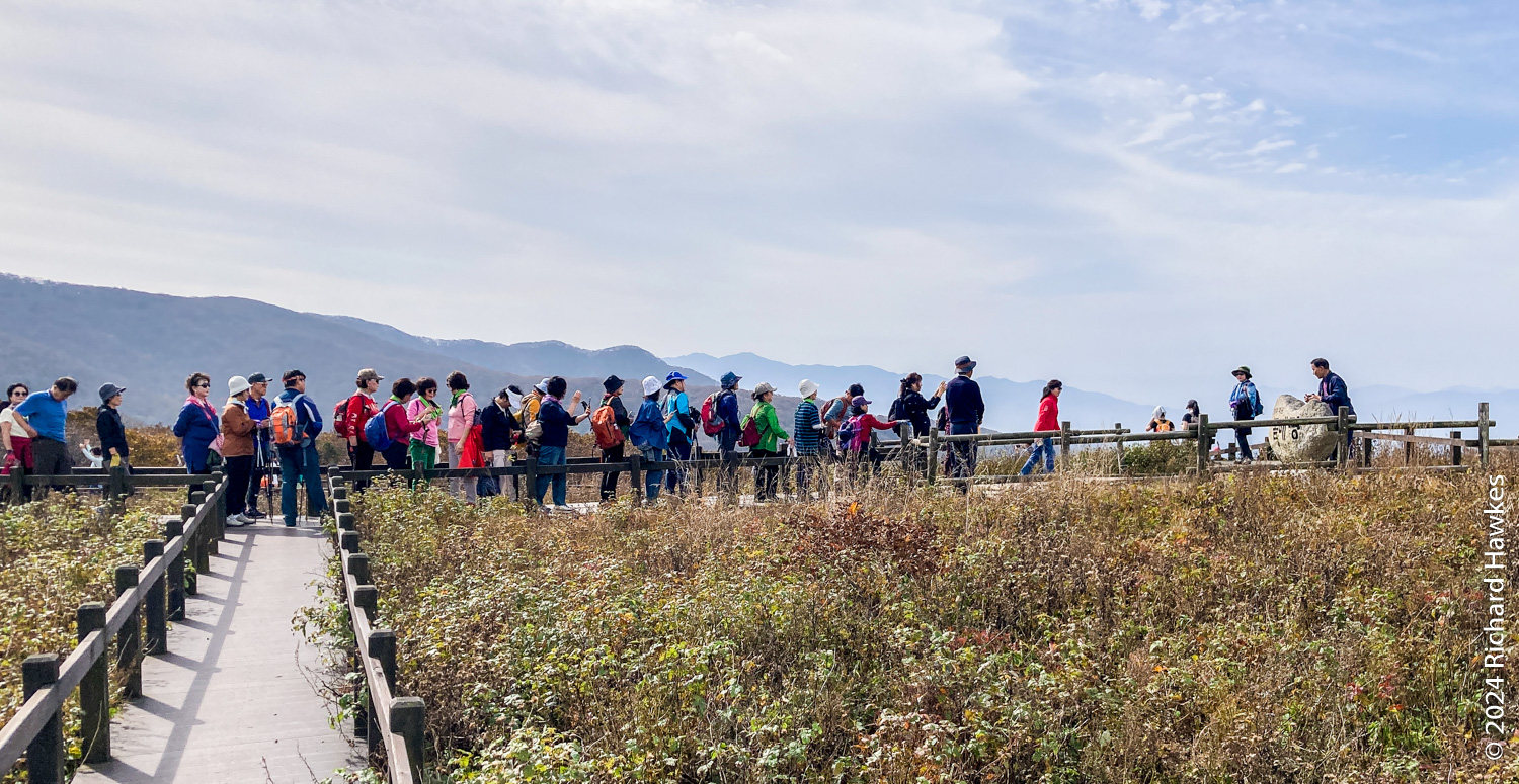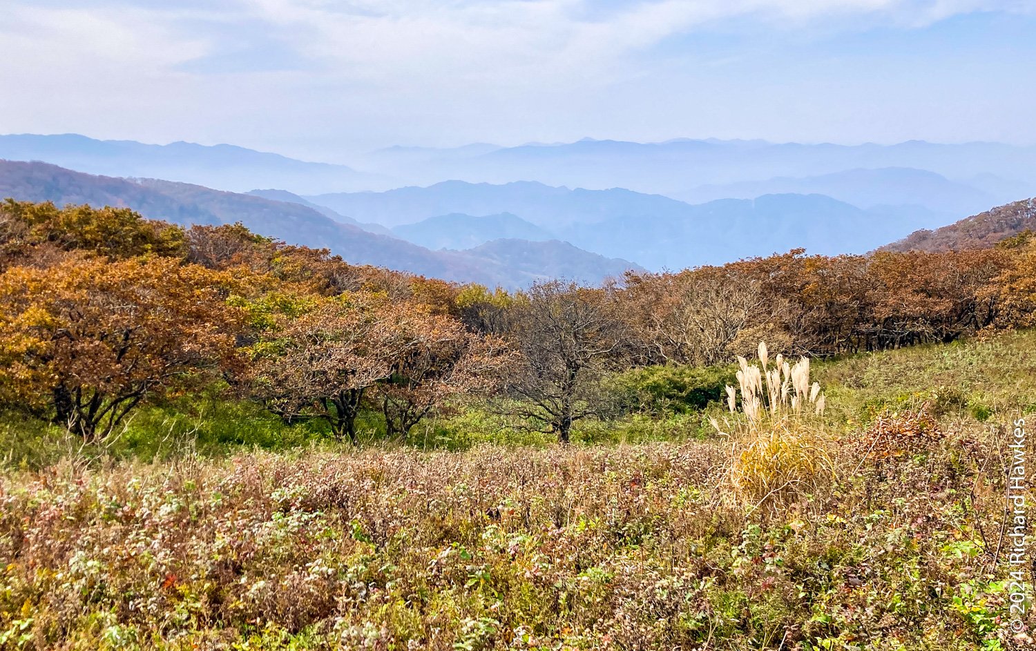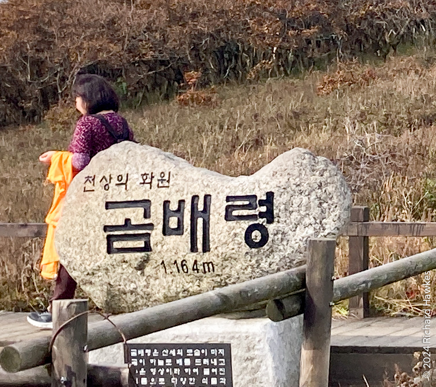 Eventually, you get to a wide grassy area which is the endpoint of the trail. This is Jeombongsan (점봉산). It’s a tall grassy hill, green in the website photos, and autumn brown now! There’s stone marker to take photos next to, but I was too impatient to wait. I took photos of the scenery, the walked up further to the observation deck on the hill opposite. There was plenty of room to sit and eat my sandwiches and enjoy the views across the grassy plain and mountains. It reminded me little of the grassy mountain tops of Hallasan, Sobaeksan, and (later) Mudeungsan (I would go there in the following week).