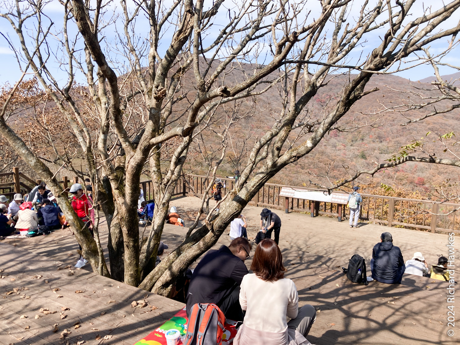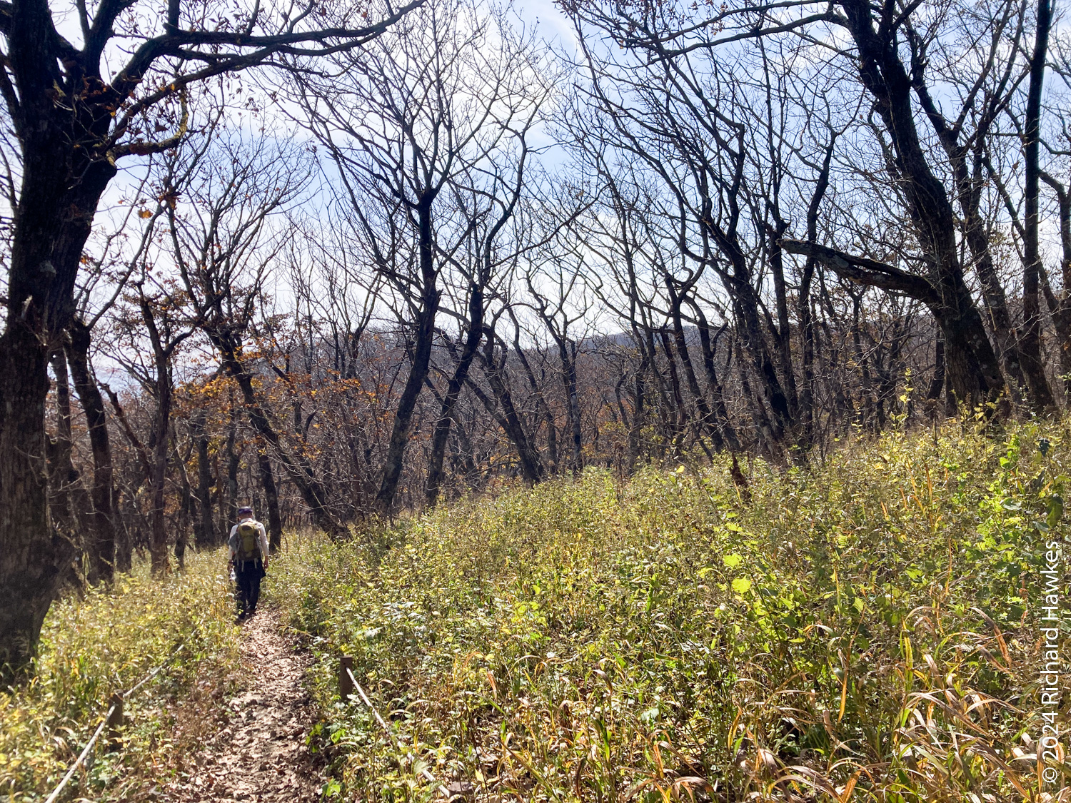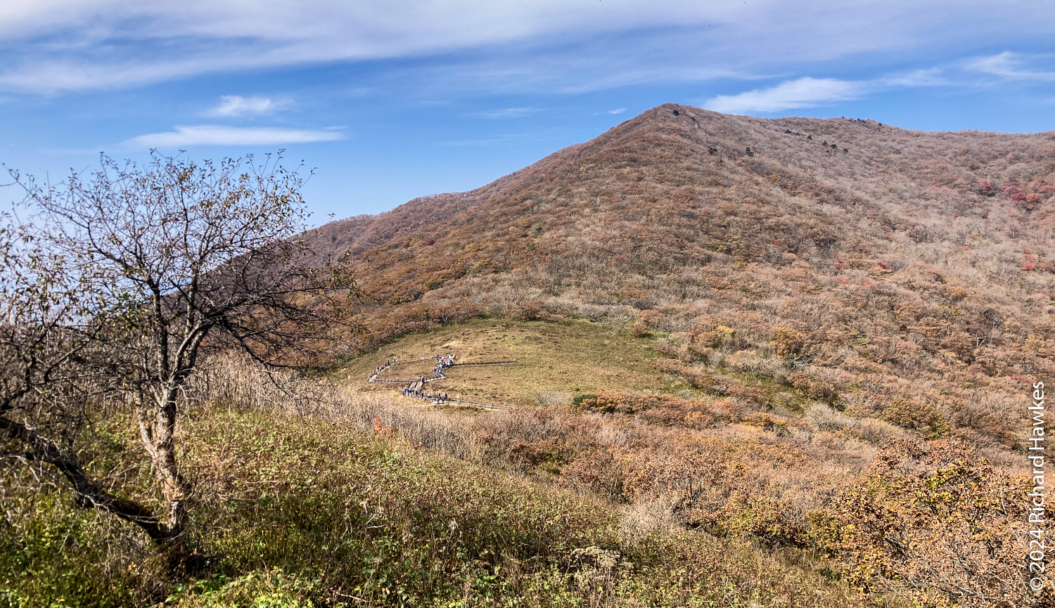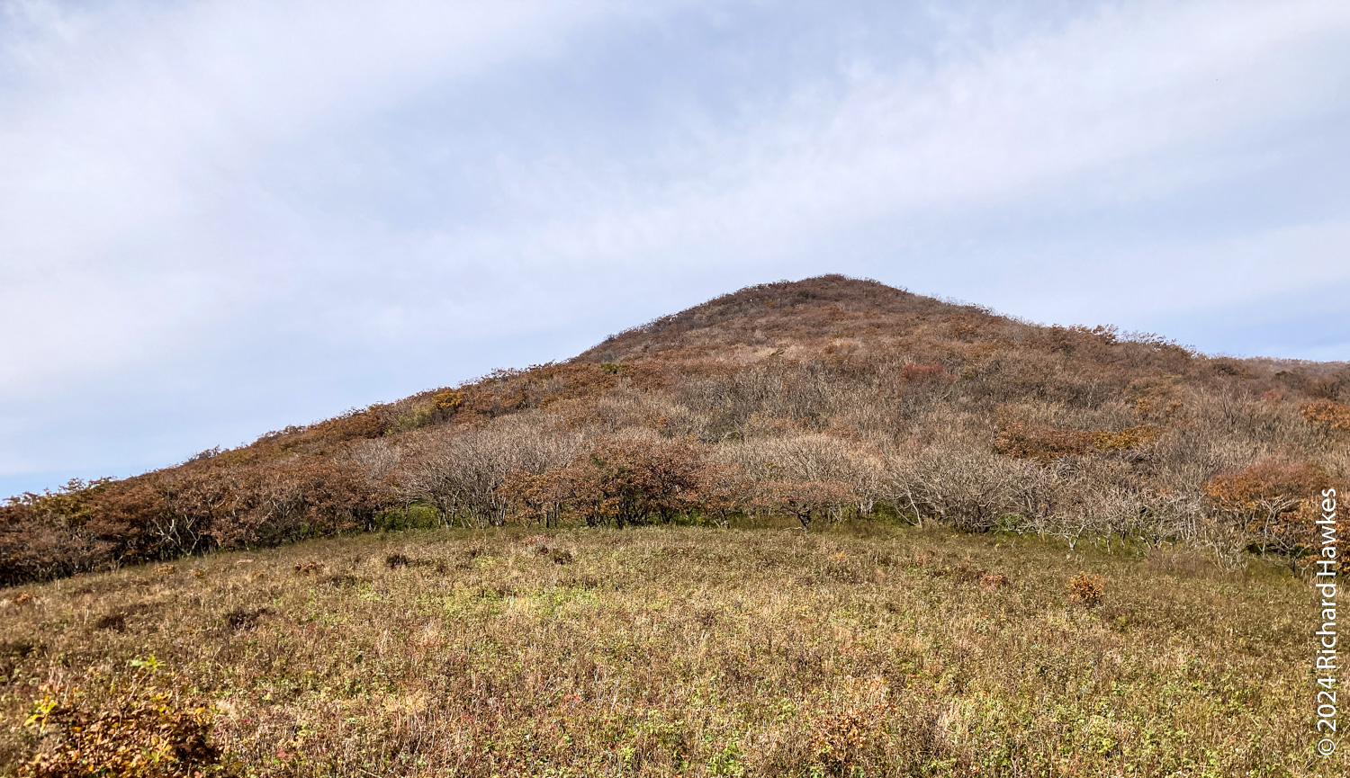 Eventually, you get to a wide grassy area which is the endpoint of the trail. This is Jeombongsan (점봉산). It’s a tall grassy hill, green in the website photos, and autumn brown now! There’s stone marker to take photos next to, but I was too impatient to wait. I took photos of the scenery, the walked up further to the observation deck on the hill opposite. There was plenty of room to sit and eat my sandwiches and enjoy the views across the grassy plain and mountains. It reminded me little of the grassy mountain tops of Hallasan, Sobaeksan, and (later) Mudeungsan (I would go there in the following week).