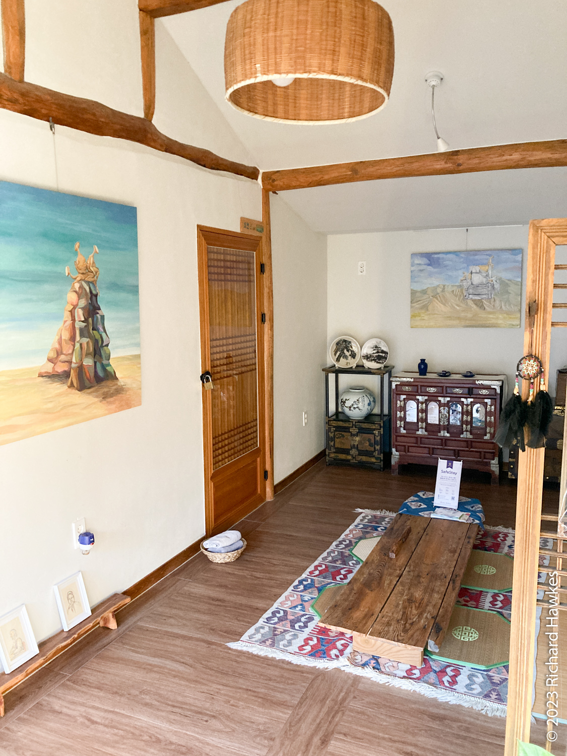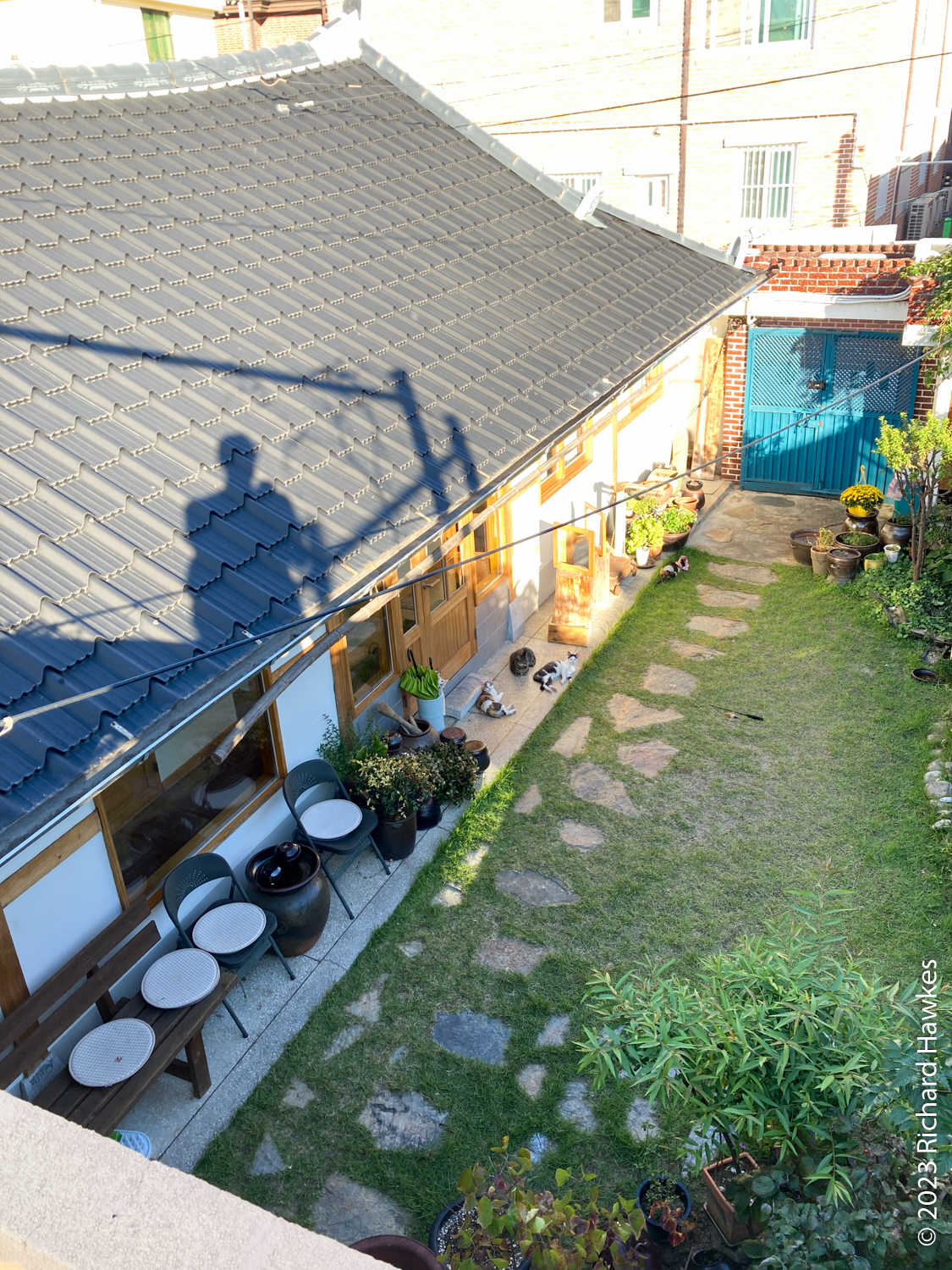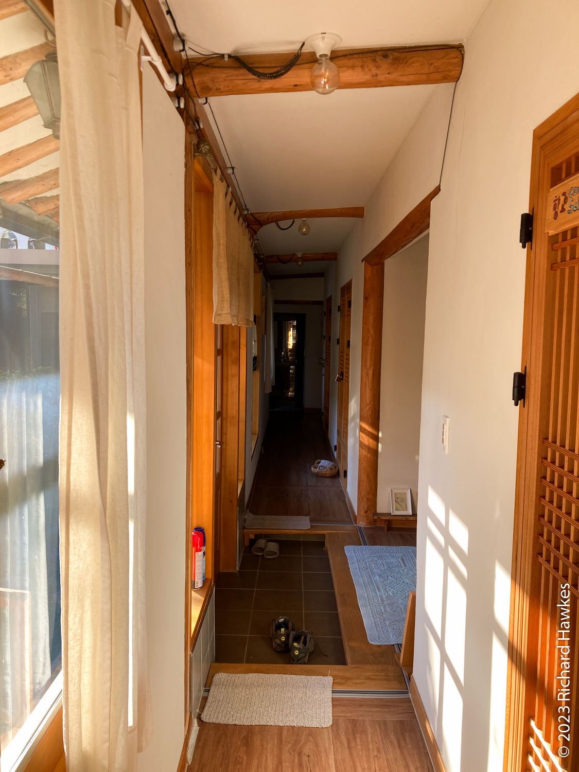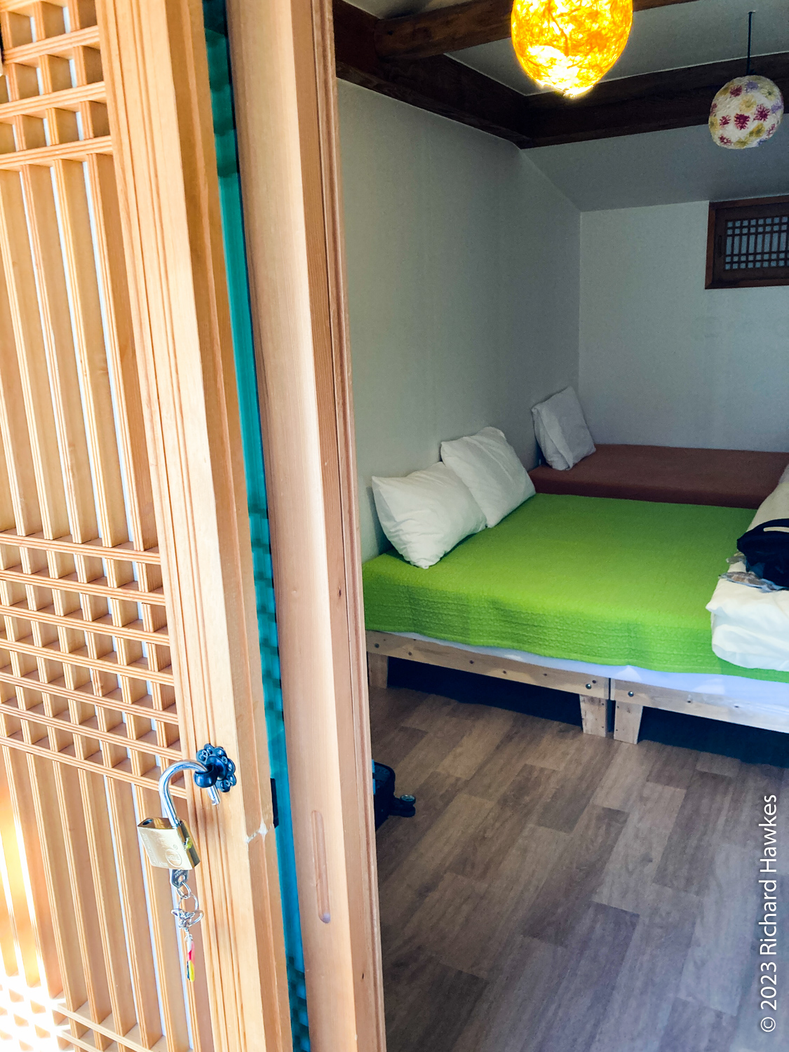 From there, it was an easy drive into Namwon and to the Mua Hanok Guesthouse (무아 한옥 게스트하우스). I was booked to stay in a dormitory in the building on the main road, but they put me in a private room in a really nicely refurbished hanok in the alley behind. It was a lovely room, there was a small garden with rescued cats, and a stairway to the roof. A really nice place and I’d definitely come again.