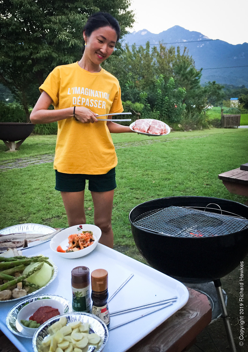 Romana and I drove from Hwangdo to Gyeryongsan for the next part of our mini road-trip. The accommodation (pension) had a front garden that looked on to the mountain and where we’d have our barbecue later. It was a nice, reasonably priced place.