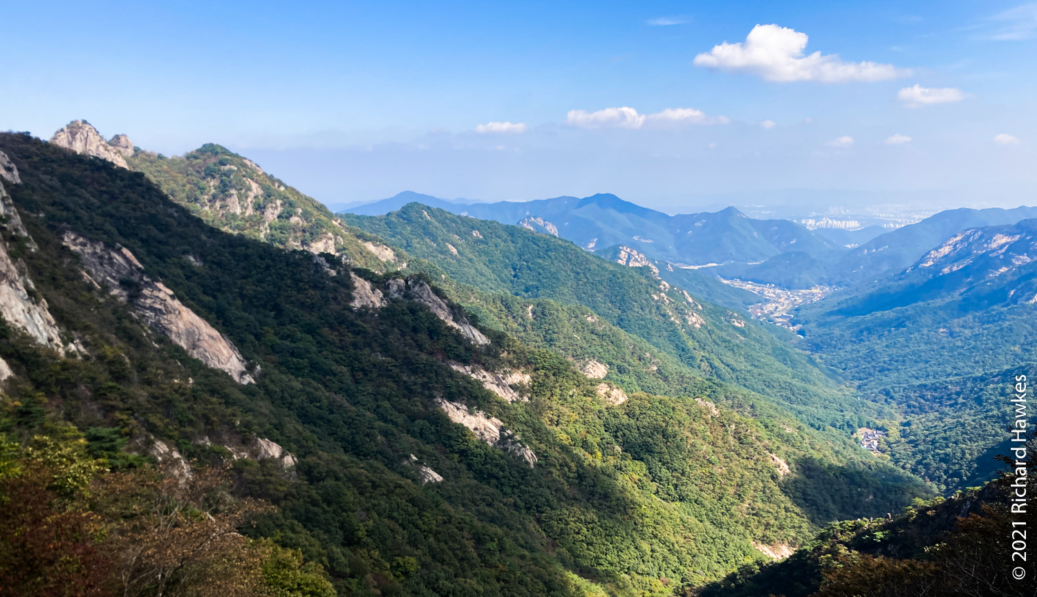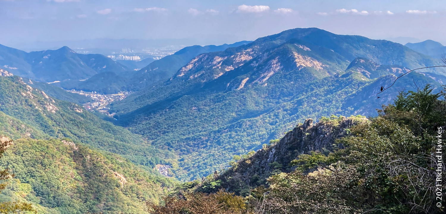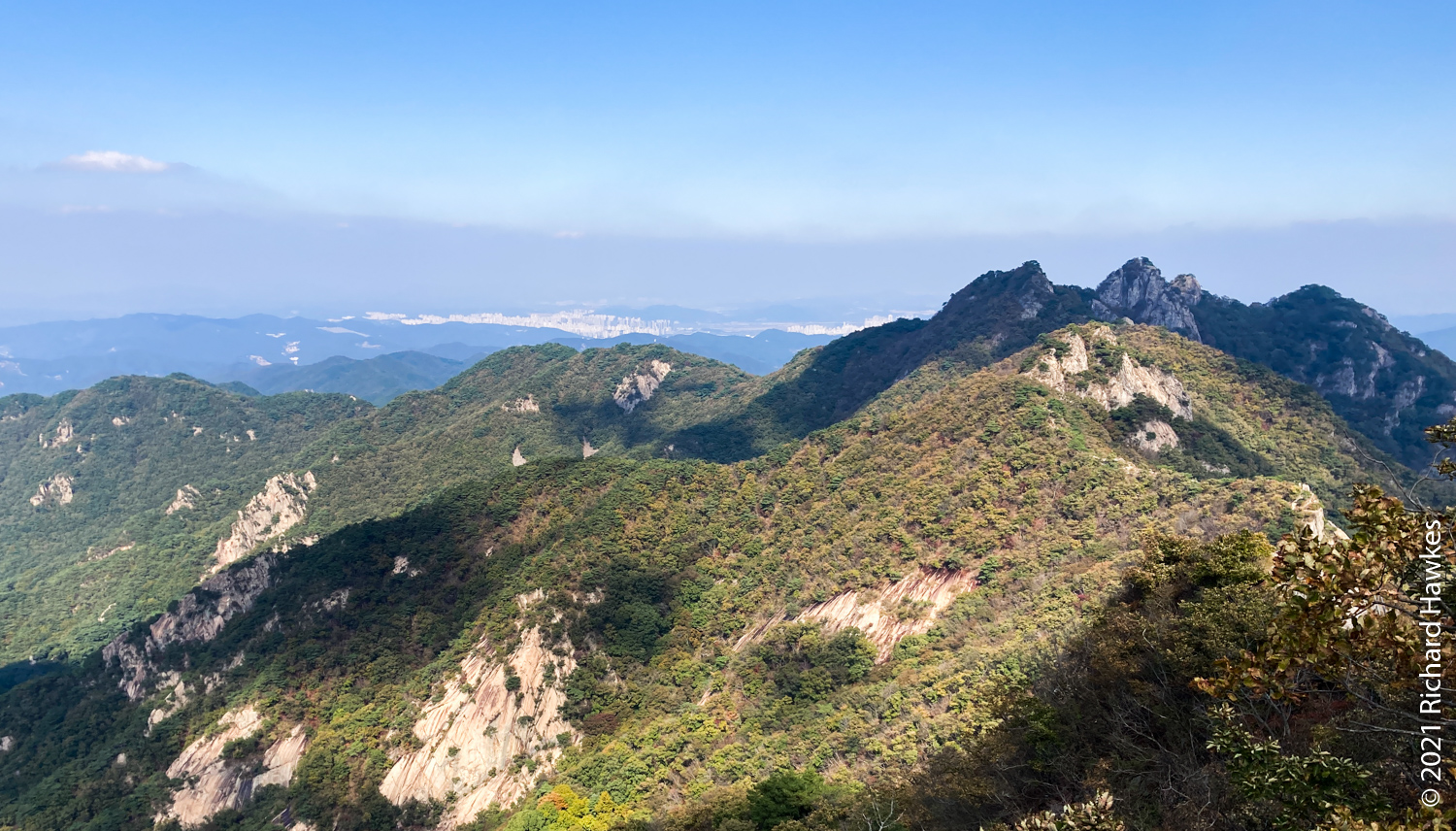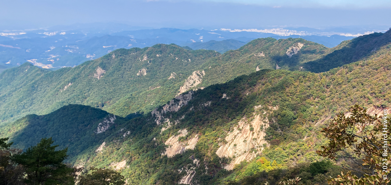 It was now decision time; I’d made pretty good time going up and I’d rather go down a different route but wasn’t sure of the layout. Since I was already up, I decided to head north to Sambulbong (삼불봉) and loop back to the the Donghaksa temple entrance. I pretty much ran down the stairway since I didn’t want to out all day! I made good time then had to slow for the steep ascents, some rocky, some stairs. By the time I got to the second peak, the air was getting quite hazy; I could appreciate the views, but my iPhone SE didn’t.