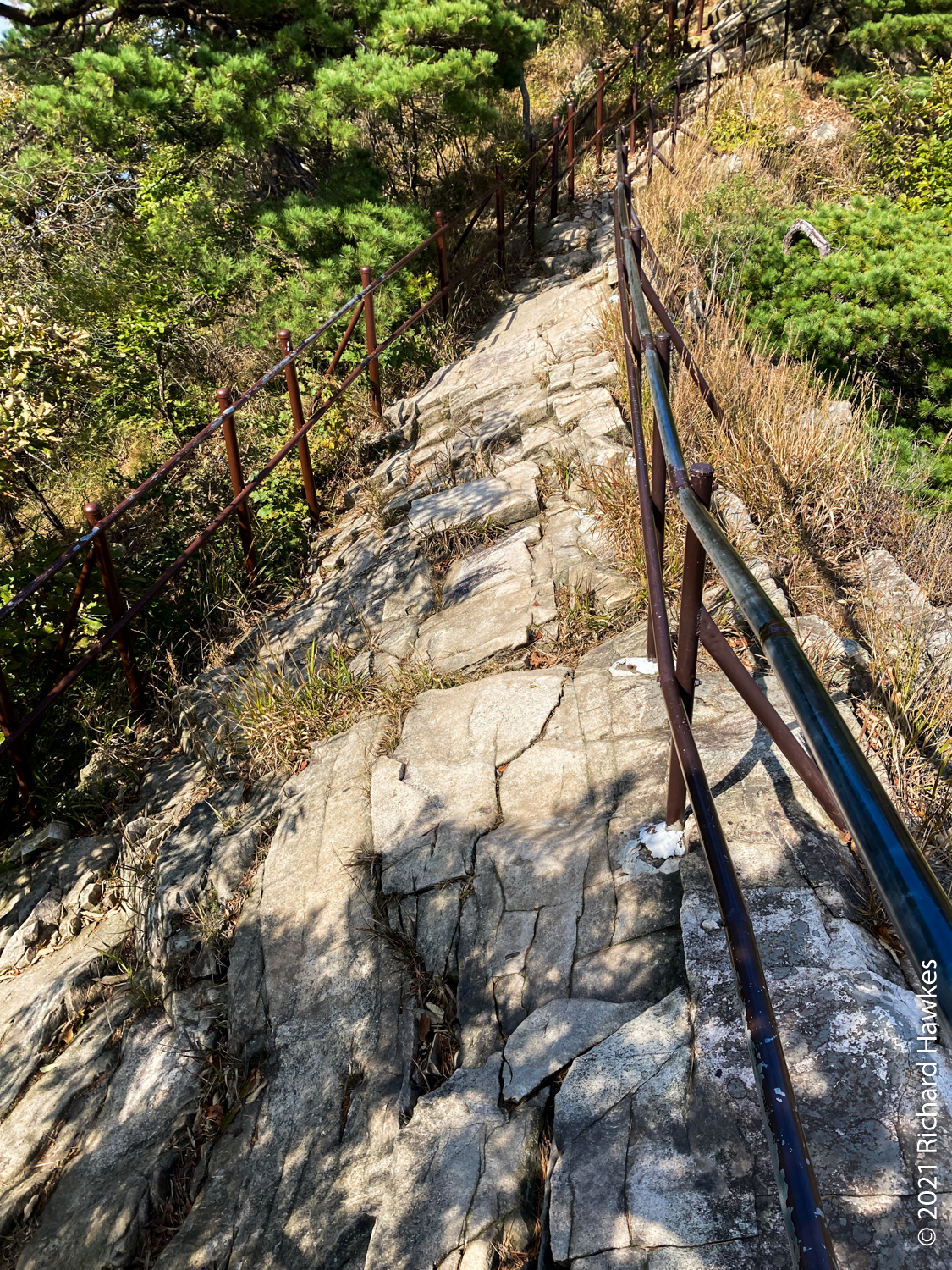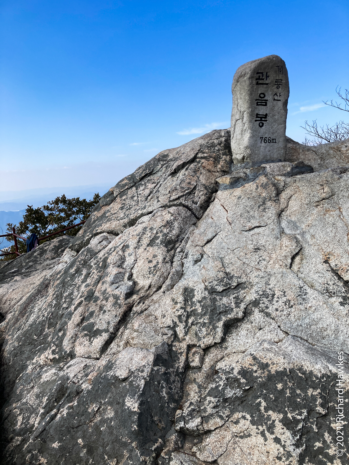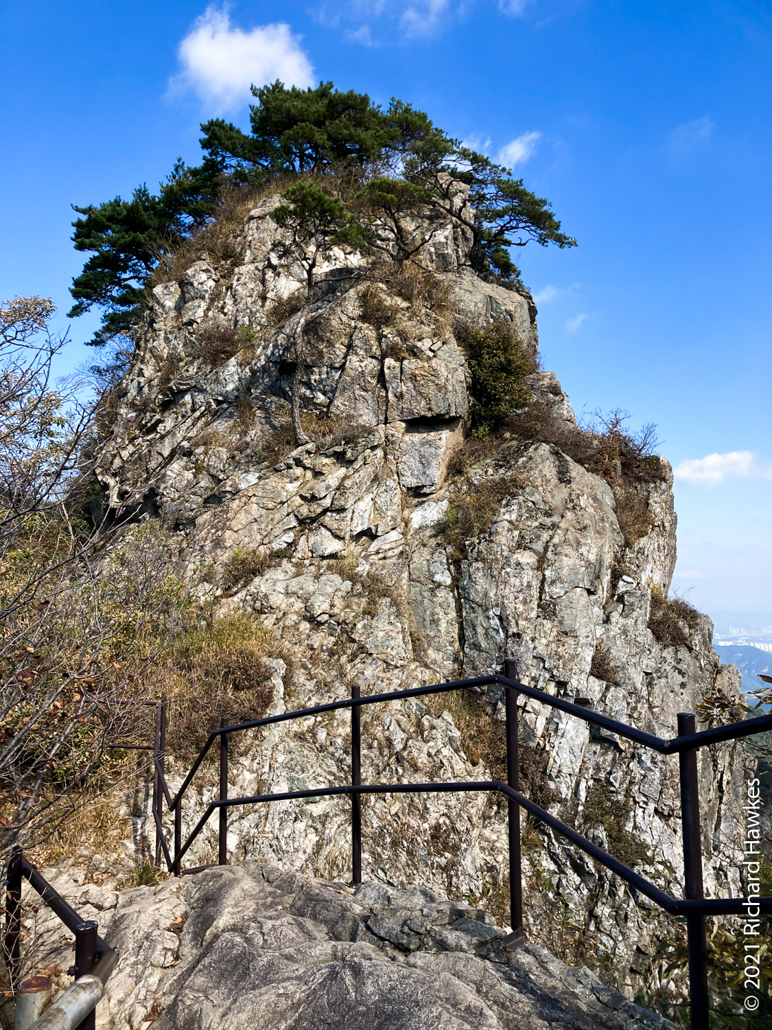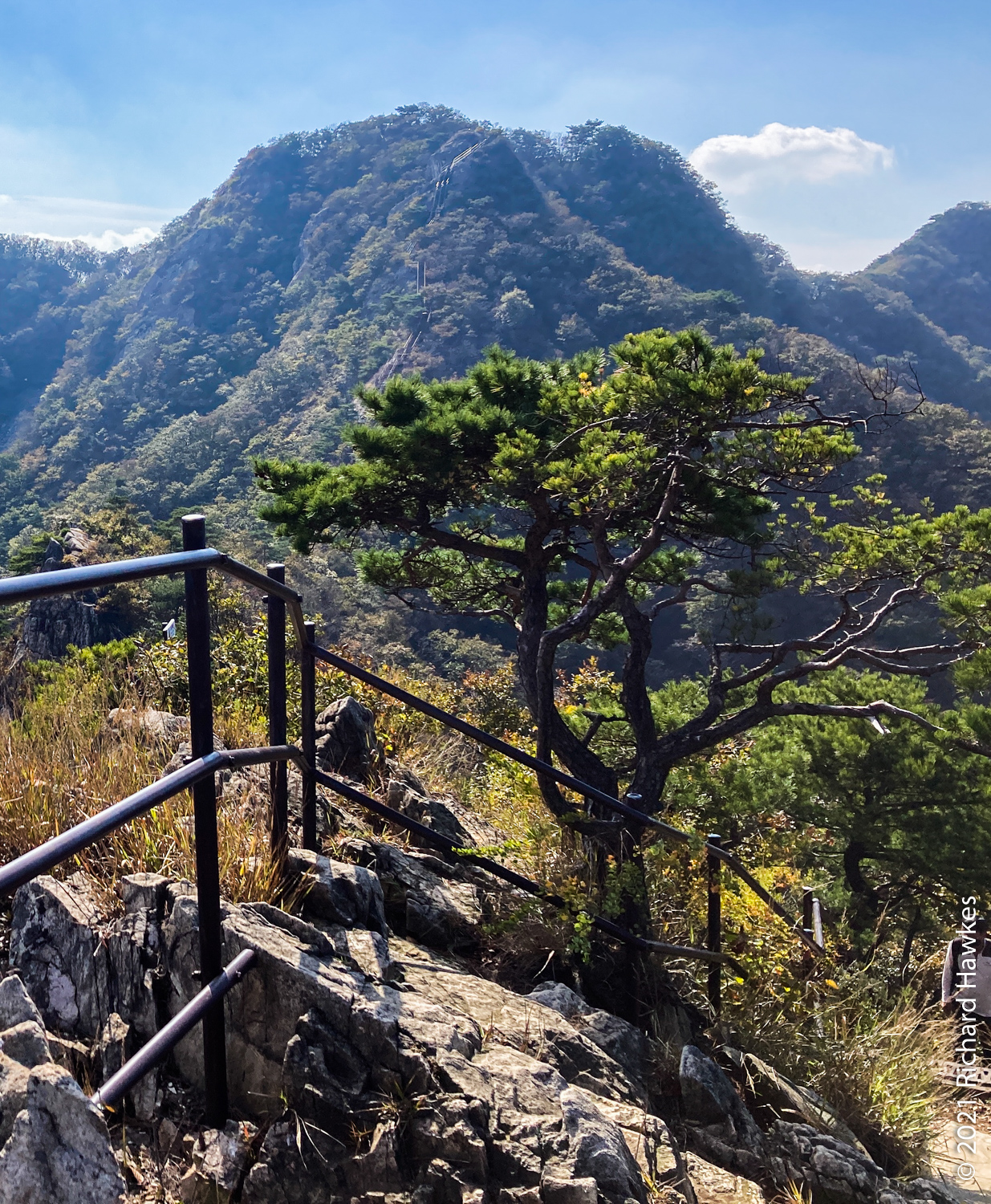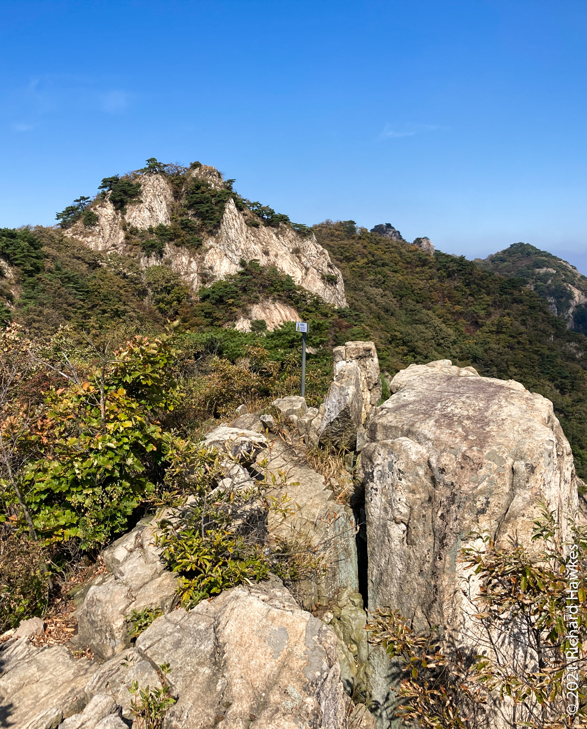 It was now decision time; I’d made pretty good time going up and I’d rather go down a different route but wasn’t sure of the layout. Since I was already up, I decided to head north to Sambulbong (삼불봉) and loop back to the the Donghaksa temple entrance. I pretty much ran down the stairway since I didn’t want to out all day! I made good time then had to slow for the steep ascents, some rocky, some stairs. By the time I got to the second peak, the air was getting quite hazy; I could appreciate the views, but my iPhone SE didn’t.