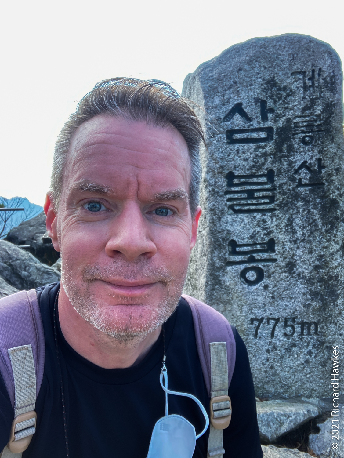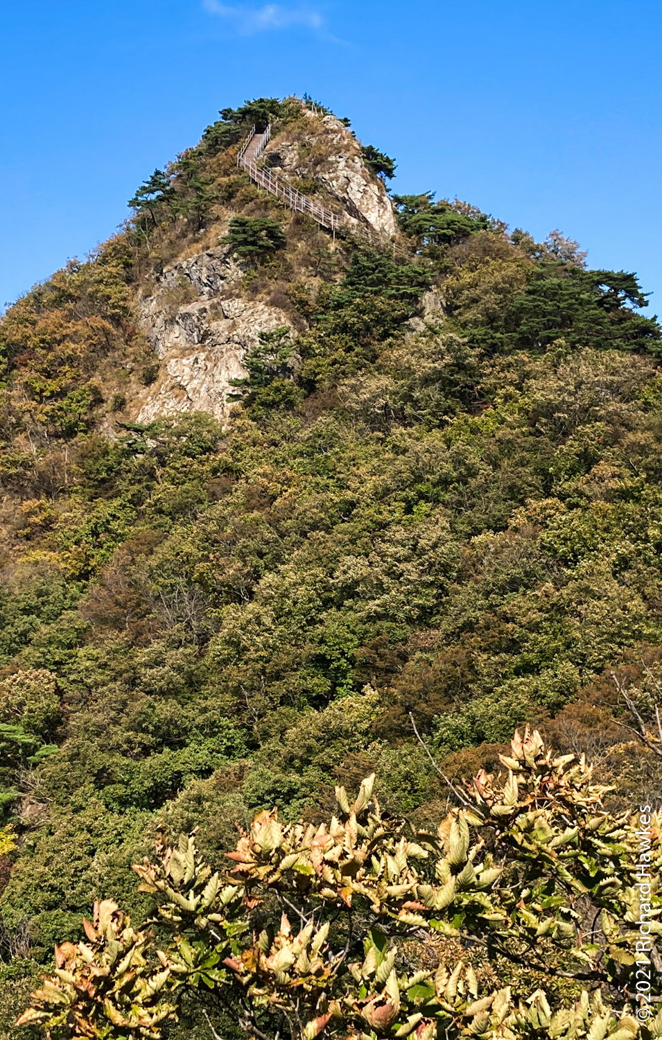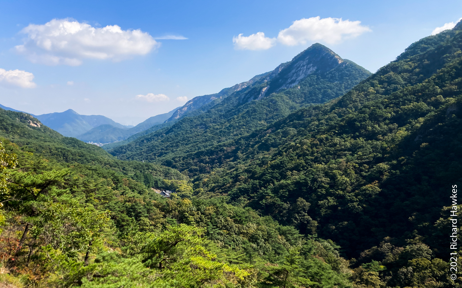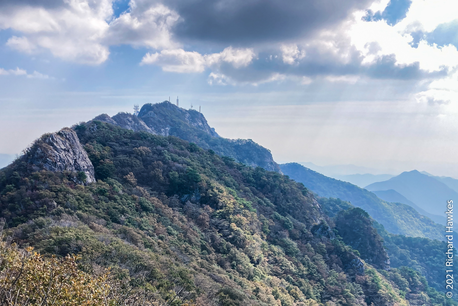 It was now decision time; I’d made pretty good time going up and I’d rather go down a different route but wasn’t sure of the layout. Since I was already up, I decided to head north to Sambulbong (삼불봉) and loop back to the the Donghaksa temple entrance. I pretty much ran down the stairway since I didn’t want to out all day! I made good time then had to slow for the steep ascents, some rocky, some stairs. By the time I got to the second peak, the air was getting quite hazy; I could appreciate the views, but my iPhone SE didn’t.