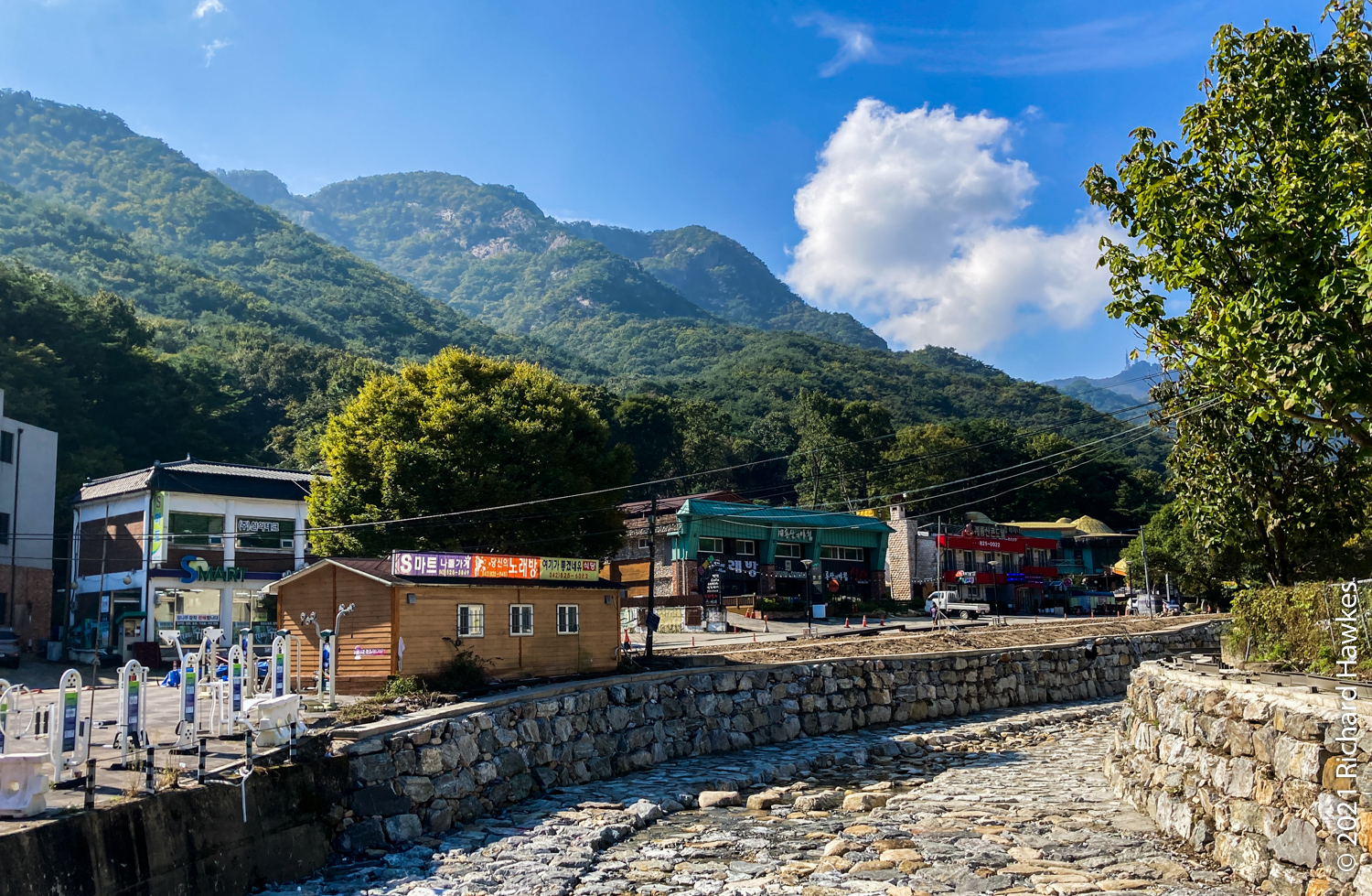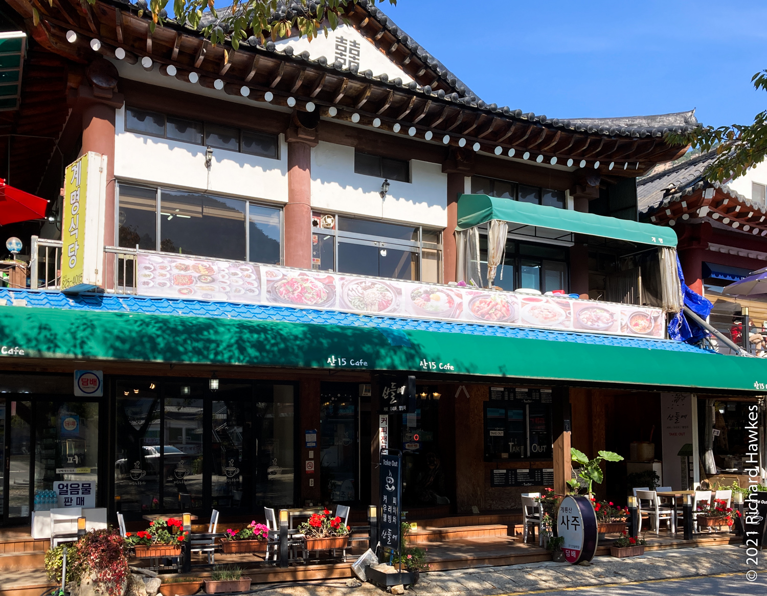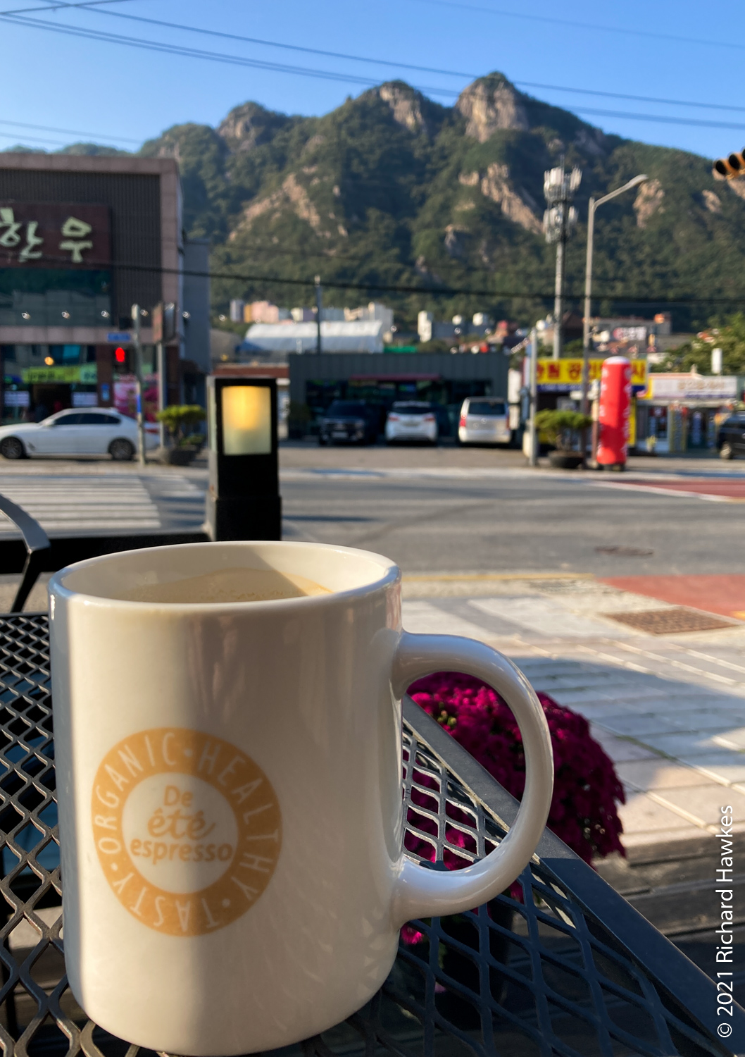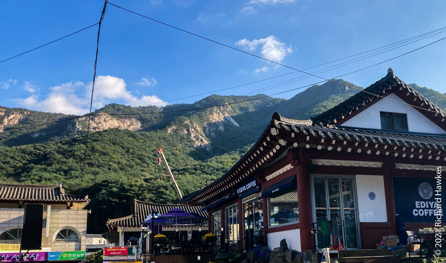 After this fast push, it was a relatively easy hike back via Sangwonam hermitage (상원암). There was construction going on so I only posted a picture of one of the pagodas. In about 30 minutes, I was back on the road and took a quick look at Donghaksa temple. Once I got to the car, I drove slowly with hazards on (yes, I know…) looking for decently located coffee shop. I found De Ete Espresso along the main road. It had a seating area out front. Traffic was a bit heavy but it had a pretty full view of Gyeryongsan. I took a stroll after the coffee and saw there were lots of accommodation in the area. I contemplated staying the night for decinet mountain food but decided against it (money).