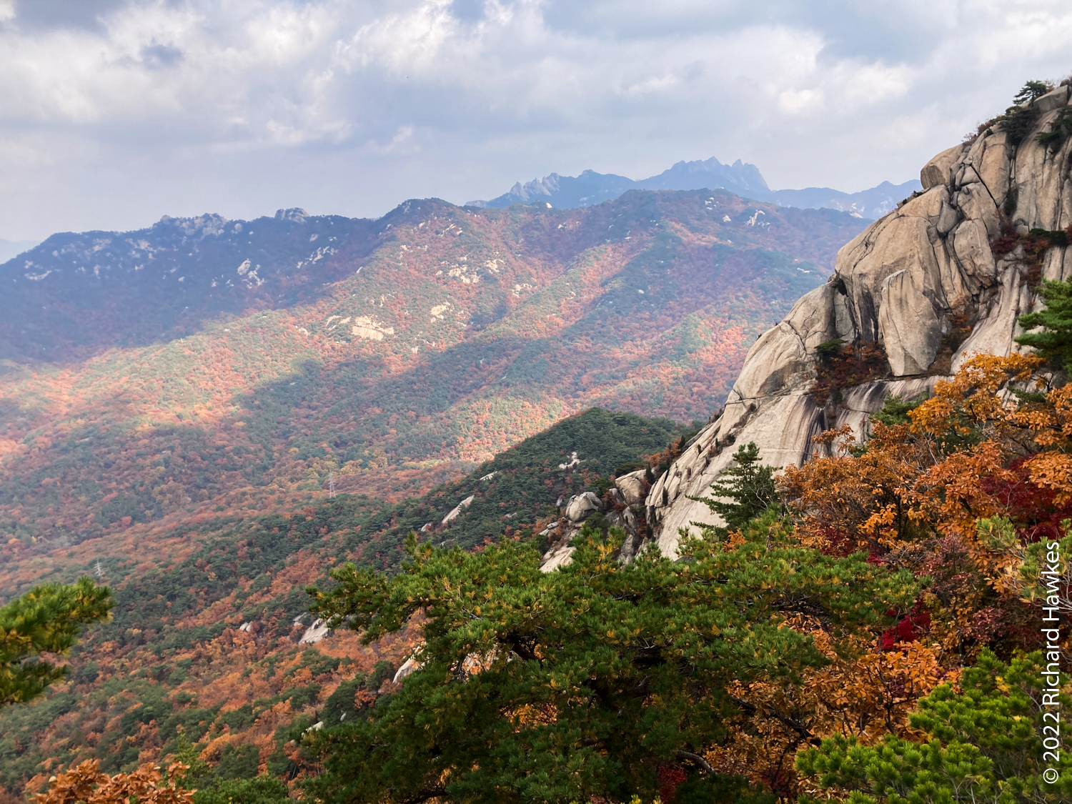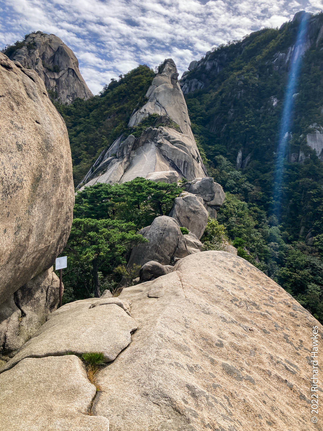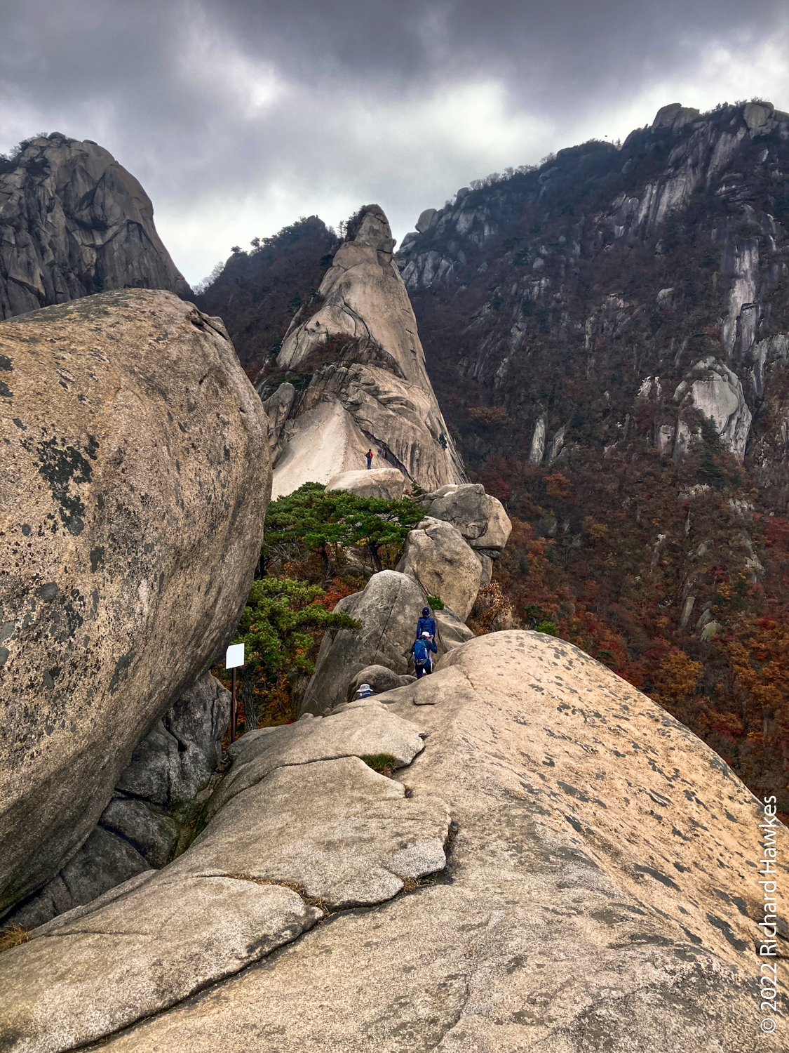 There are lots of interesting rock formations and nice selection of options to go up and along the ridge before you head down. The route can be a bit challenging if you go one way rather than another. I’ve tried a few ways; one goes right on the right-hand edge on a cliff. Just watch your step! Getting down can be tricky; it’s very steep and will require you to hold on tightly to the handrails if you’re a nervous with hights like me! You descend into a narrow valley and to a three-way intersection. Here you can go back west through a valley; pleasant in the autumn. The other route takes you directly up towards the entrance to Baegundae. This hike up is quite hard going but not technically difficult.