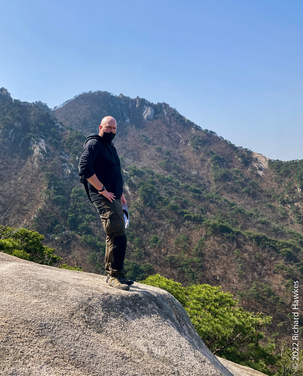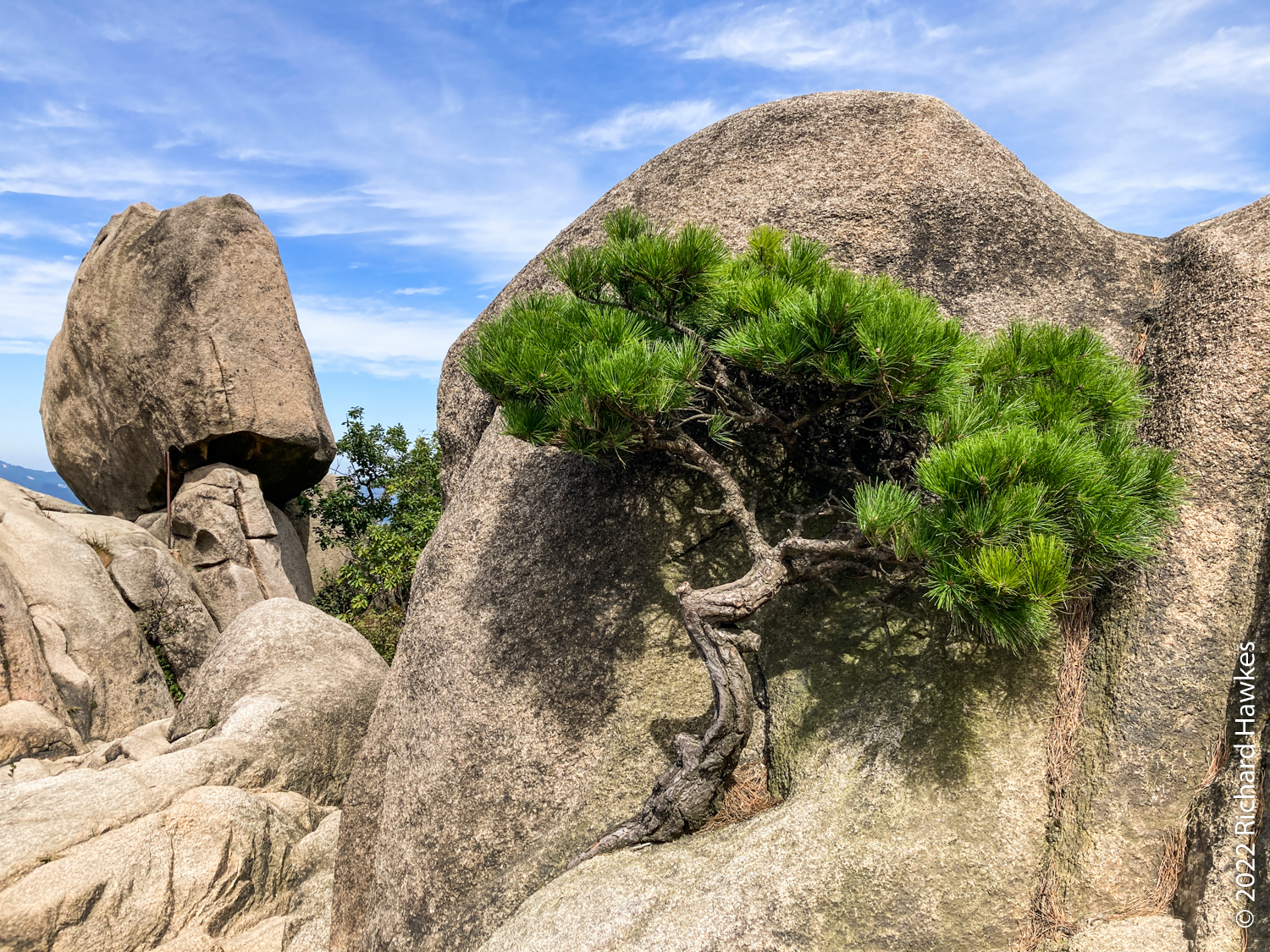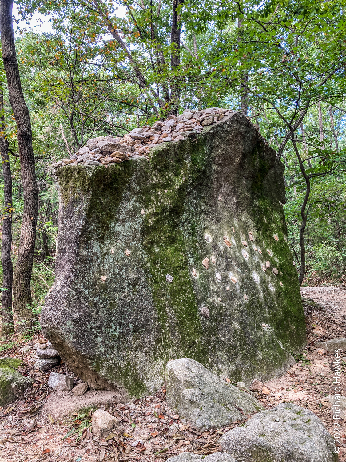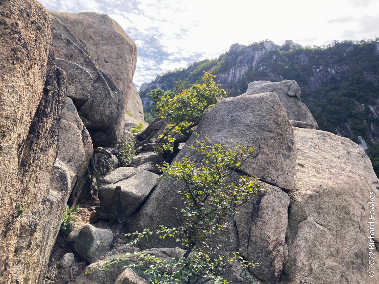 To get here, you take the blue 704 bus from Bulgwang Station in Seoul to Hyoja 2-dong bus stop on the west side of Bukhansan national park. From there, head east following my AllTrails recording. On the way I saw a novel way of placing stones on rocks; balanced on the sides of a larger rock and some on top. I don’t know why people do this but it looks interesting.