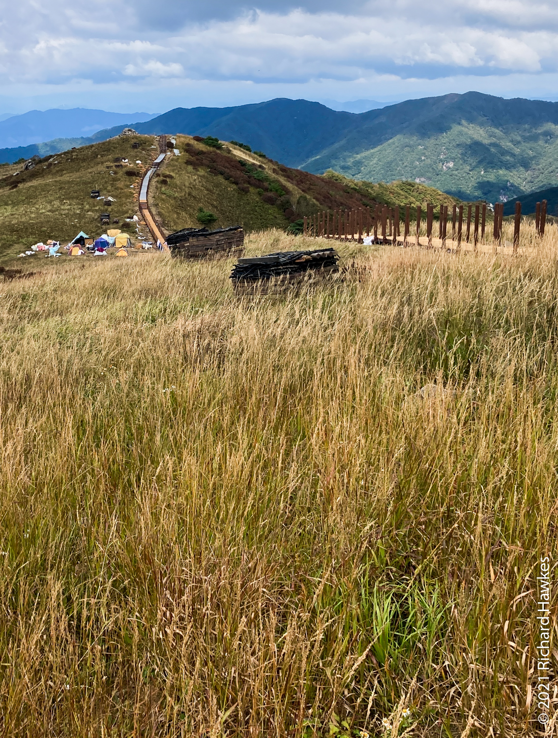 The peak is flat with a rock marking the spot of course. I had my picnic up there, then wandered towards some tents I saw coming in; there was a work crew up there building or replacing a walkway designed to keep people off the grass. Seems like a big project. Also, must be pretty nice to spend a night or two up there.