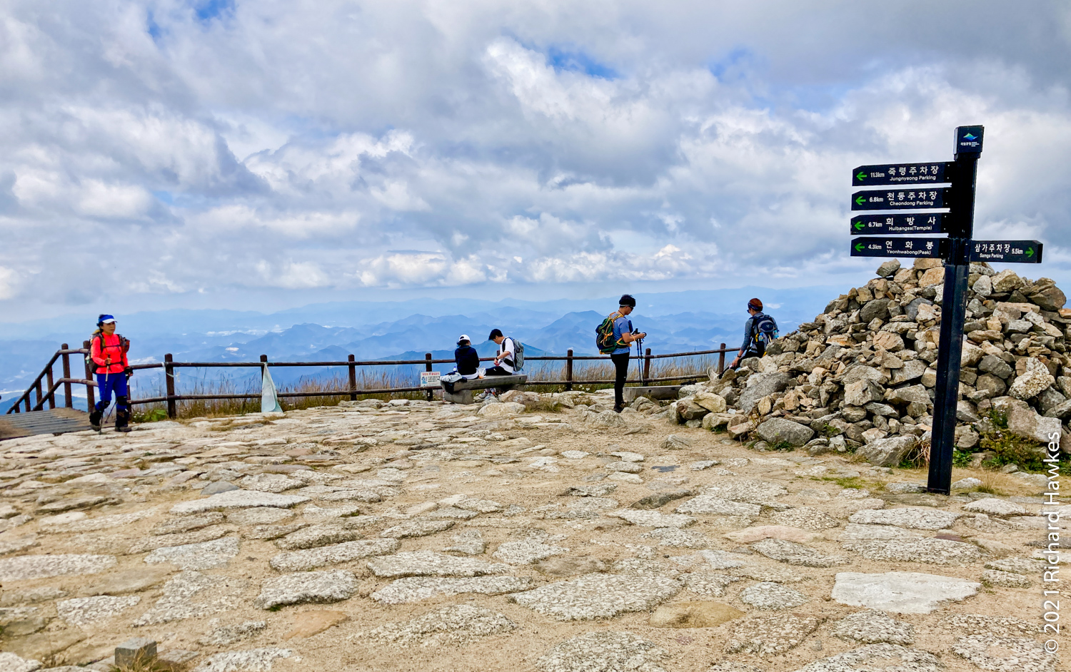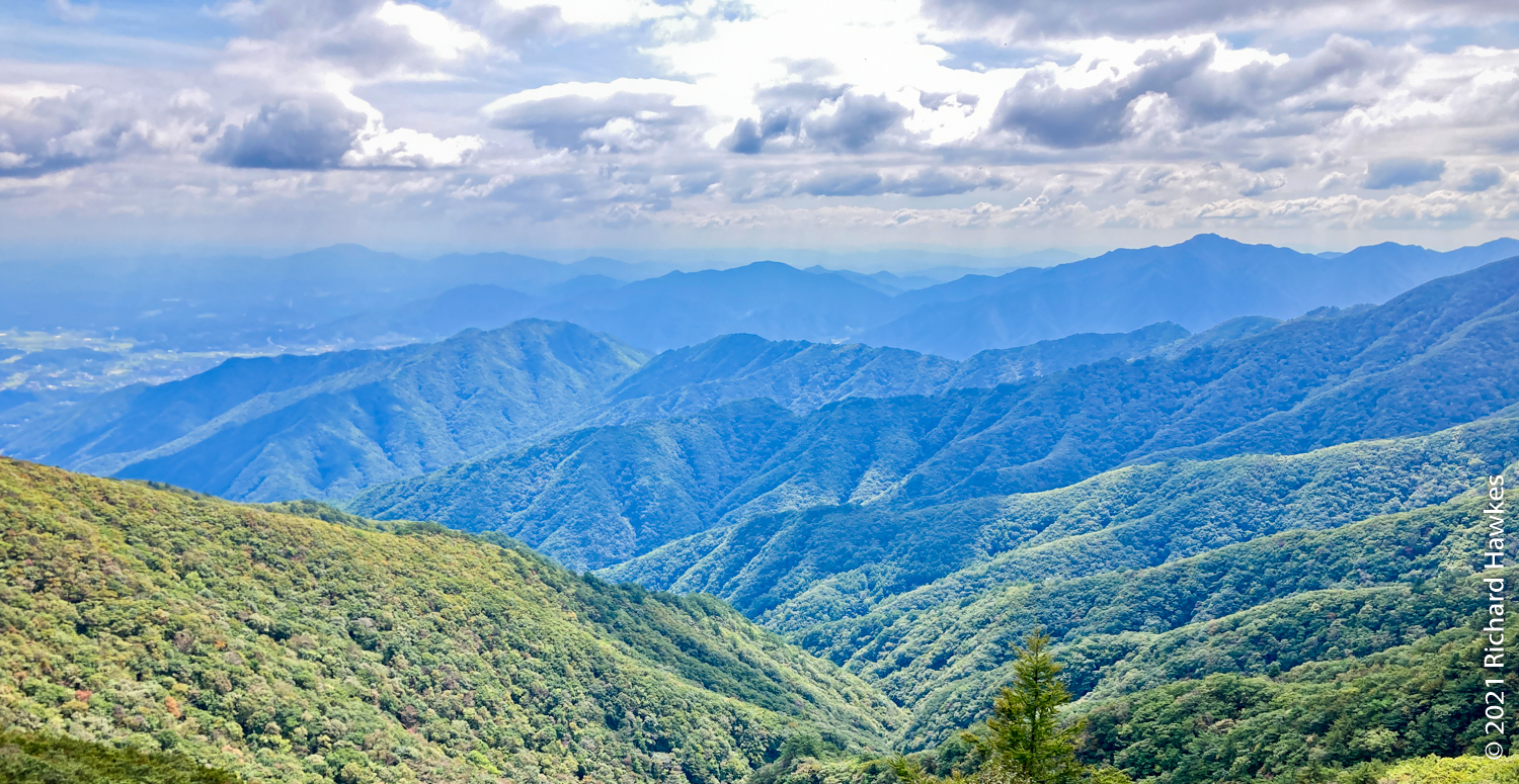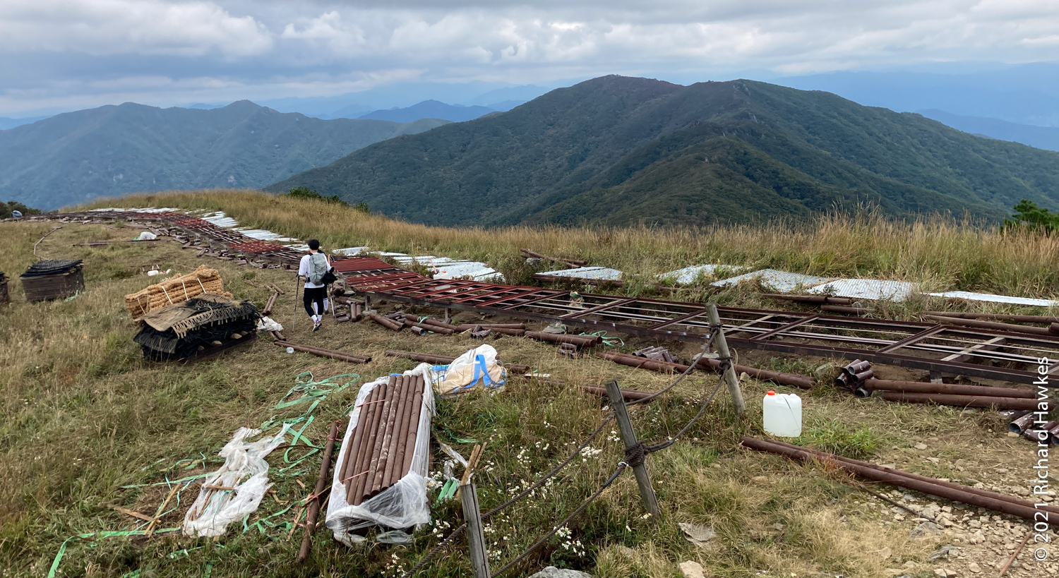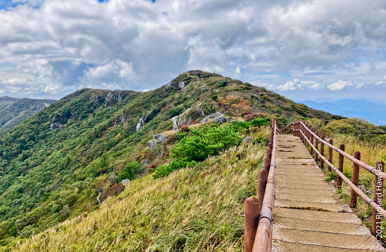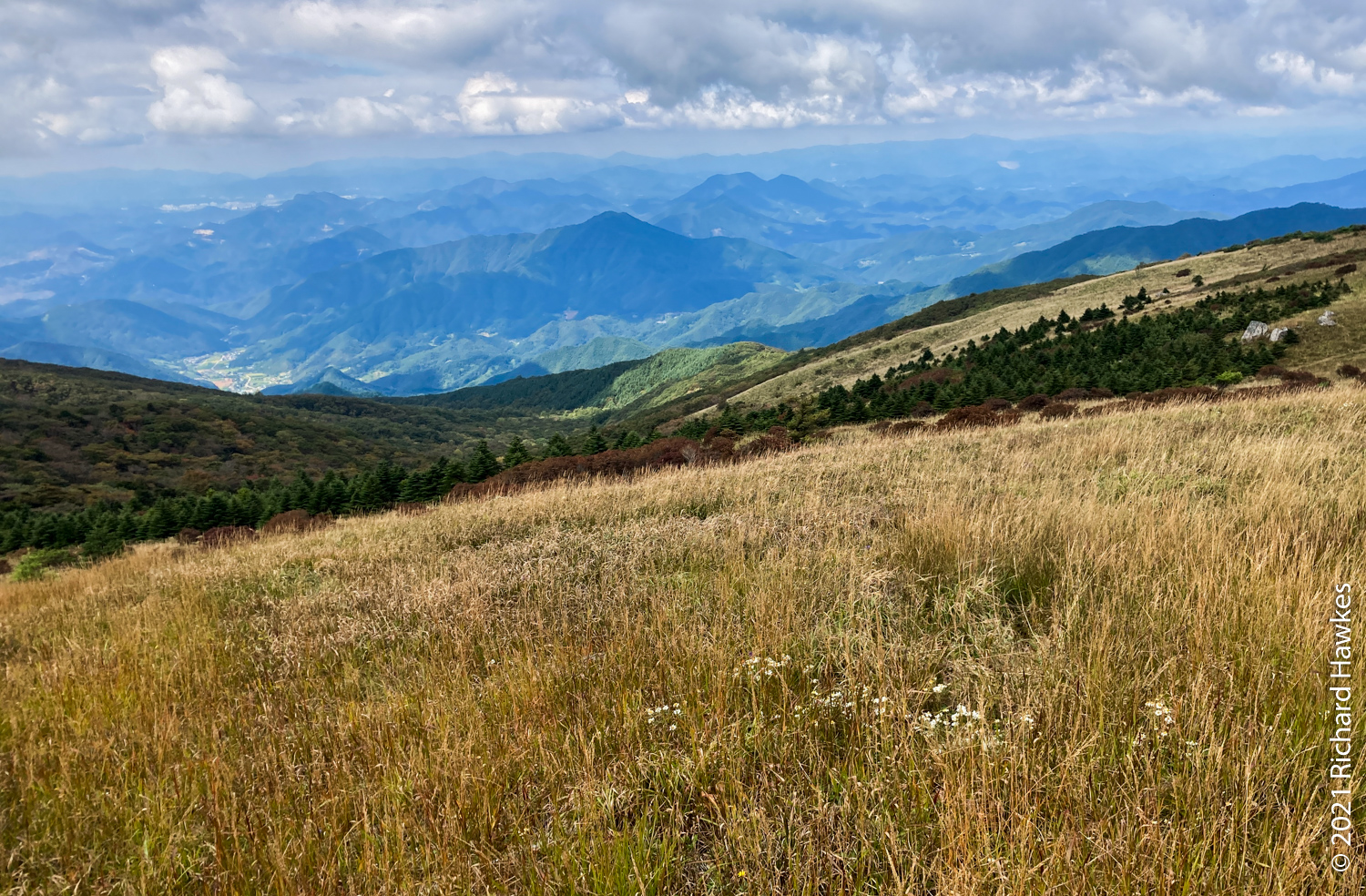The top is pretty unique in my mountain hiking experience in Korea; it’s a large hillside swathe of grassland which drops off either side into lush green valleys.