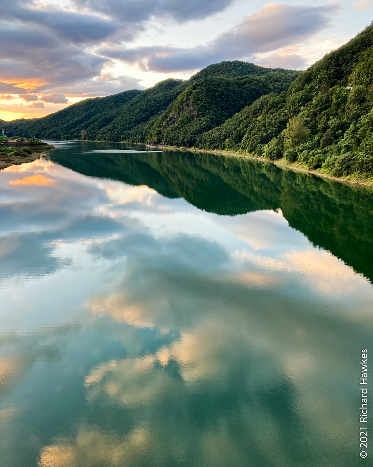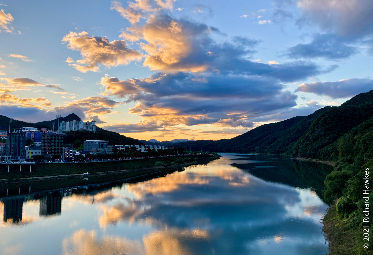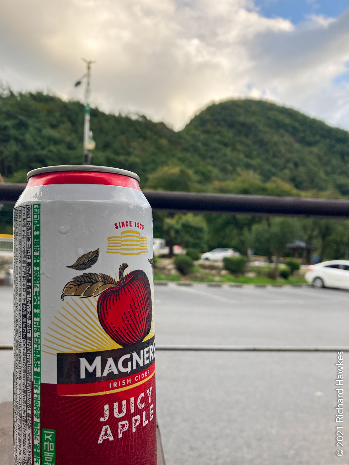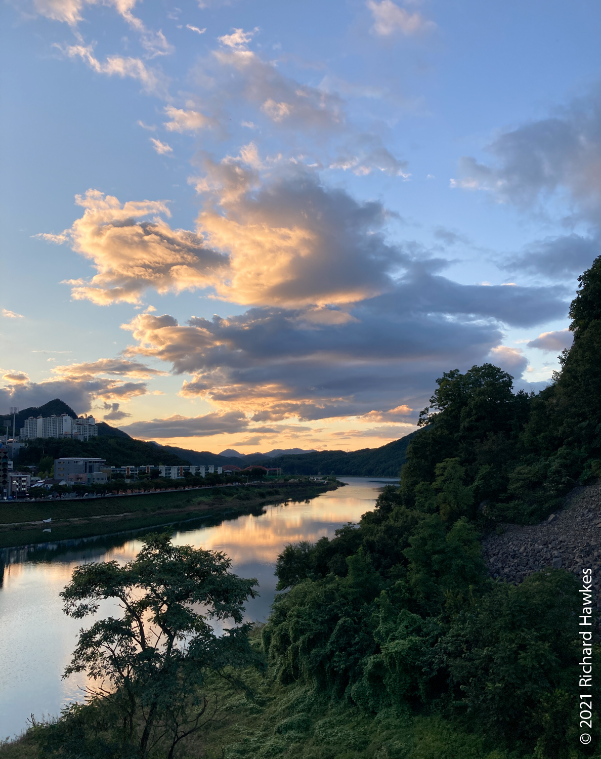 On the drive back to the hostel, I noticed a restaurant area and decided to walk back for a drink and find some food. It took ten minutes to walk from the hostel back to this place. It turned out to be the entrance Gosu Cave (고수동굴). I recognised it as a place I’d visited many years ago with the Adventure Korea travel company. It was an interesting cave trip and thought about doing it again but thought I’d skip it. I grabbed a cold can of cider and sat on the terrace of a convenience store. There were restaurants and gift shops on the strip but no food options that appealed to me at that time. On the walk back the sun was setting and creating lovely views as walked over the bridge.