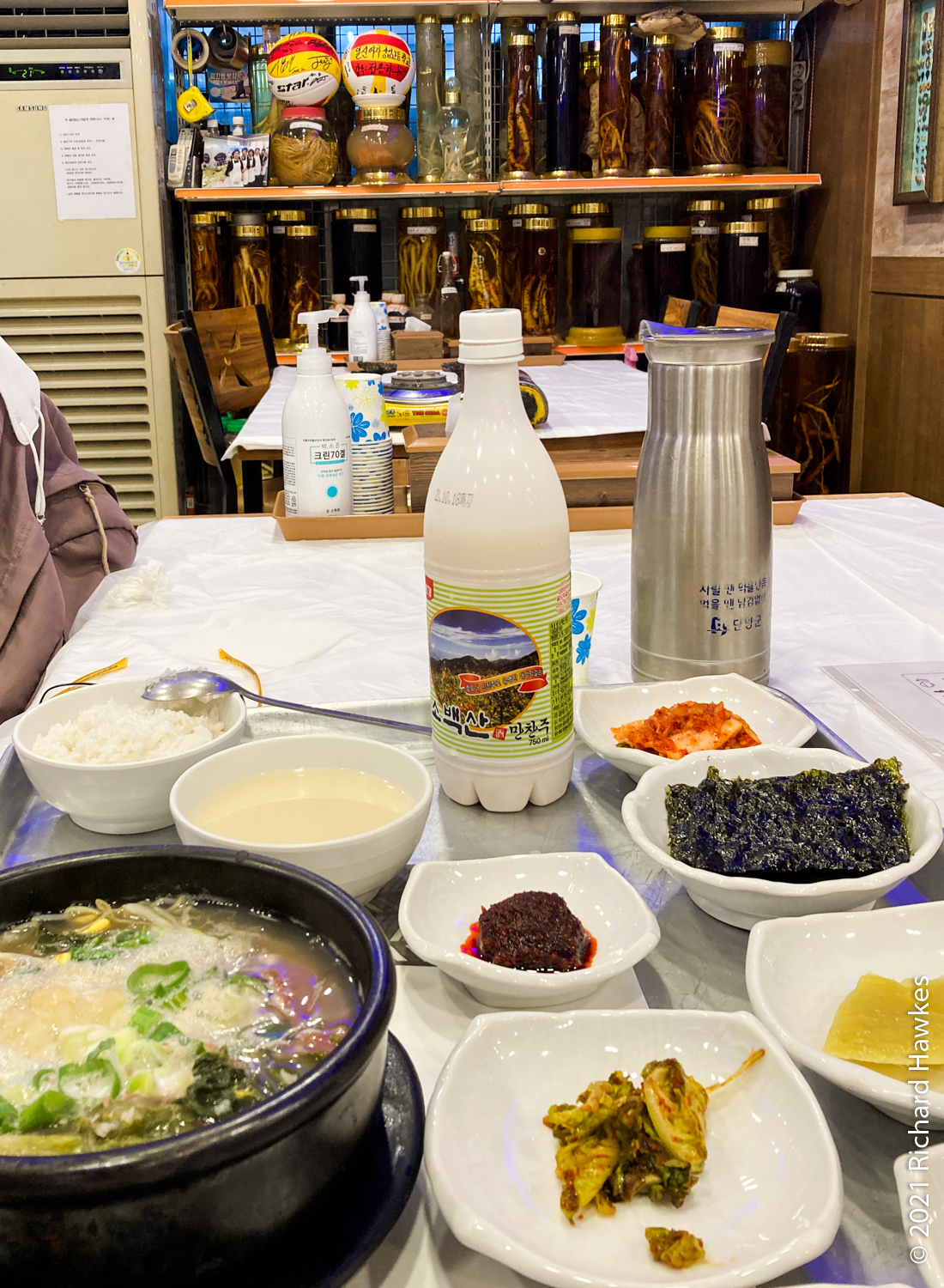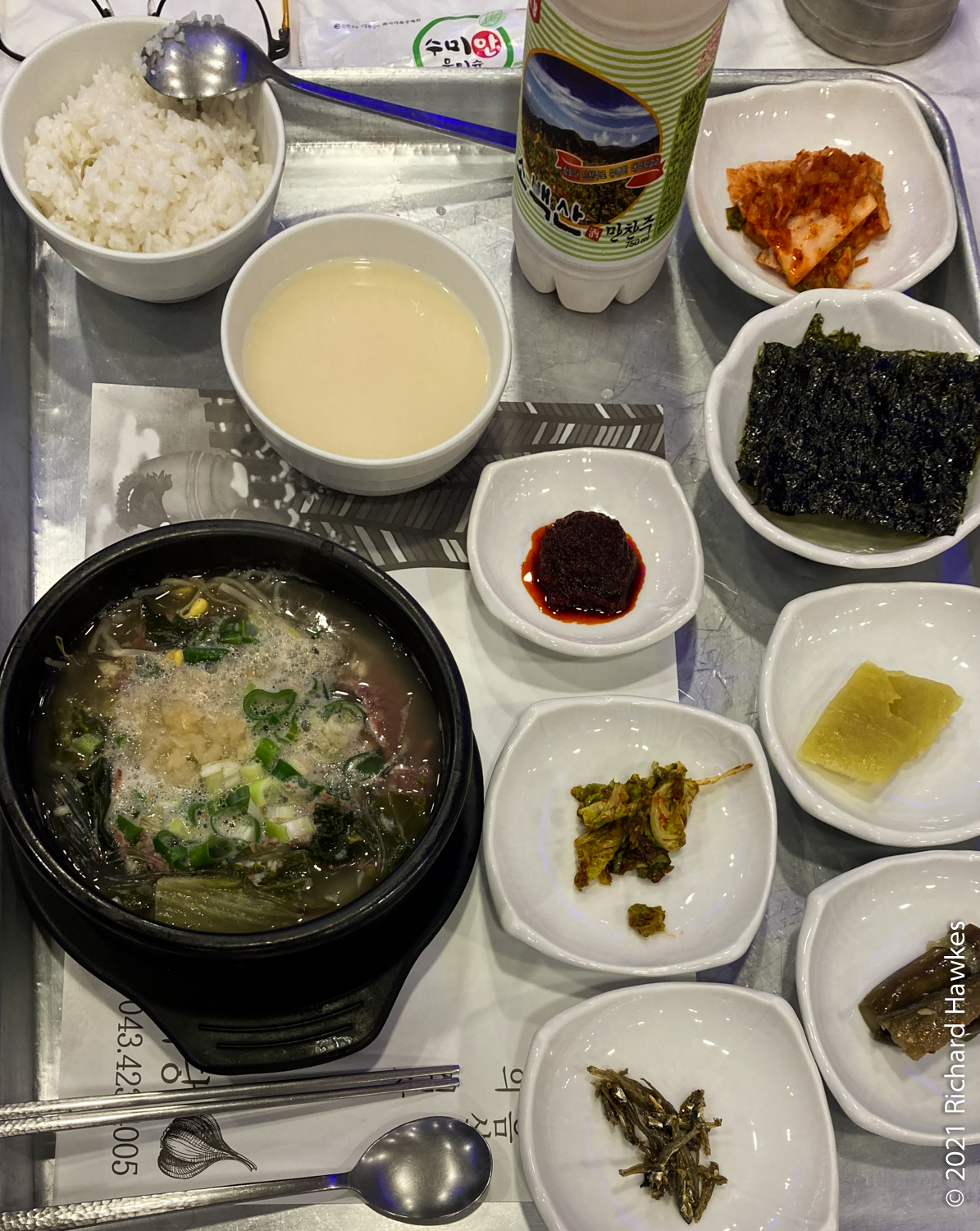 So, I was still needing some food! I walked back to the market but it seemed like only deep fried chicken was available, or places that were closing. I ended up at a place in the same block as my hostel called Daegyo Sikdang (대교식당). Basically ‘Bridge Restaurant’! I got some haejangguk and some local Sobaeksan makgeolli; delicious! I came again.