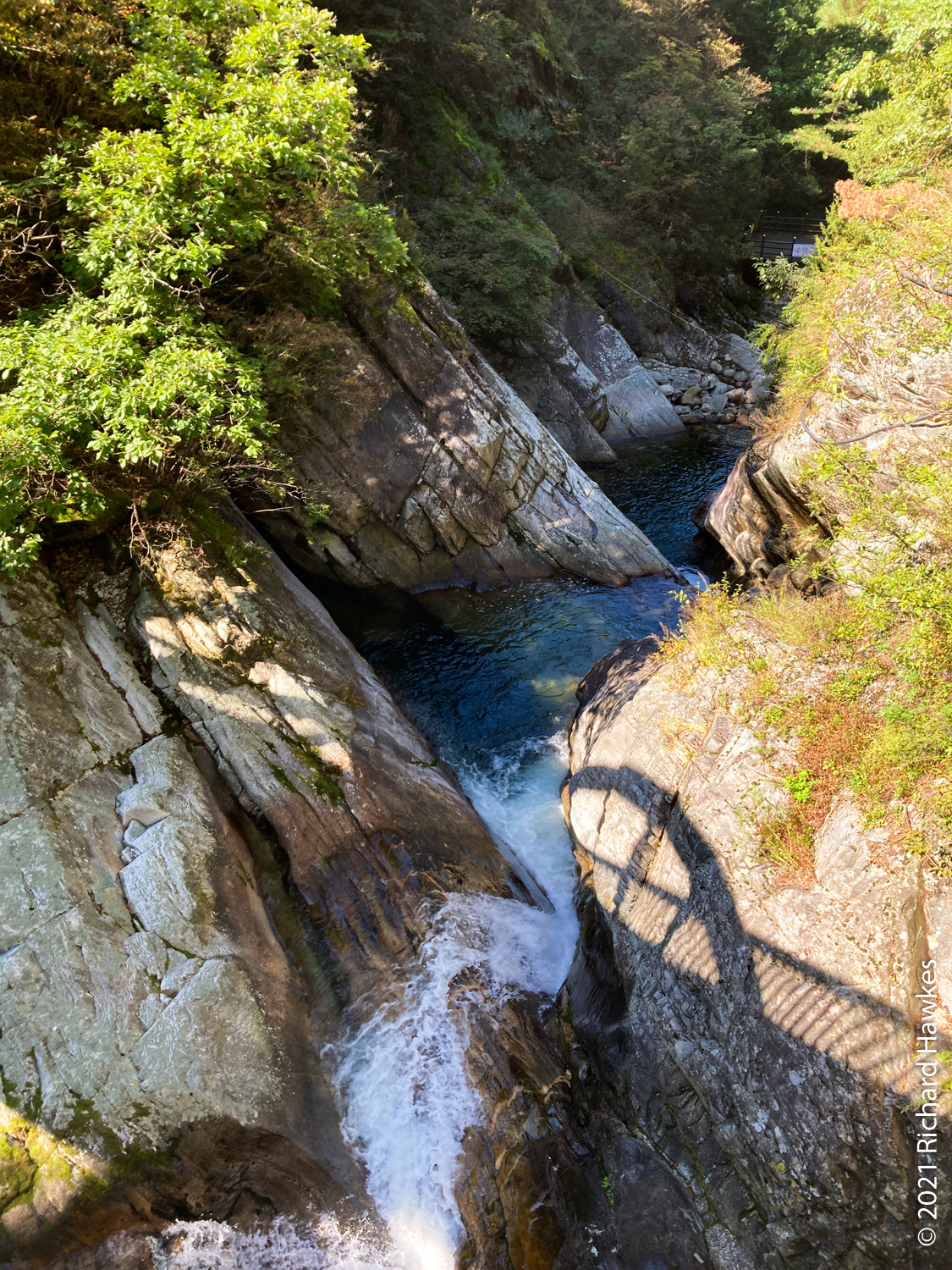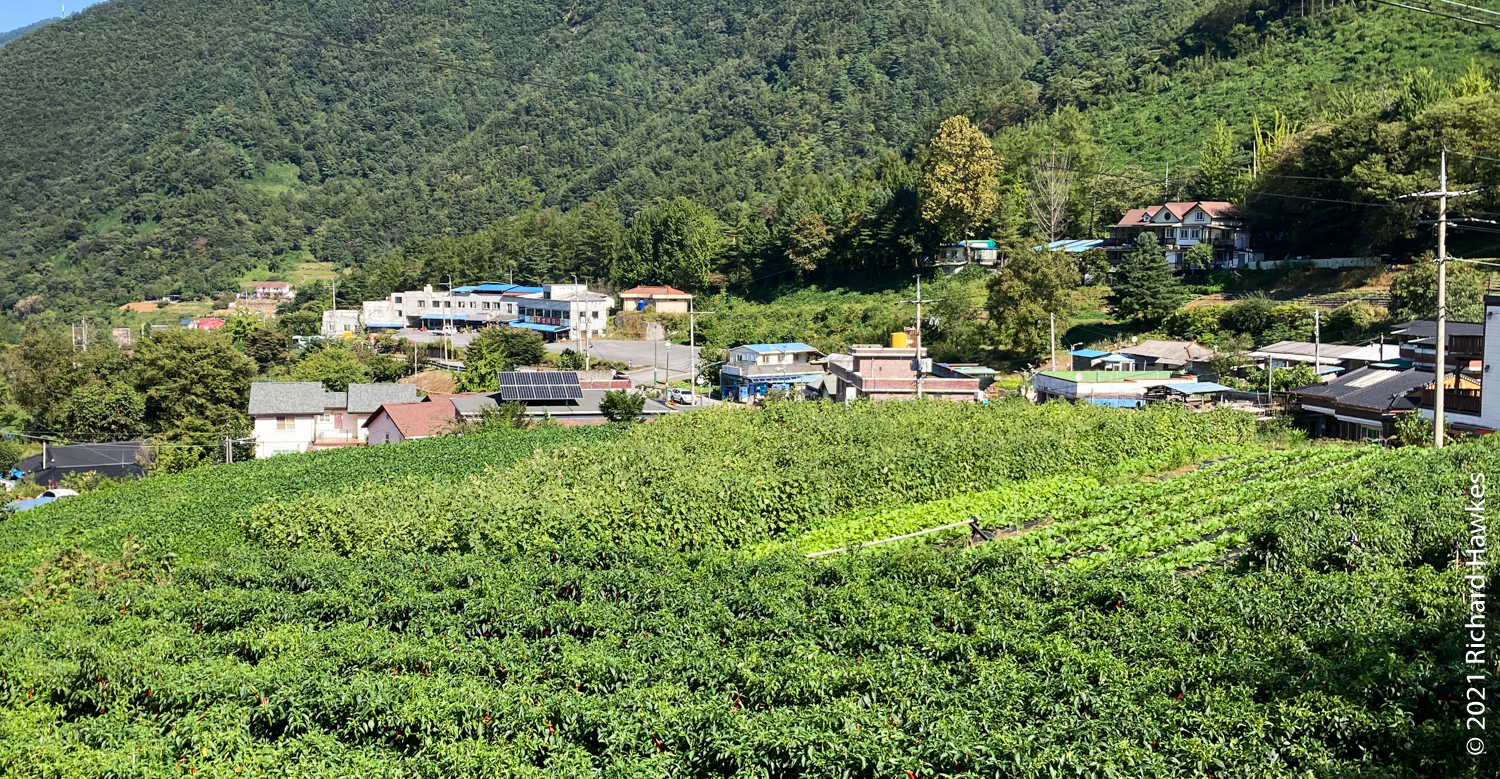 Walking back up the road to the park got me into the hiking mood; I could see houses and farmland in the valley and lots of green hills. There’s a cool waterfall on the way too, that has a small, unusually windy canyon formation called Darian Falls (다리안폭포).