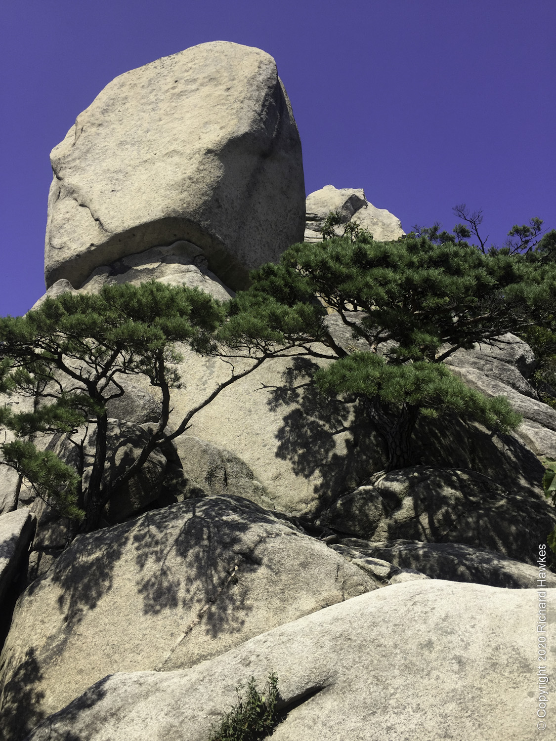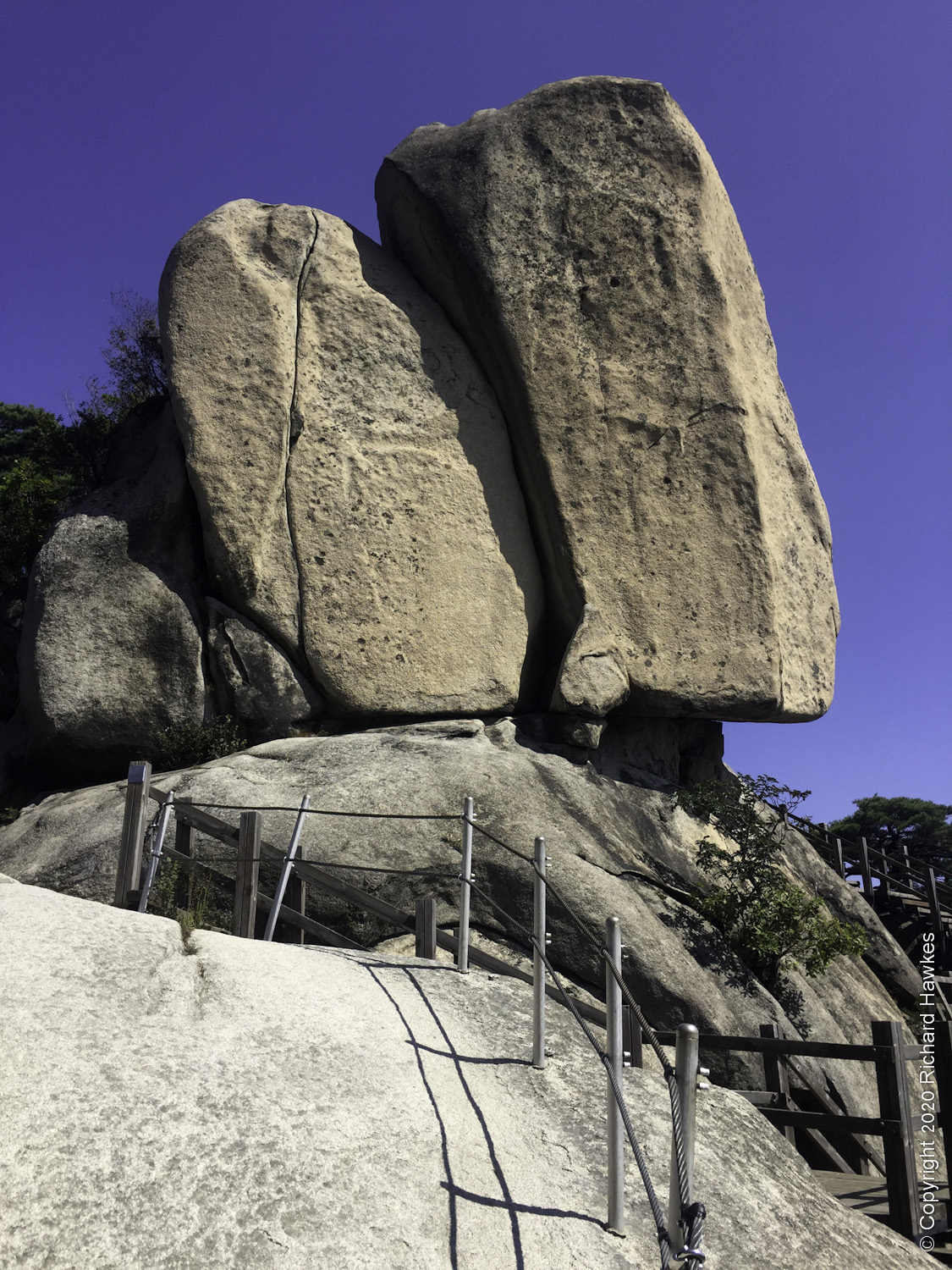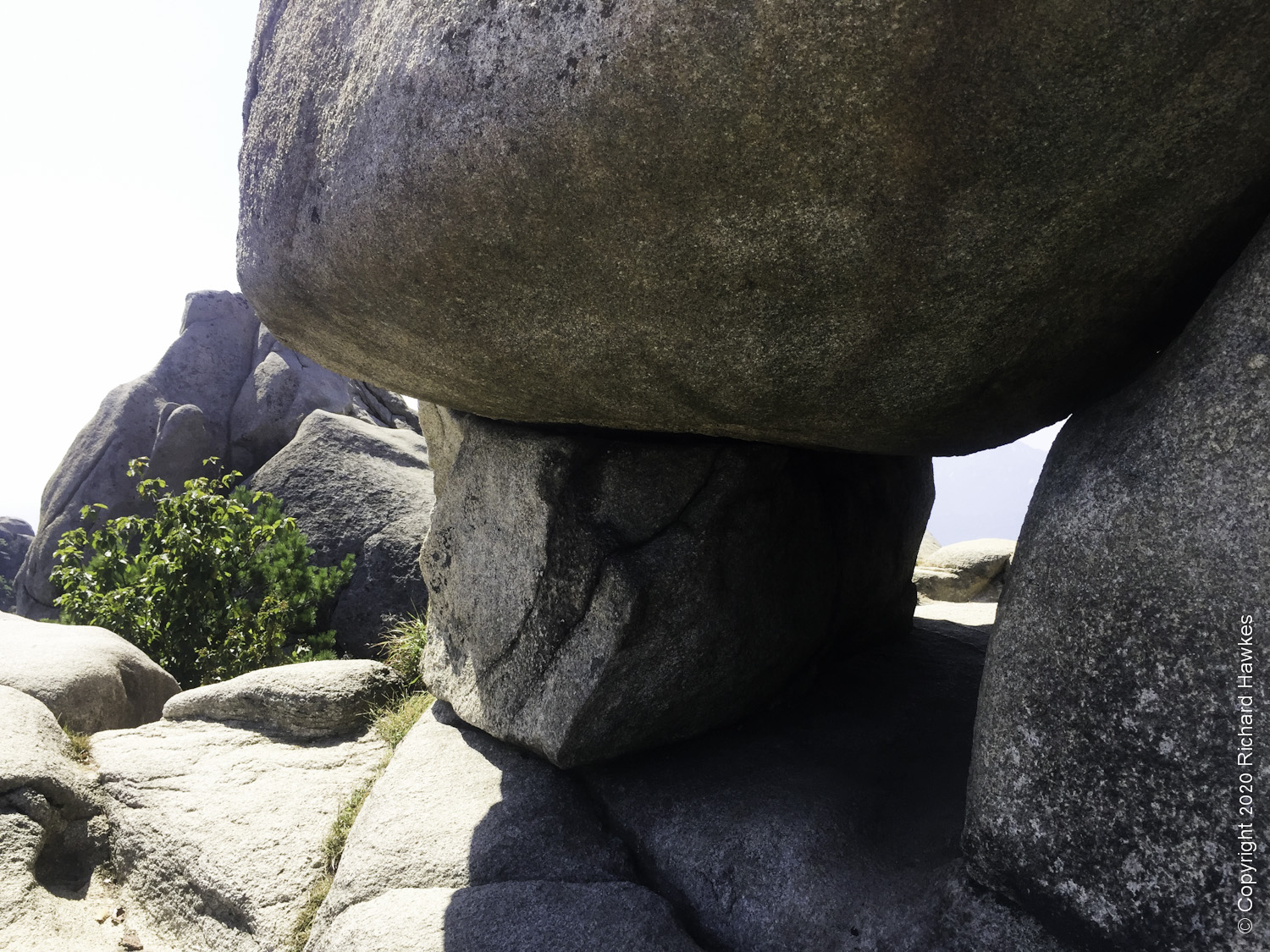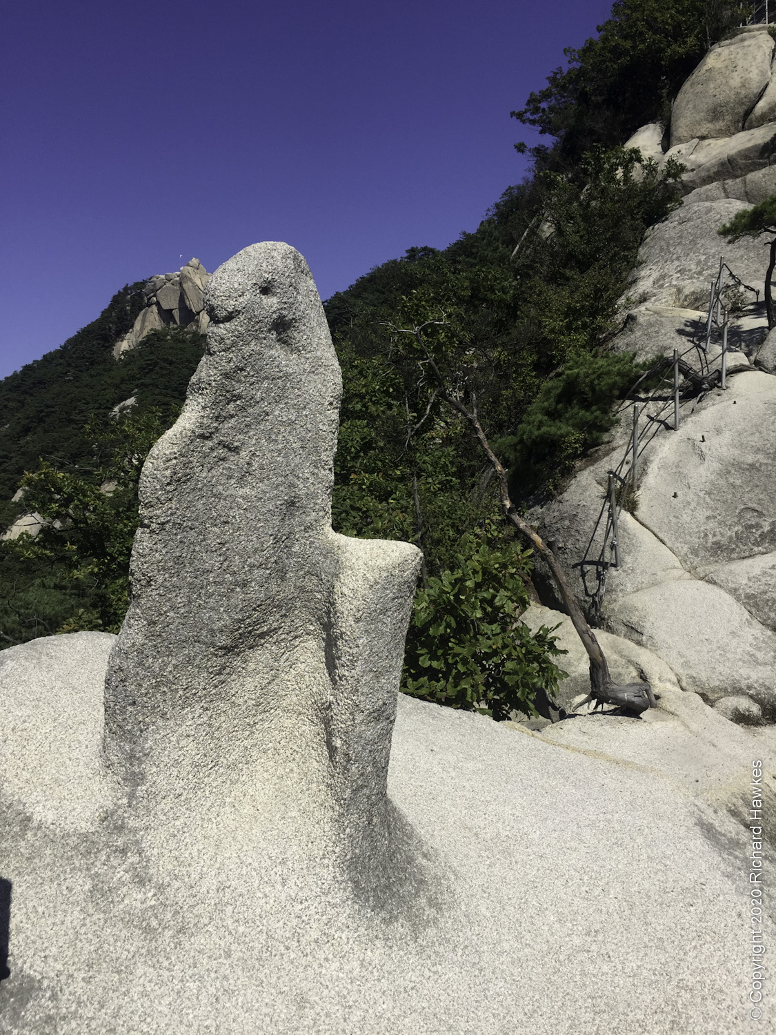 Heading down took me south. There were steps (nice and easy) but then some choices. There were railings that ran down some extremely steep granite and I wasn’t entirely sure of the best way to take. I knew I didn’t want to go to far east so even though I had slowly gone down a stretch of granite (hard going), I opted to head back up and try an alternative route. This was a bit easier and there were some great rocks sitting in the blistering heat.