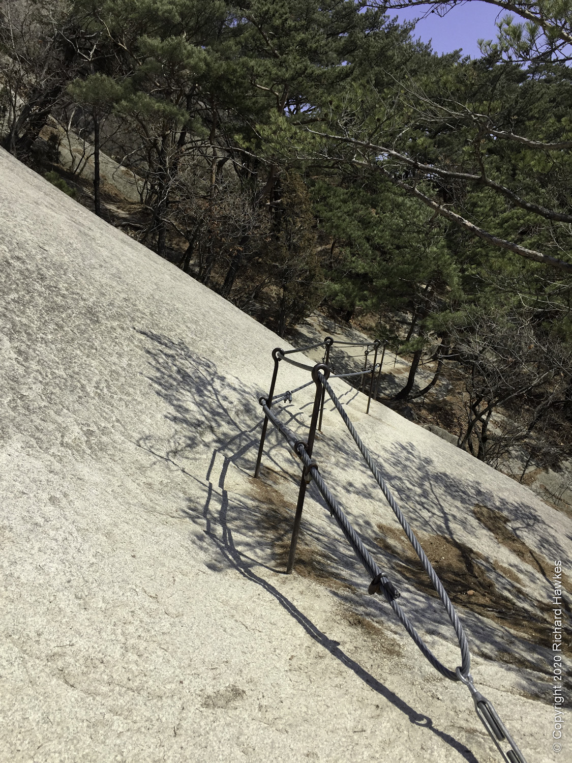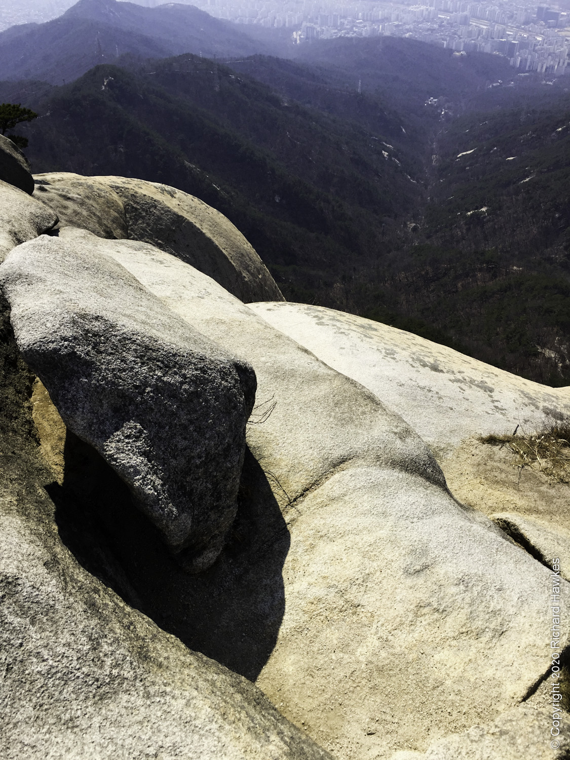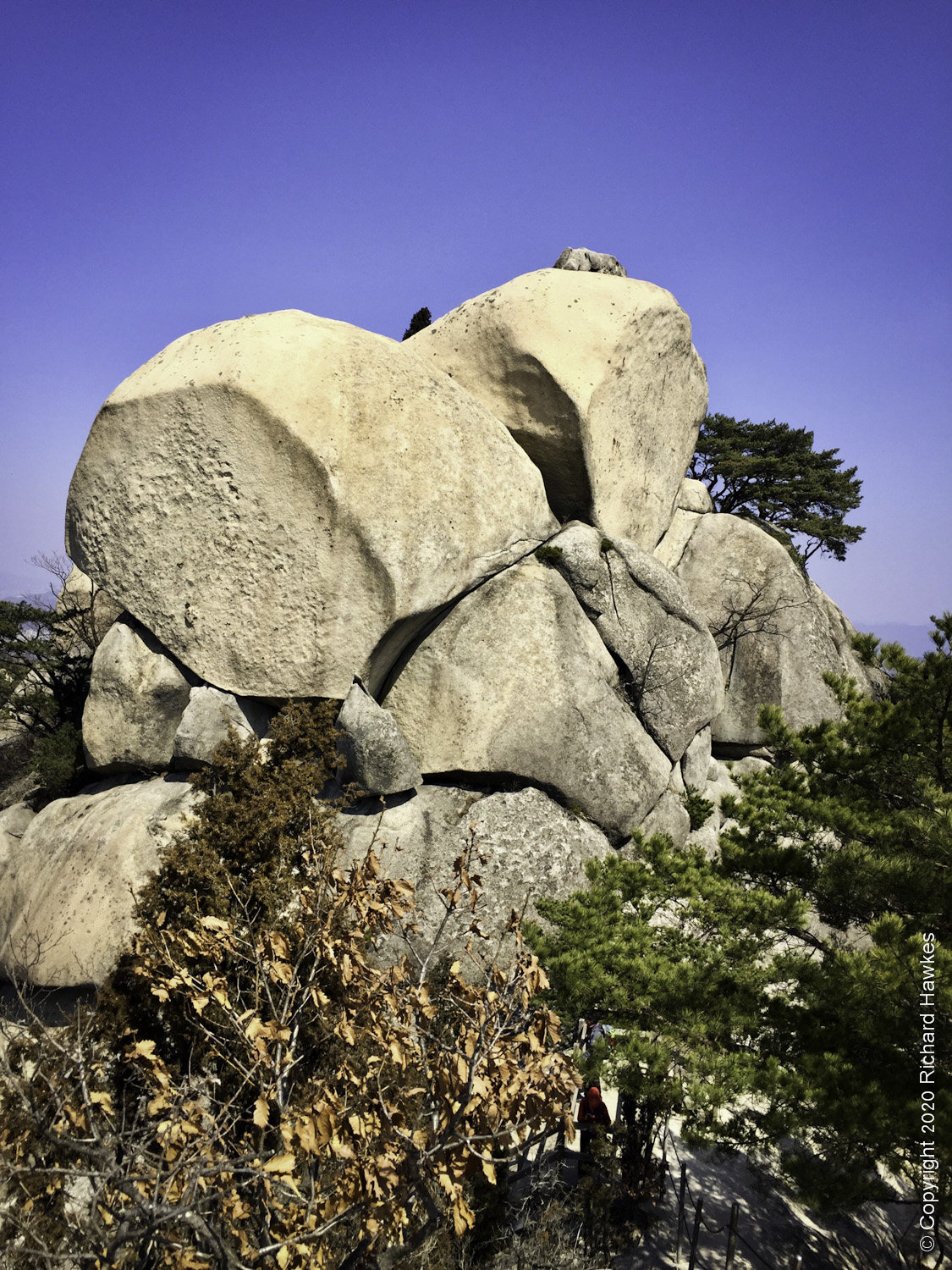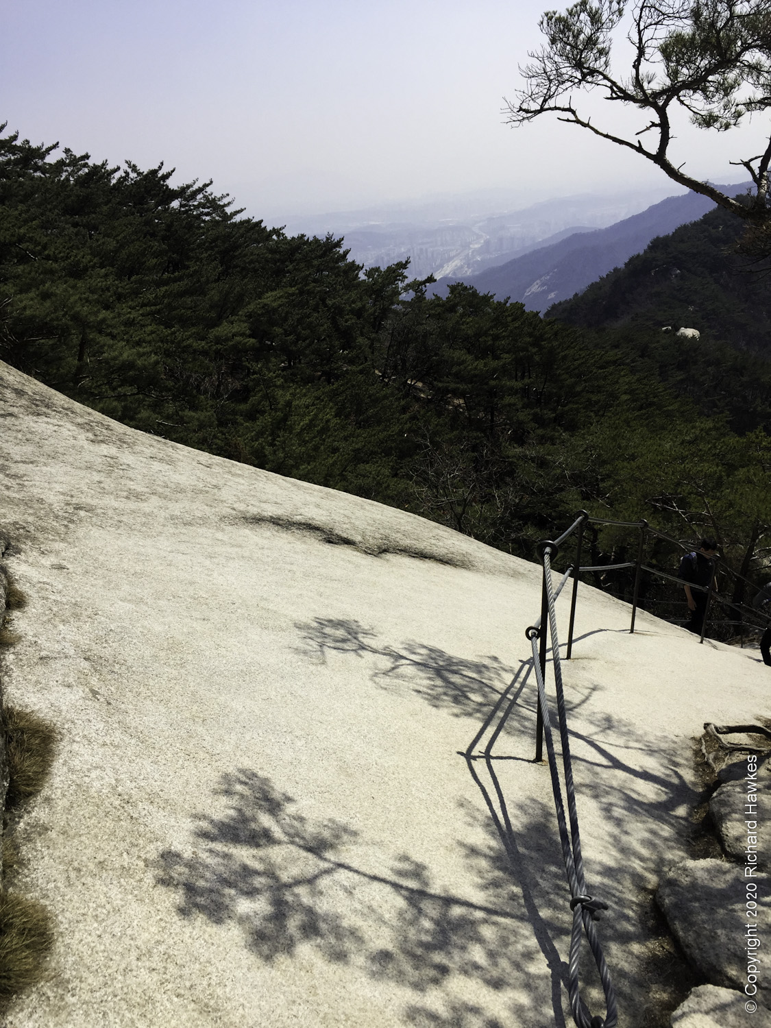 I managed to get past and kept heading east then north east. The weather was sunny, good temperature. The leaves were dry on the ground and no flowers blooming yet. There were a few middle-aged ladies picnicking on some rocks on the river. There wasn’t much water, if any, in the river today. I tried to stick to this trail, but at some point I veered left and went a less trodden way. and didn’t notice till later when I checked the map on my phone. Oh well, on wards. Unfortunately, this is usually the time I get into a pickle since not all trails are that easy. Soon, I was scrabbling on loose earth and had to double back a few times; the leaves on the ground made it hard to follow the most obvious route. I used the map app to make sure I was going somewhat in the right direction and ended up having to scramble around up some sketchy looking slopes and making decisions. I followed some bits of rope up tied to trees and realised these were places where I wouldn’t be going back down from! So onwards again. Finally I saw signs of life, some guide railings at one of the smaller preaks, and was relieved to have found the main trail heading north-south. Phew!! This was a rock called Chima Rock (치마바위정상) and was pretty spectacular though not many views from here. This would be my picnic spot, under a tree, and where I’d finally meet some other hikers!