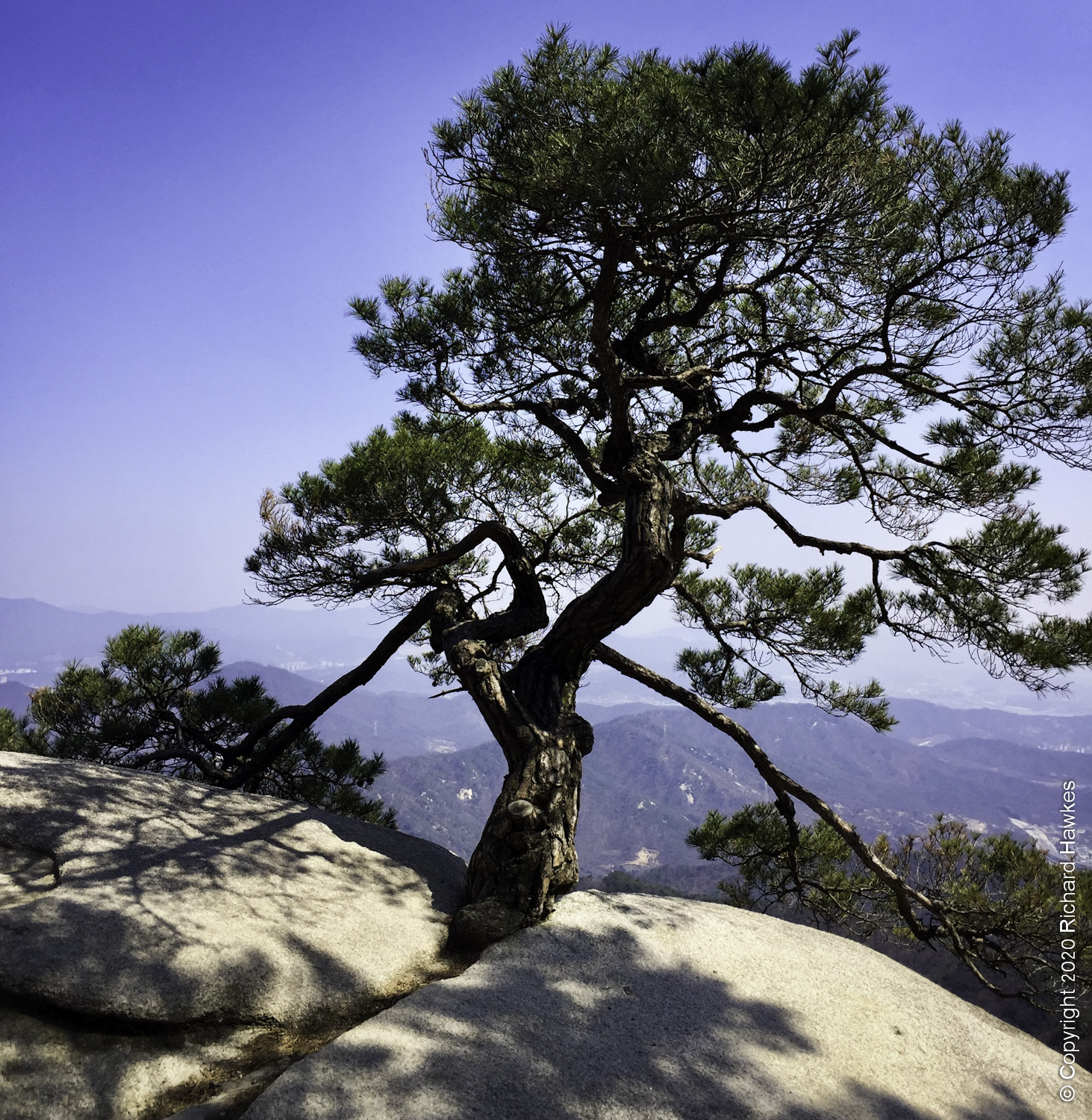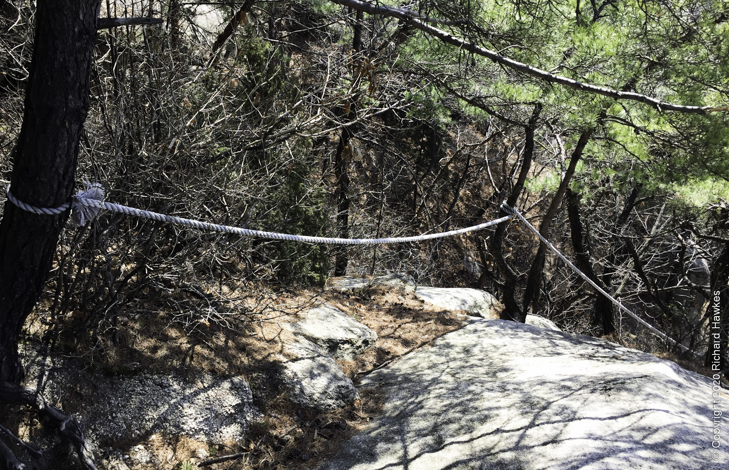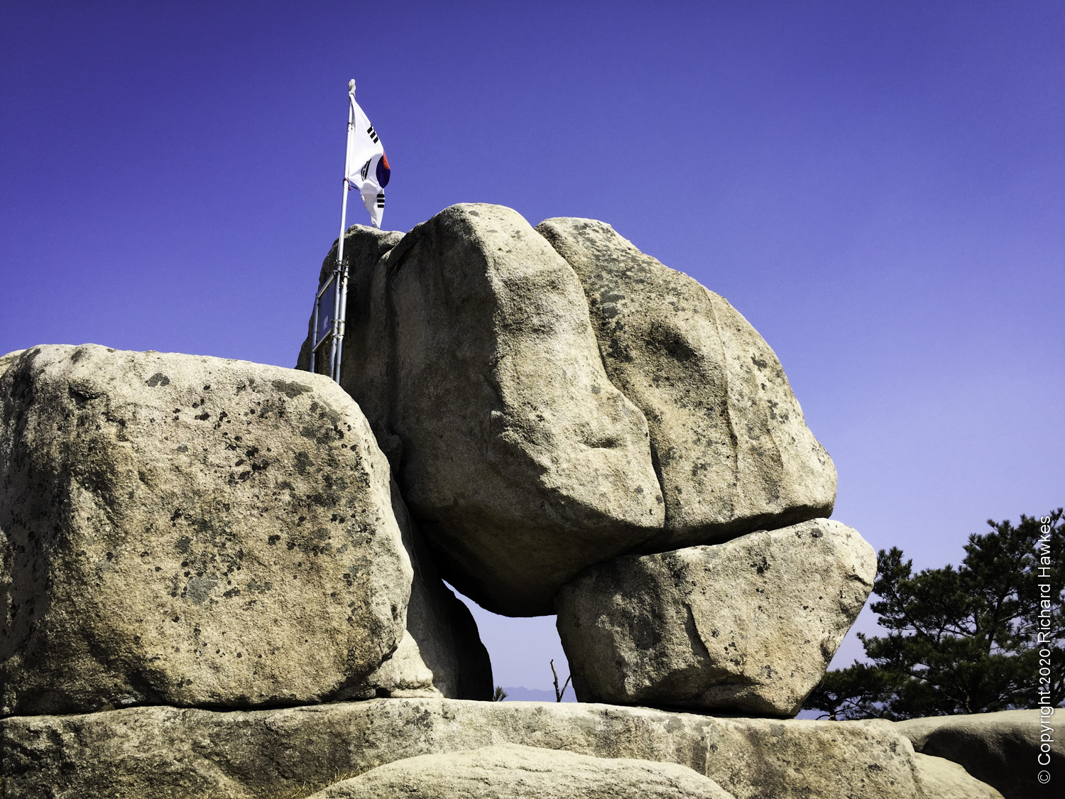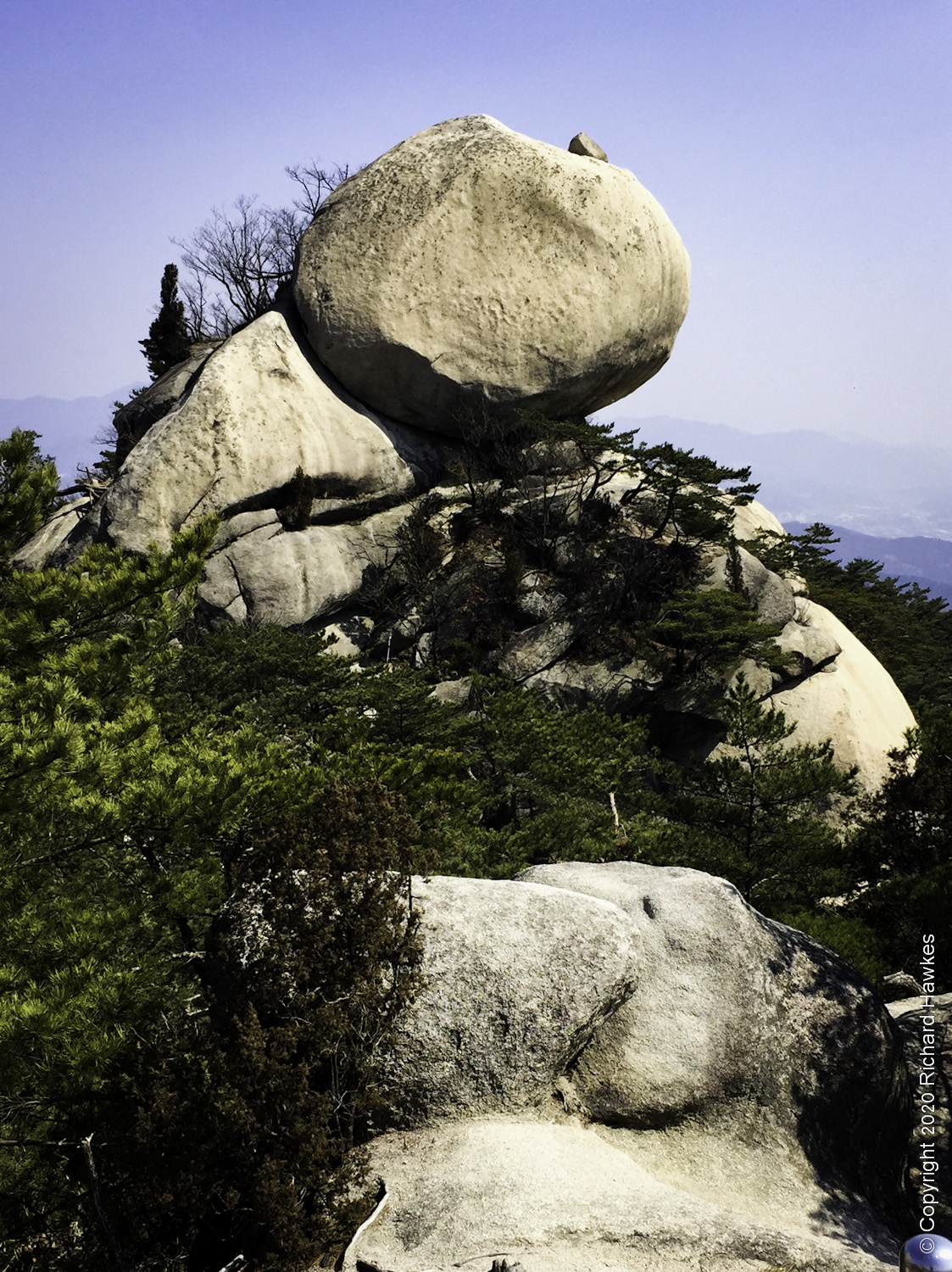 I managed to get past and kept heading east then north east. The weather was sunny, good temperature. The leaves were dry on the ground and no flowers blooming yet. There were a few middle-aged ladies picnicking on some rocks on the river. There wasn’t much water, if any, in the river today. I tried to stick to this trail, but at some point I veered left and went a less trodden way. and didn’t notice till later when I checked the map on my phone. Oh well, on wards. Unfortunately, this is usually the time I get into a pickle since not all trails are that easy. Soon, I was scrabbling on loose earth and had to double back a few times; the leaves on the ground made it hard to follow the most obvious route. I used the map app to make sure I was going somewhat in the right direction and ended up having to scramble around up some sketchy looking slopes and making decisions. I followed some bits of rope up tied to trees and realised these were places where I wouldn’t be going back down from! So onwards again. Finally I saw signs of life, some guide railings at one of the smaller preaks, and was relieved to have found the main trail heading north-south. Phew!! This was a rock called Chima Rock (치마바위정상) and was pretty spectacular though not many views from here. This would be my picnic spot, under a tree, and where I’d finally meet some other hikers!