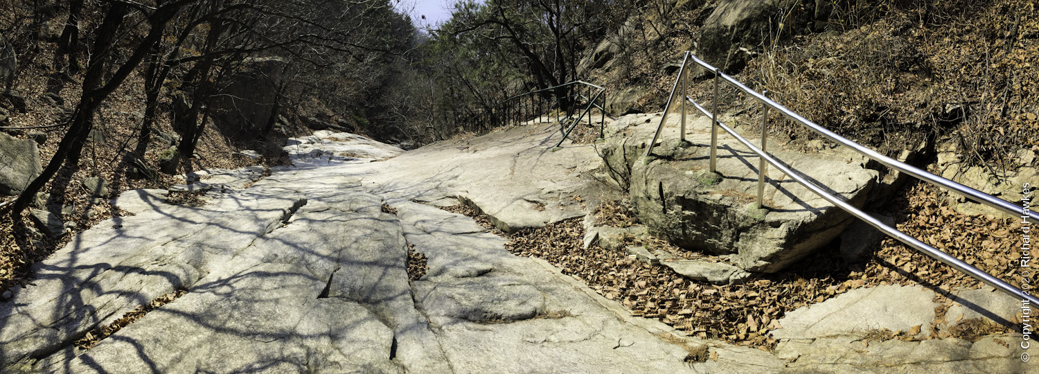 Getting to Suraksan Station, I left using Gate 1 and headed north a bit before turning east and heading up the road that forms the first part of the trail. There’s a wooden walkway and a lot of places to paddle in the stream in the summer months. Along the way, I passed a place I’d eaten at when I finished the hike at this end. Looked closed today though (coronavirus related? Lot’s of places aren’t opening at the moment…). I encountered three guys wearing red vests that appeared to be fire wardens; one guy was walking with his stick pointing straight out behind him, so I couldn’t really get past (thought he’d have my eye out) until the leader warned noticed and told him to keep it pointed down. Thanks.