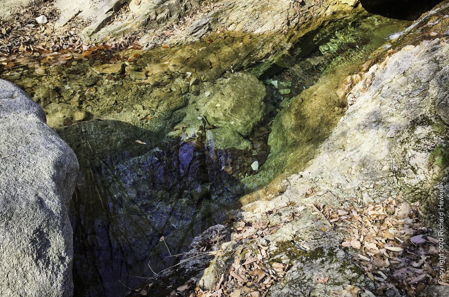 Time to head down. I went north a bit further till I got to a main junction of sorts, the headed west. Here’s where the real danger started; the dry leaves covering the rocks on the steep trail made going down very slow–a few times I ended up on my arse… Very annoying! In retrospect, heading up this way would be much more preferable. After a seemingly long slog down, following rocky dry river beds with really steep high sides, I came across some river bad with actual water. Check out the video.