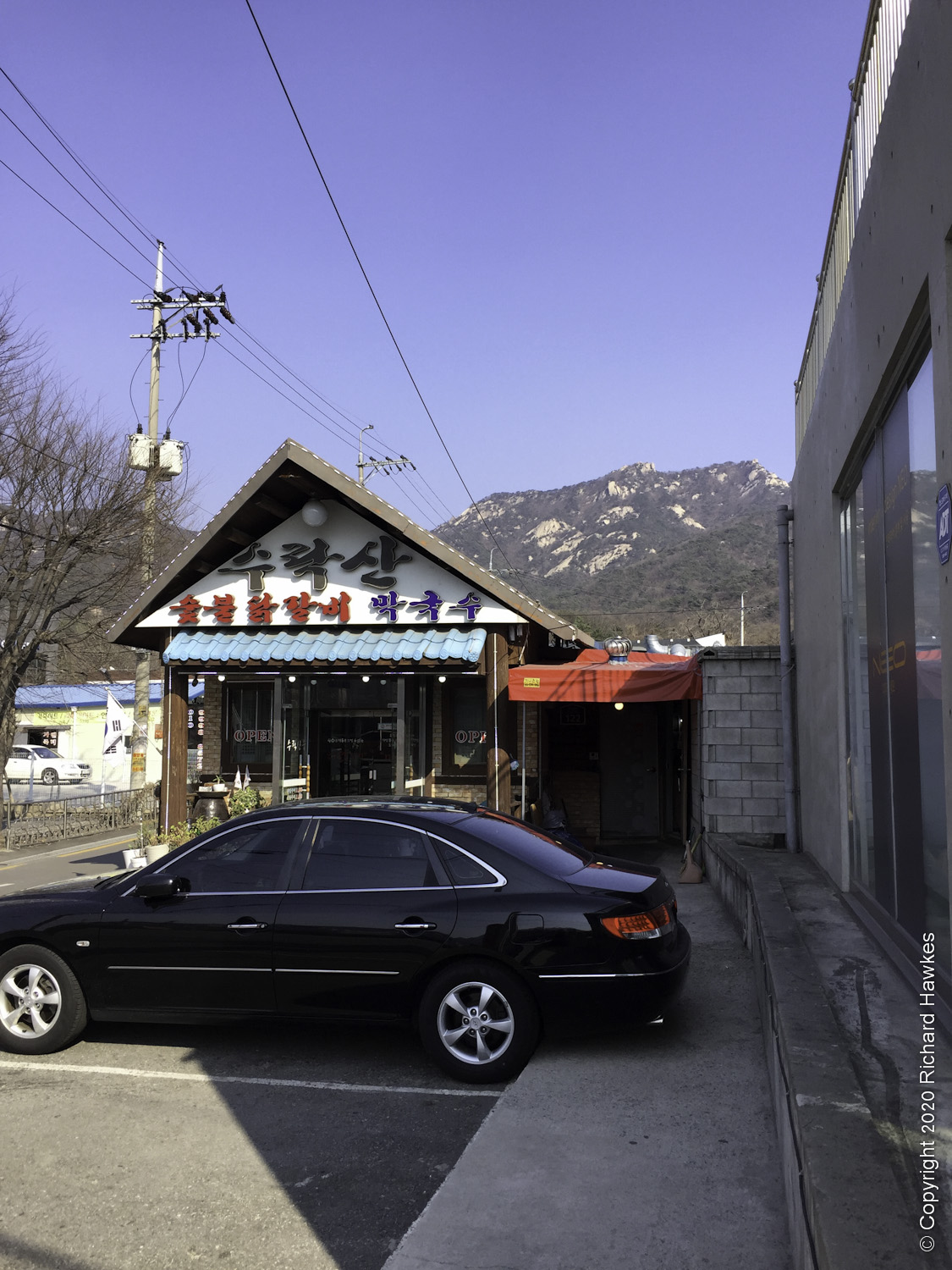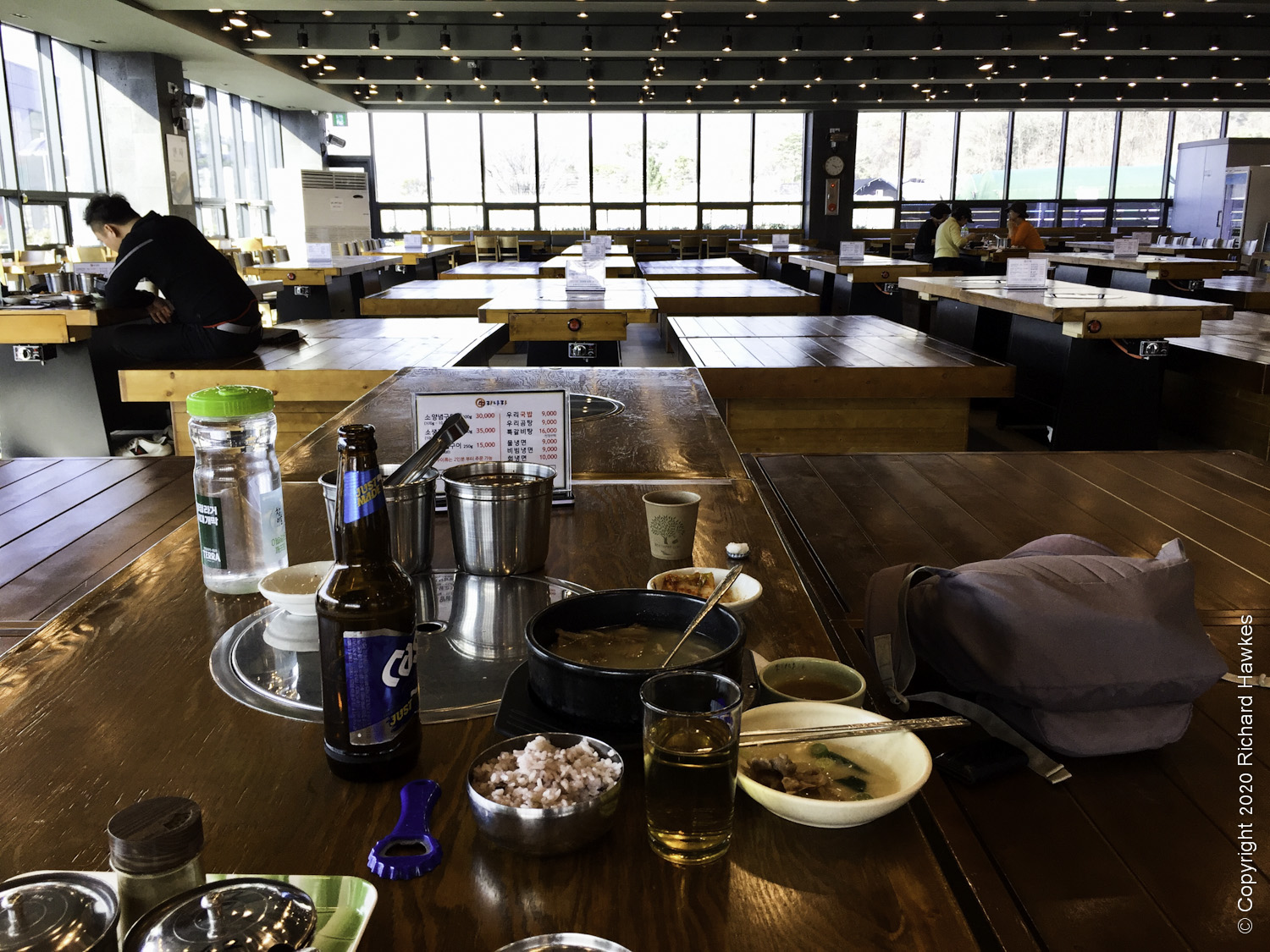 I got to signs of civilisation and walked past a temple then into a village area with lots of restaurants. They were 90% shut though. I waled past a favourite grilled chicked place I’d been to a few times with some friends on a few cycle trips (must post that up). I had a coffee then went to a masive super restaurant very nearby called 우리나라. The inside was massive and quite surreal looking since there were only three tables in use. The west facing window had a view of the beast that is Dobongsan, with the dinosaur back ridge. I had gomtang there, a kind of beef soup, and a well deserved beer.