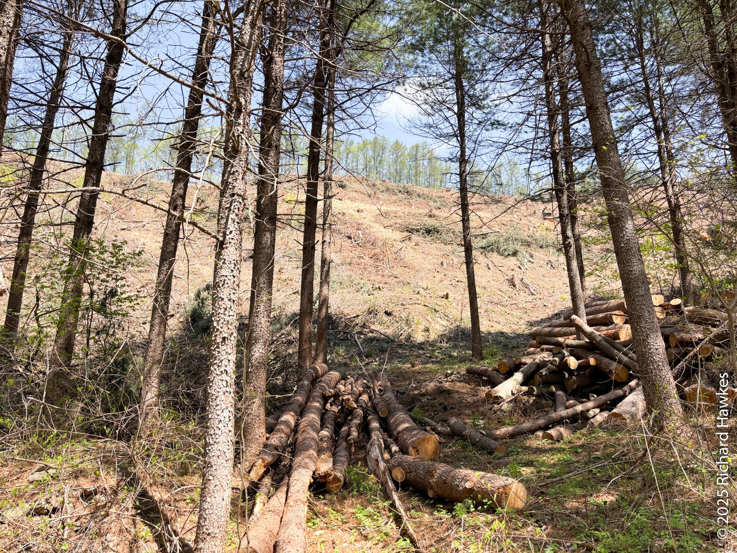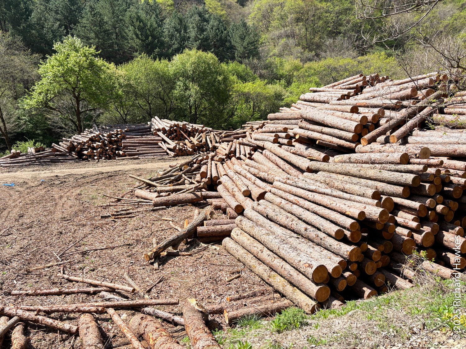 Much farther up the road, it turns to a dirt and rock track and you encounter the first of many water crossings. On the way were some people logging up a hill with some heavy equipment and I passed a log storage area and some stripped hills around. On this part of the trail there were a few views to the green hills up ahead.