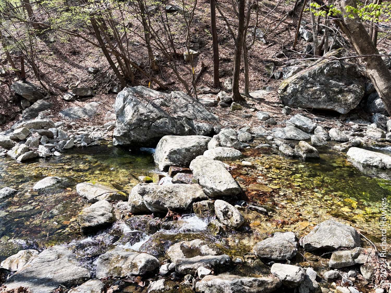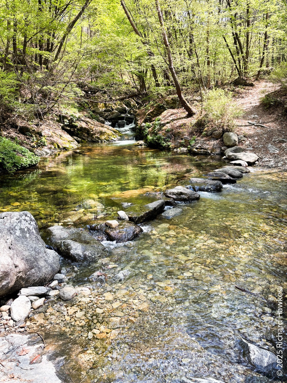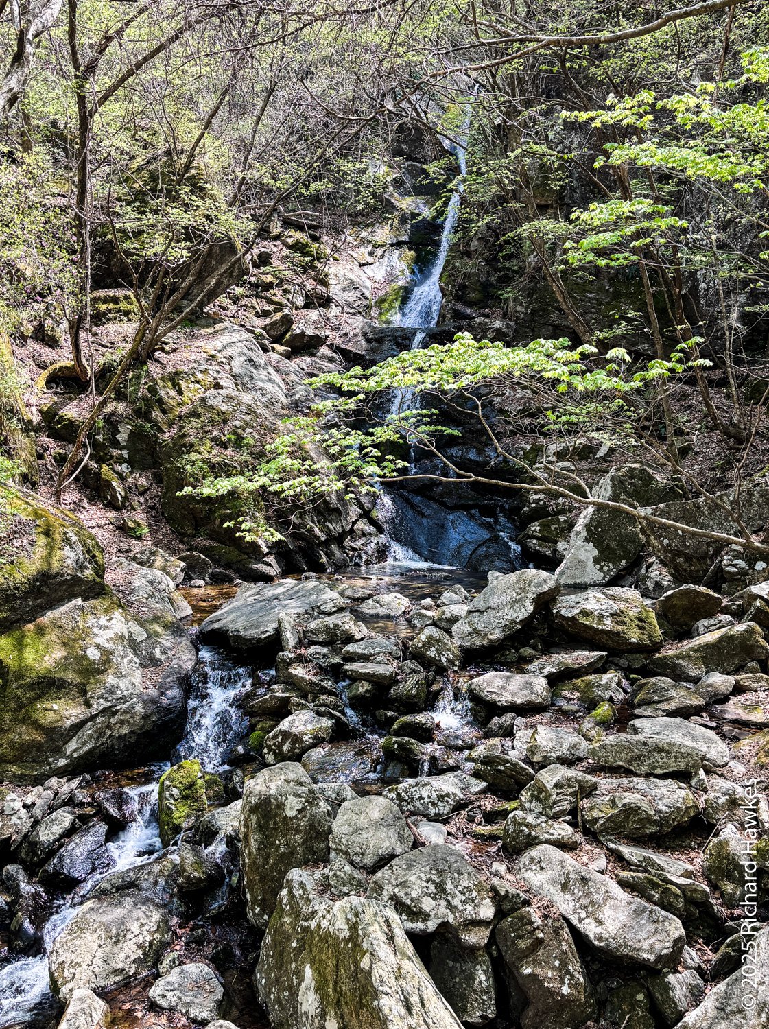In the end I had to cross the stream about seven of eight times; some were easy to get across with stepping stones, while others required a bit of creative scrambling to avoid getting wet feet. In all cases, the streams were lovely and inviting and all nice spots to sit and take a break. One of the earlier ones was next to a pretty tall waterfall and had its own observation deck.