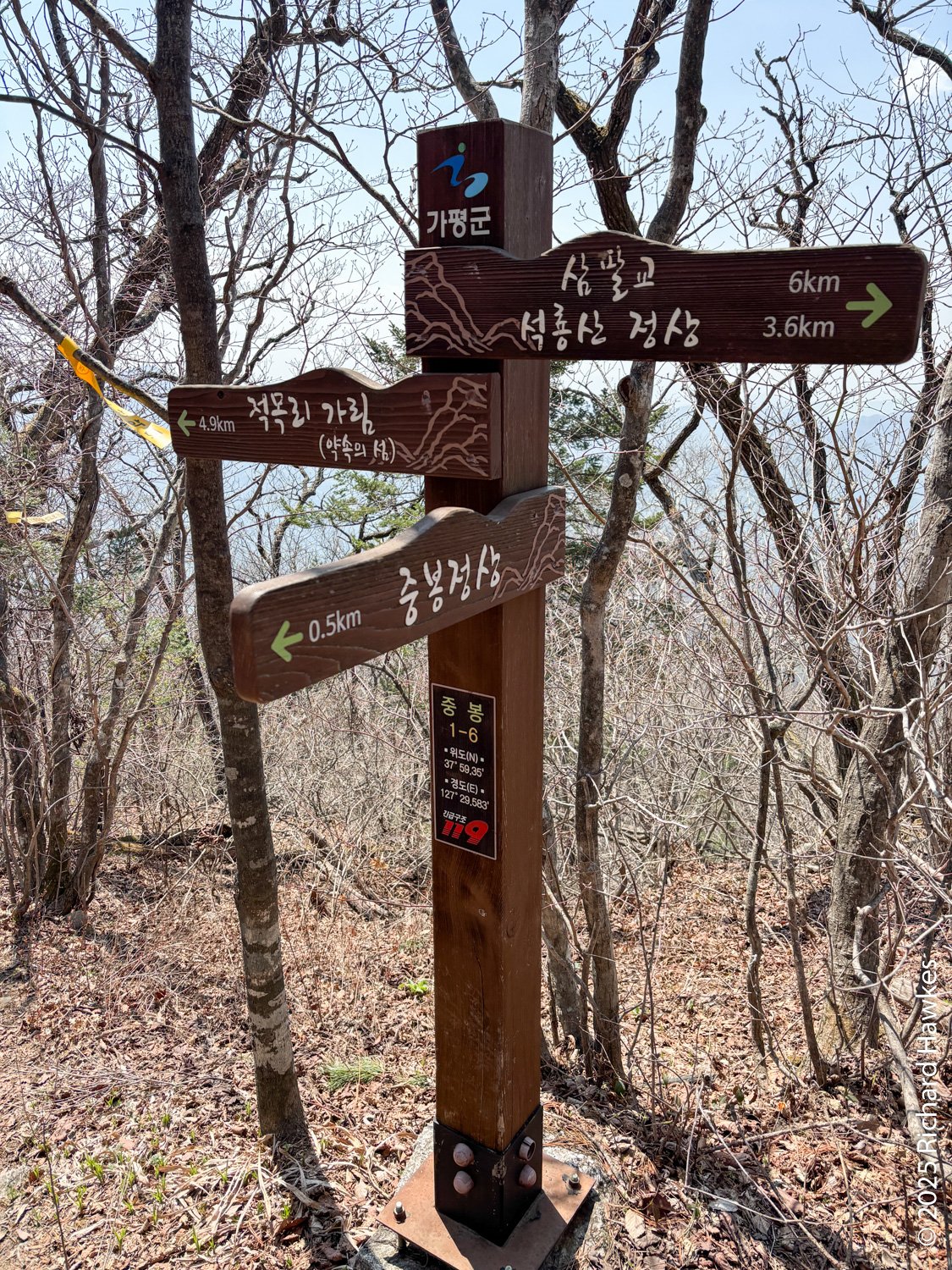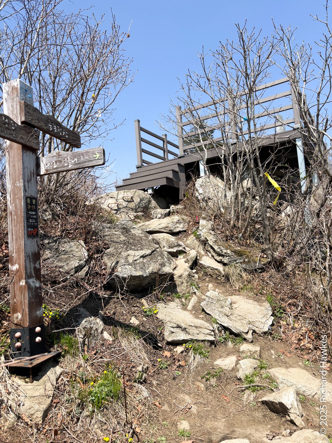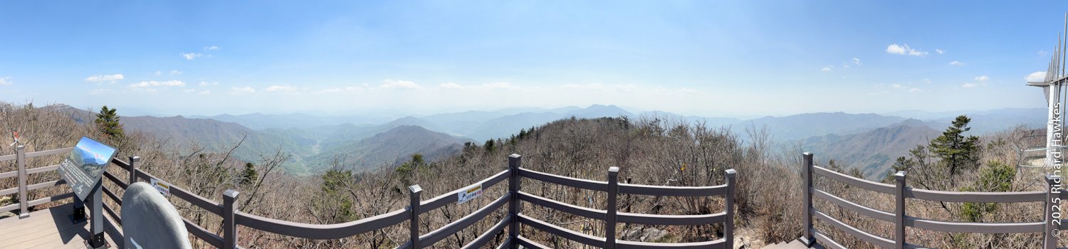 At the top, you continue north along a short forested ridge and then you get to the view point at Jungbong. The view point is a raised wooden deck with a stone marker on it. FYI, this isn’t the highest point of Hwaaksan; that peak is being used as a military outpost so this decking spot is as far and as high as you can go on this mountain (for now). Even though I had a 360 degree view, the hazy sky meant poor visibility which was a shame considering the effort I’d put in getting there! It was 13:50 when I got to the view point so I’d been hiking for 3 h 40 minutes! Also FYI, there is another trail heading east from there and it’s the route you take if you drive most of the way up from the other side. On a clearer day, I might do that. On the east side is a parking area which is apparently a good stargazing spot, so if I find myself staying out in this area again, I might check it out.