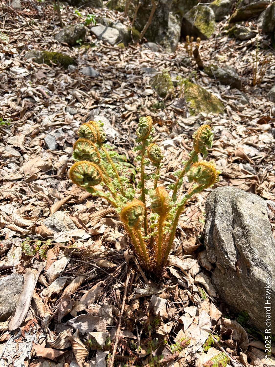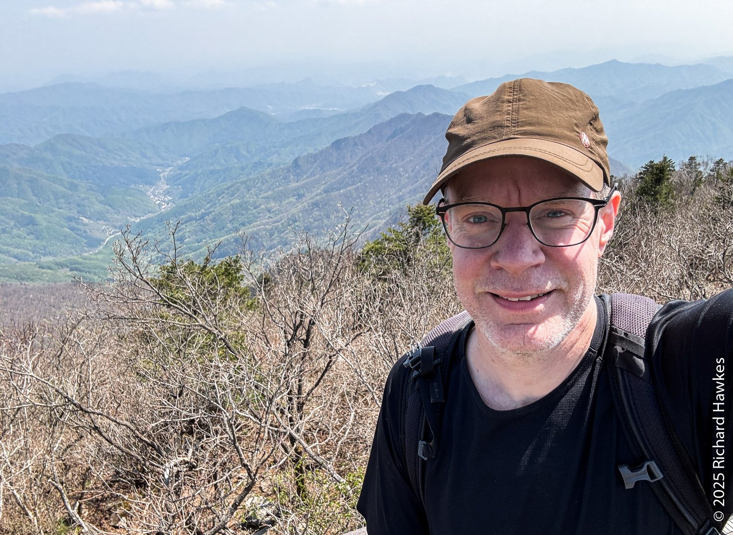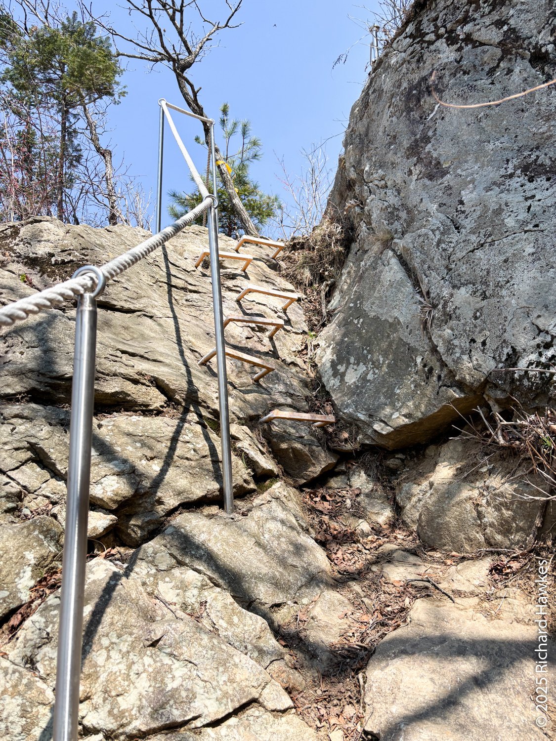 At the top, you continue north along a short forested ridge and then you get to the view point at Jungbong. The view point is a raised wooden deck with a stone marker on it. FYI, this isn’t the highest point of Hwaaksan; that peak is being used as a military outpost so this decking spot is as far and as high as you can go on this mountain (for now). Even though I had a 360 degree view, the hazy sky meant poor visibility which was a shame considering the effort I’d put in getting there! It was 13:50 when I got to the view point so I’d been hiking for 3 h 40 minutes! Also FYI, there is another trail heading east from there and it’s the route you take if you drive most of the way up from the other side. On a clearer day, I might do that. On the east side is a parking area which is apparently a good stargazing spot, so if I find myself staying out in this area again, I might check it out.