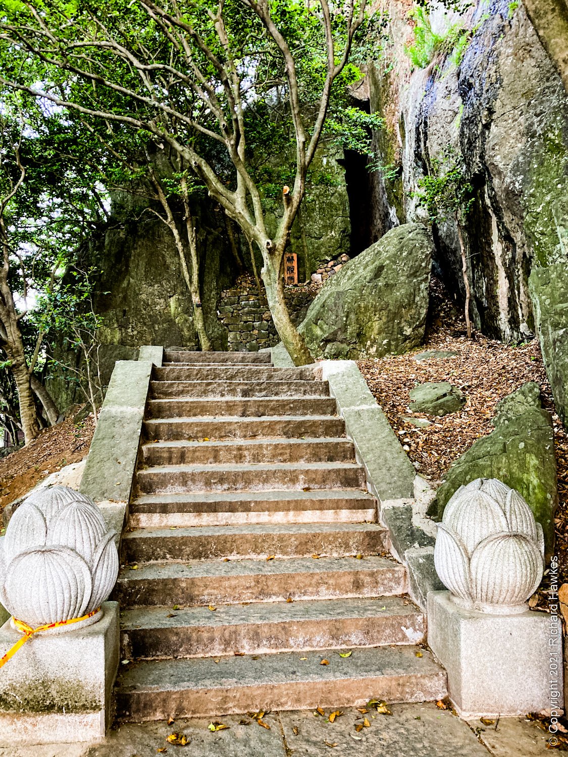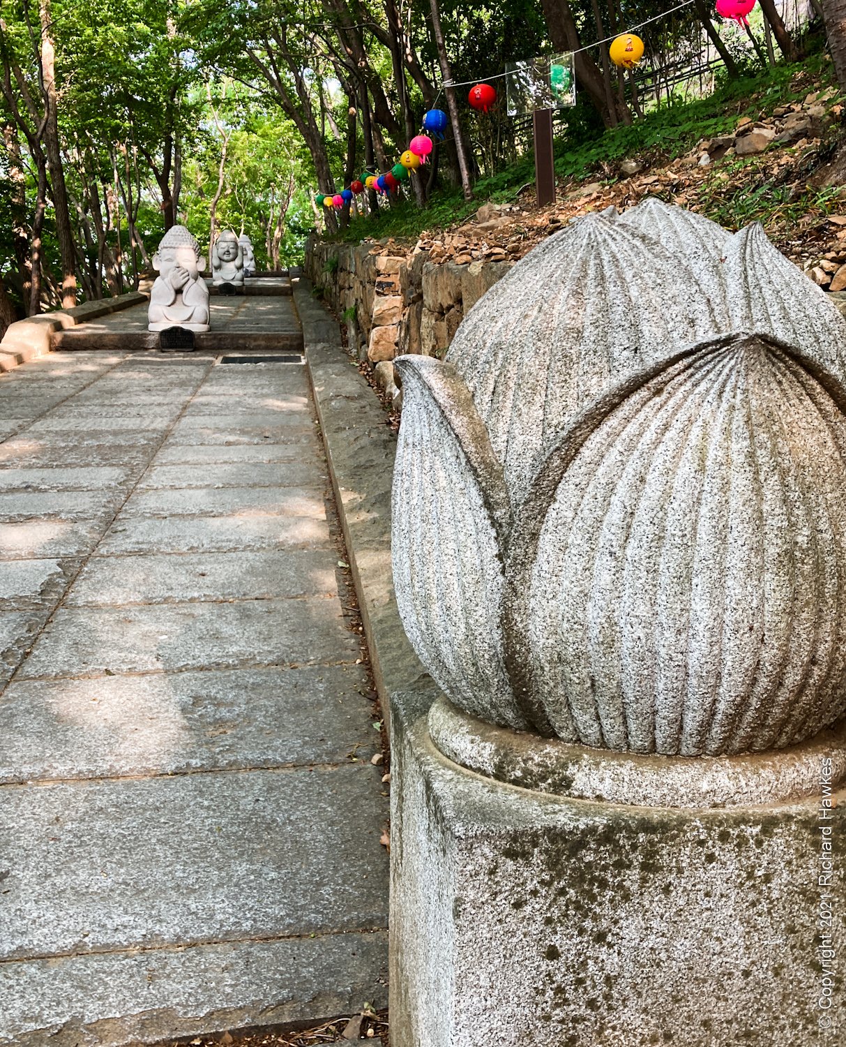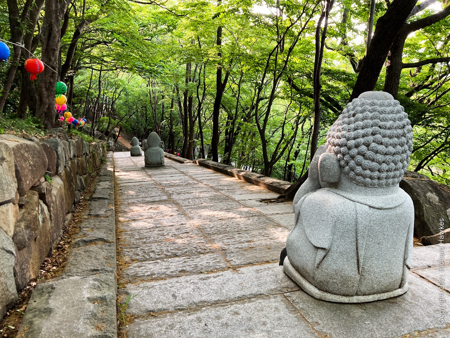 The actual temple start with a path and steps up through a forest. Then it’s a left turn along a path featuring see-no, hear-no, speak-no evil Buddha statues. This is all before the main entrance.