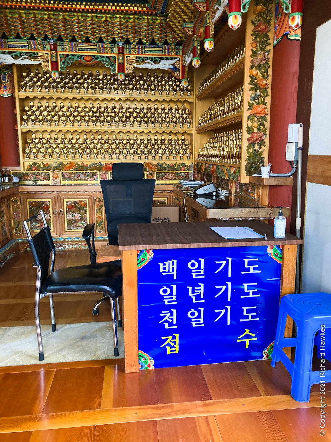 Then we got to the first section of temple buildings. They are on a terrace overlooking the sea. It seems like there’s a communal seating area, perhaps where the monks eat. And a very business-like area where I guess all the donations come in! Its got to take some cash to keep this place looking as good as it does.